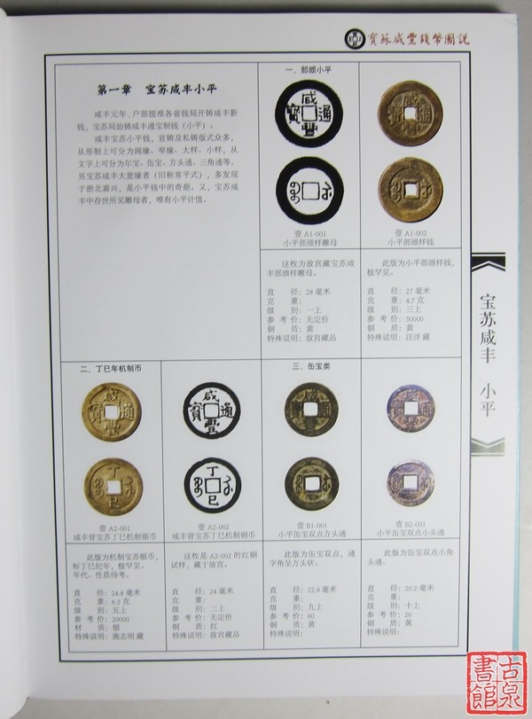 全书共分为小平、当五、当十、当二十、当三十、当五十、当百、当五百、当千,九大部分,主要介绍已知的各式样钱及行用钱的版别、价值,在各大部分最后摘选了一部分刻花及一些已确认的私版做出简单的介绍。