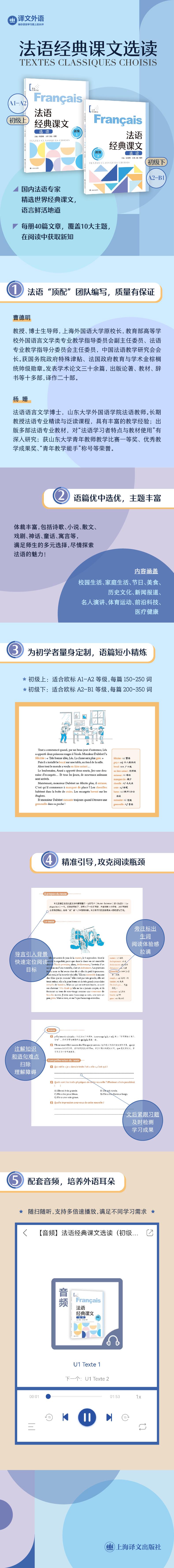 "【编辑推荐】: 1. 《法语经典课文选读》——法语“顶配”团队编写,质量有保证 2. 《法语经典课文选读》——语篇优中选优 从数千篇法语文章中遴选经典选段,内容贴近法语国家社会生活,语言地道、原汁原味,各个级别都符合欧洲语言学习标准。 3. 《法语经典课文选读》——主题阅读,题材丰富 主题涉及自然知识、历史文化、家庭与美食、经济社会等,让学生在阅读中获取新知。 4. 《法语经典课文选读》——丰富阅读文本 每册40篇文章,体裁丰富,诗歌、小说、散文、戏剧等,满足教师和学生的多元选择。 5. 《法语经典课文选读》——注释恰当精准 每篇文章均有生词和难点注释,帮助学生扫清阅读障碍,提高阅读能力。 6. 《法语经典课文选读》——搭配练习 每篇文章均有练习,既学既练,检验阅读效果。适合课堂使用或自学使用。所有练习均有答案。 7. 《法语经典课文选读》——标准外语诵读 全书课文配朗读音频,随扫随听,培养外语耳朵。"