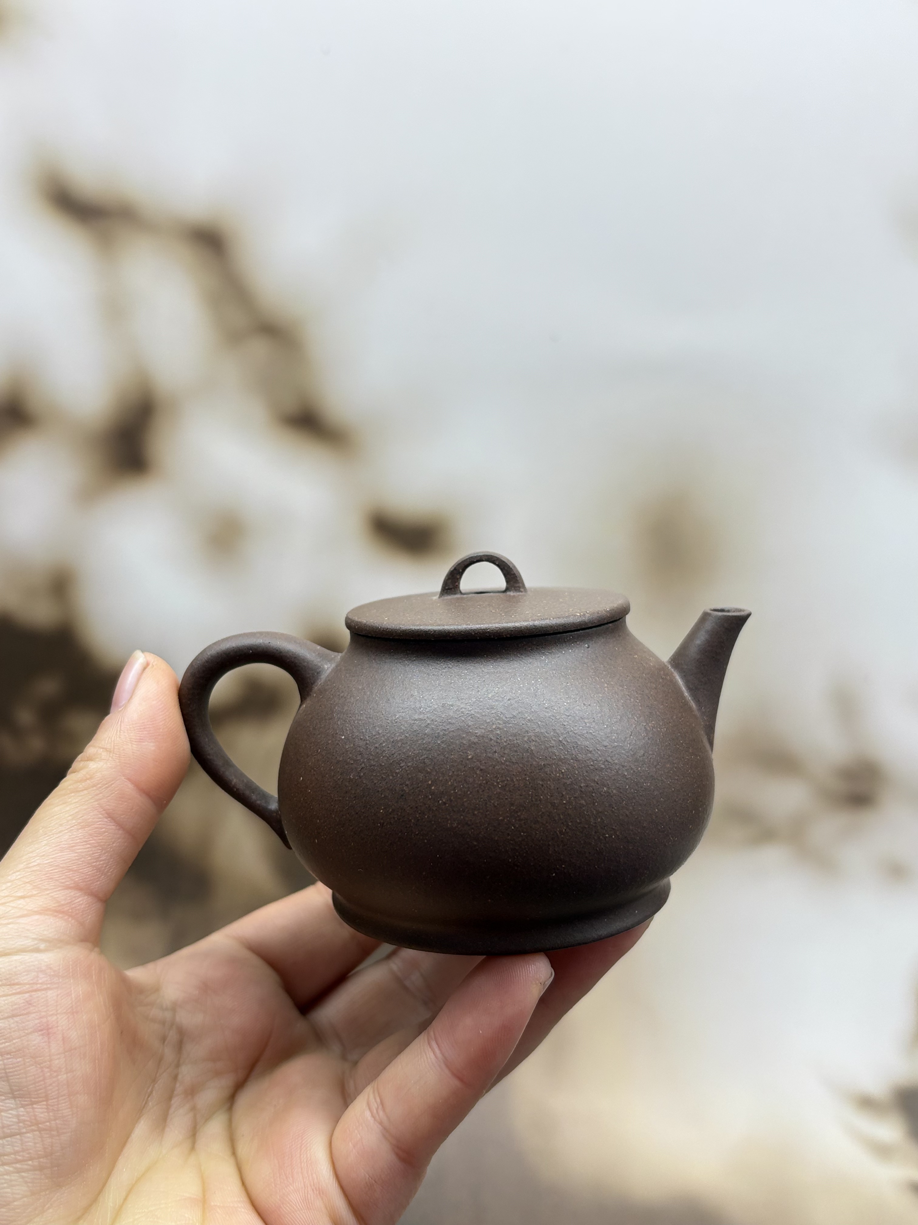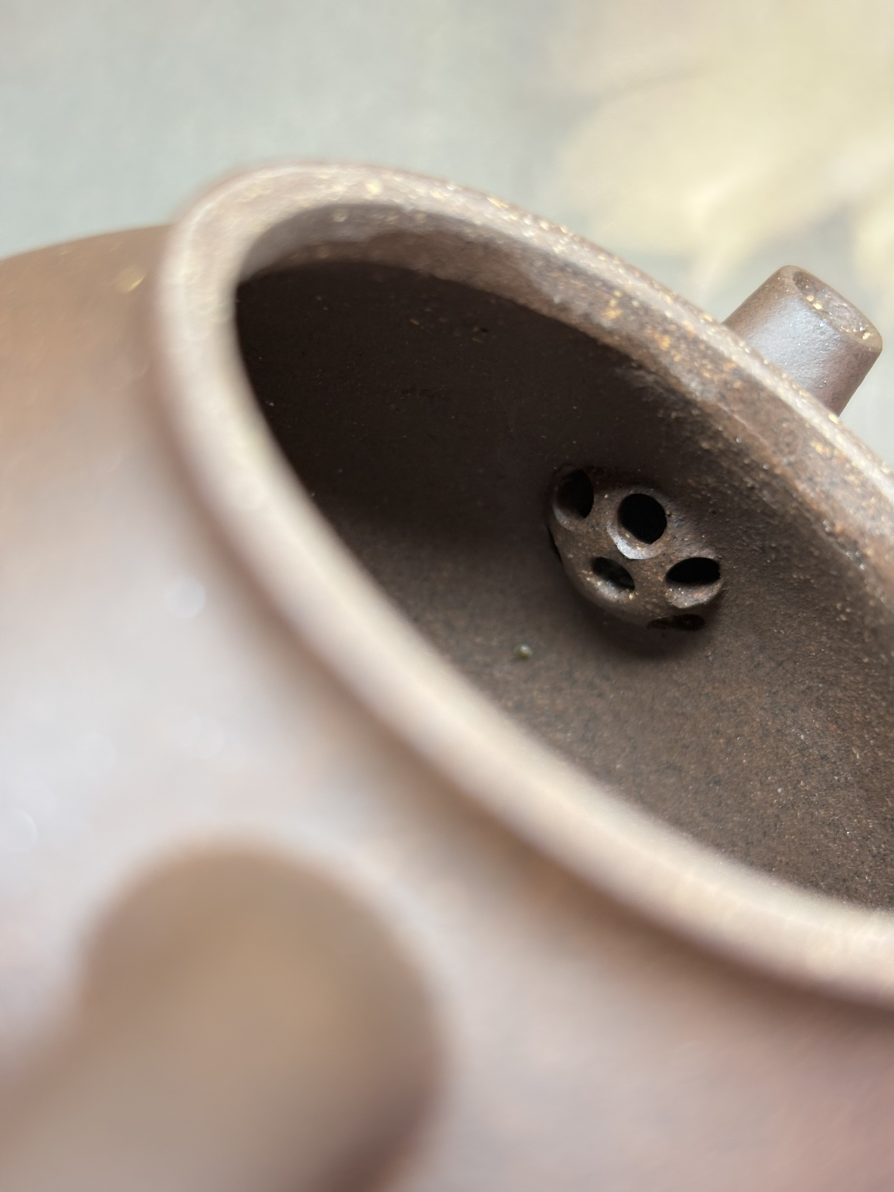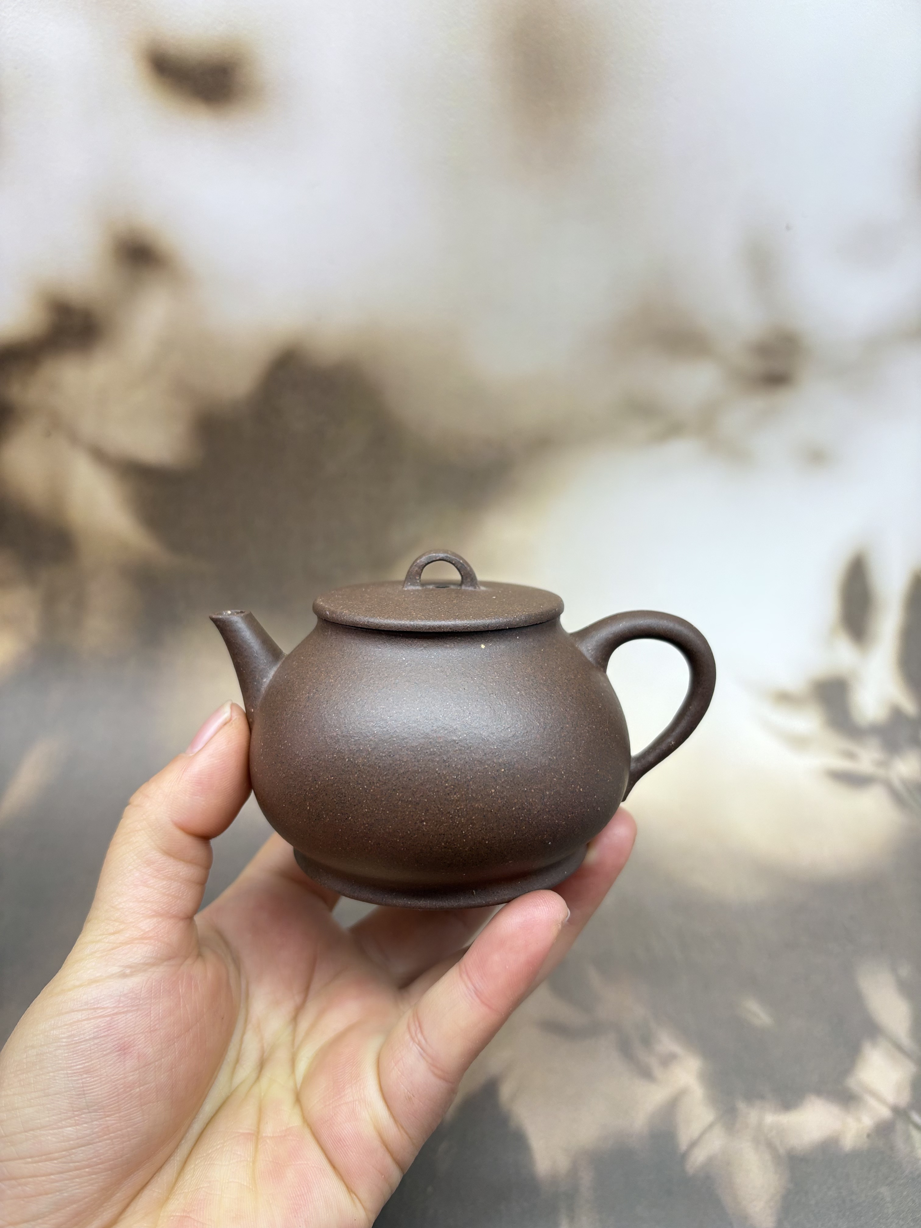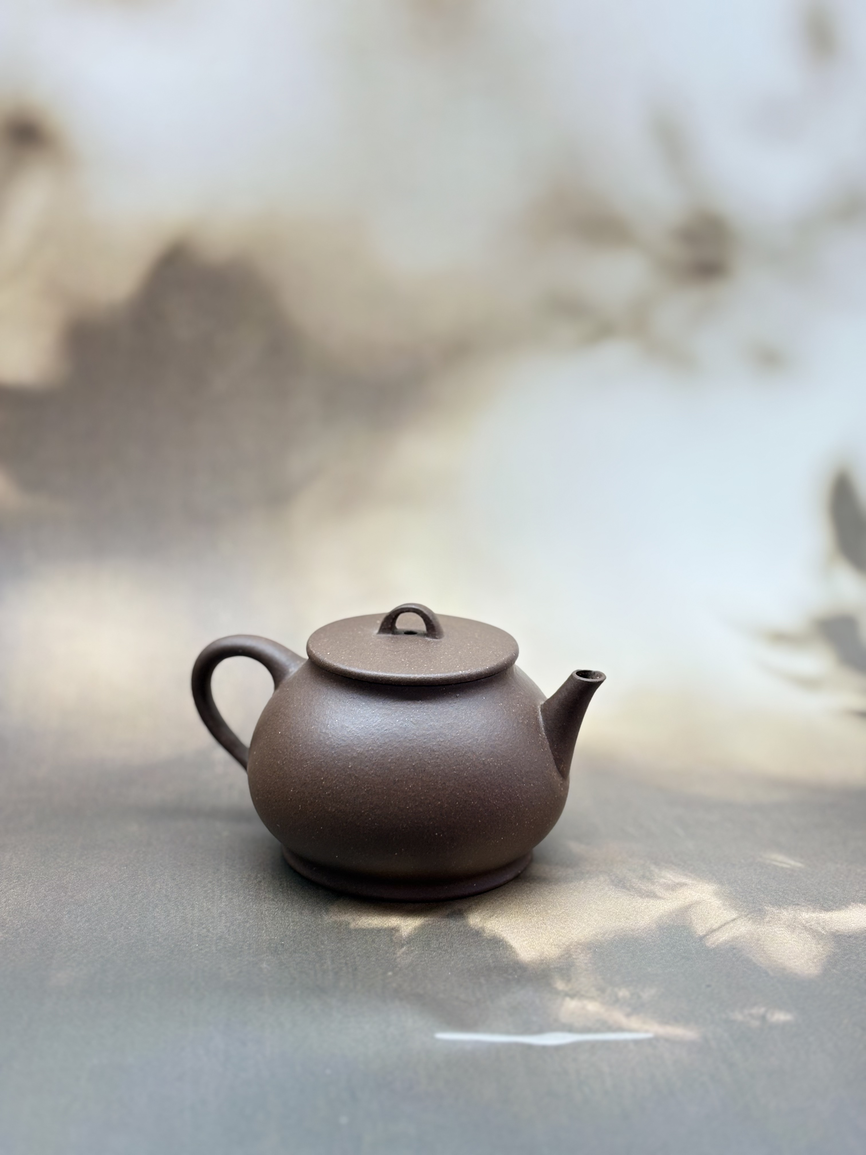此壶以紫泥为胎,壶身采用筑金的装饰技法,使得壶身在古朴中透露出华丽的气息。此壶造型独特,巧妙地将传统与现代元素相结合,使得壶身线条流畅而优雅,整体造型既古朴又不失时尚感。