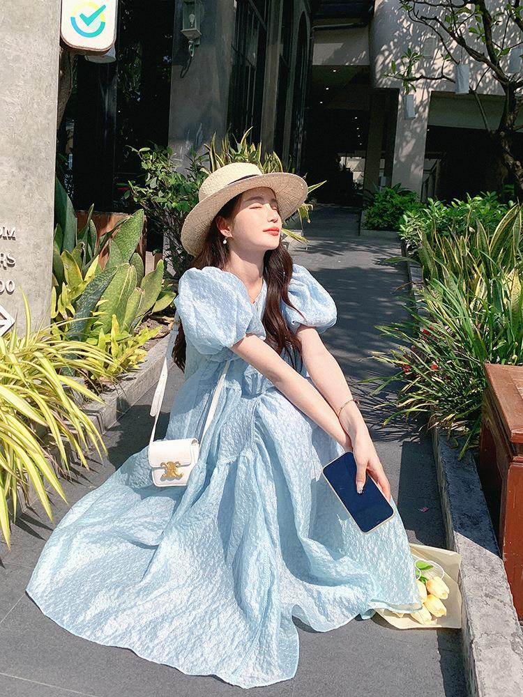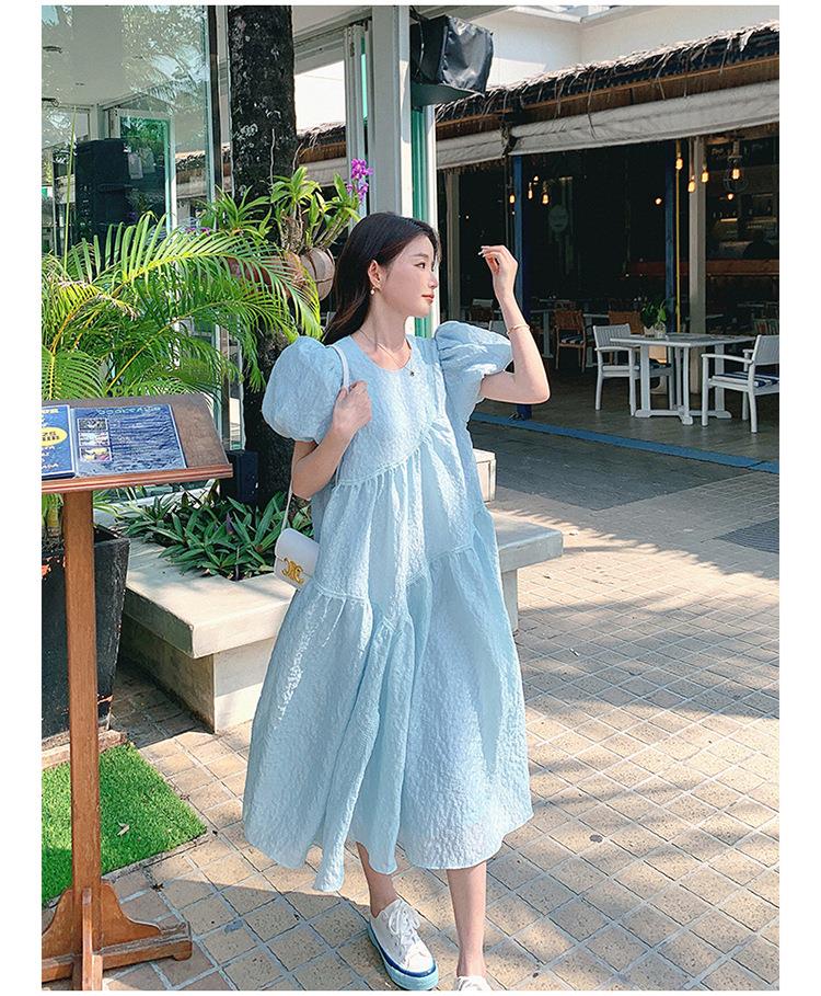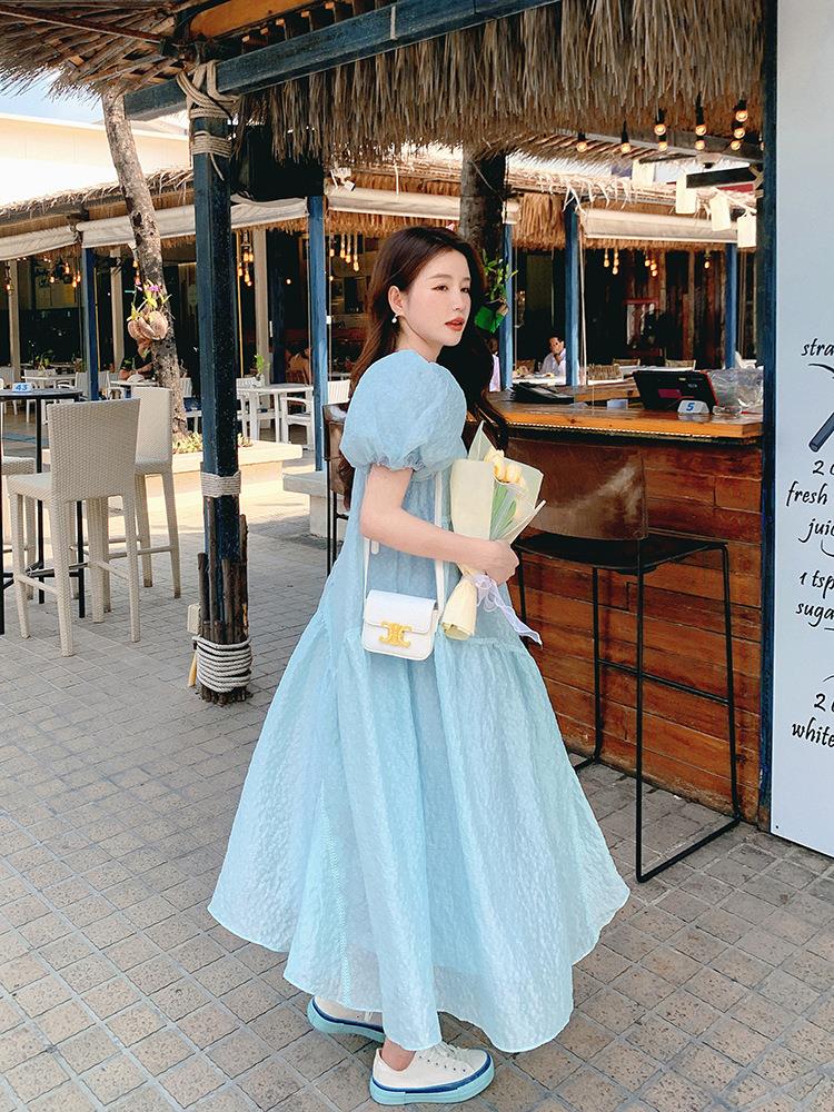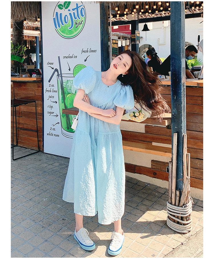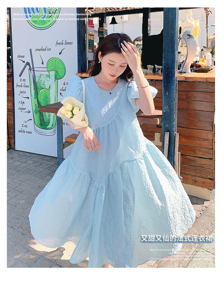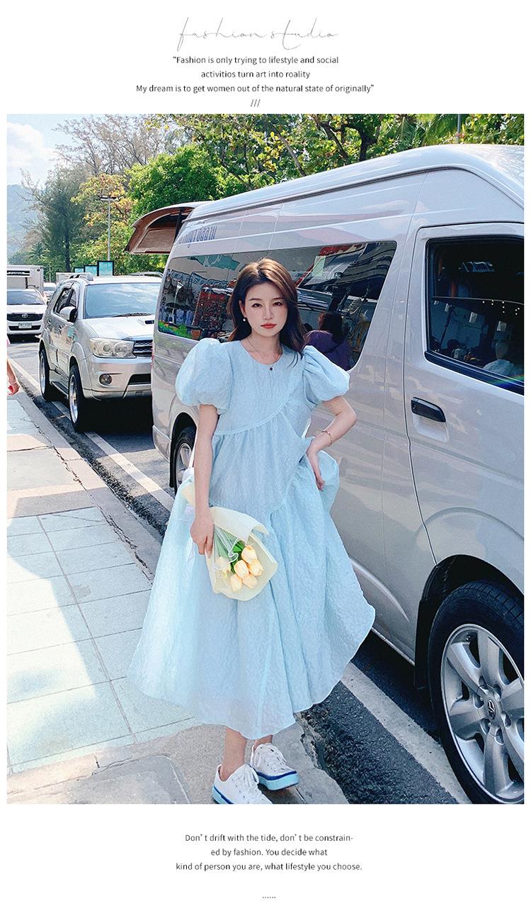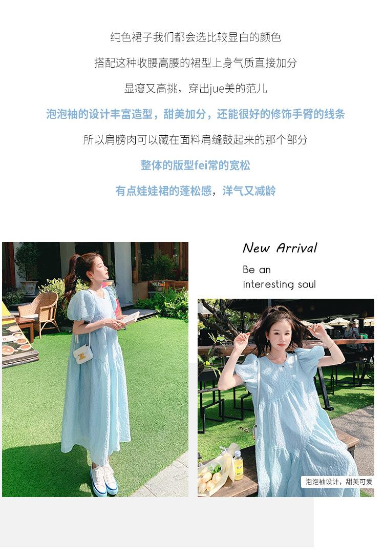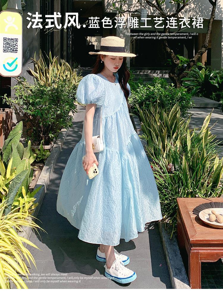 实拍浮雕提花蓬蓬公主裙浅蓝色法式泡泡袖高腰显瘦减龄圆领连衣裙