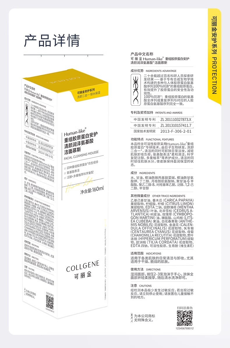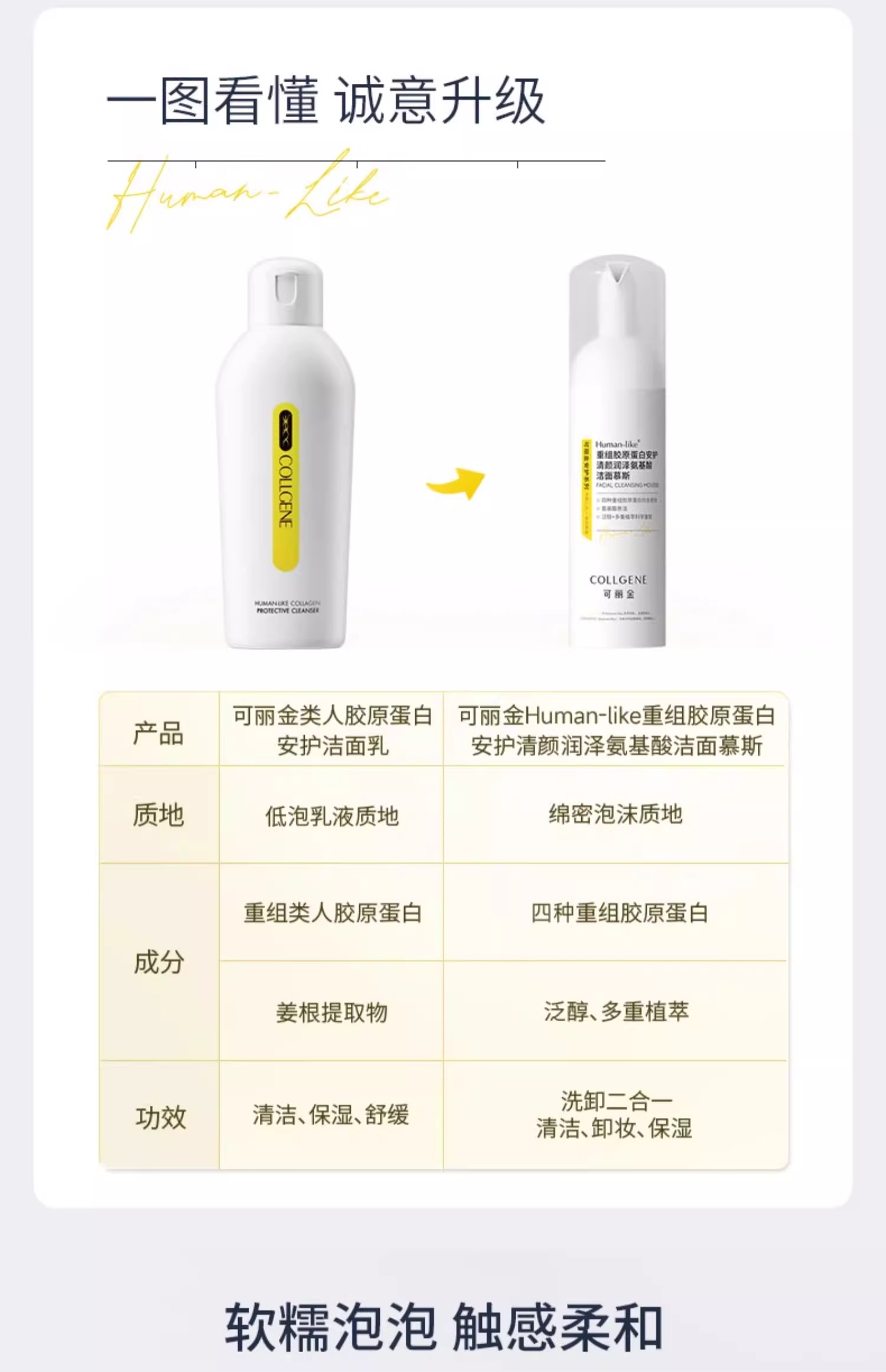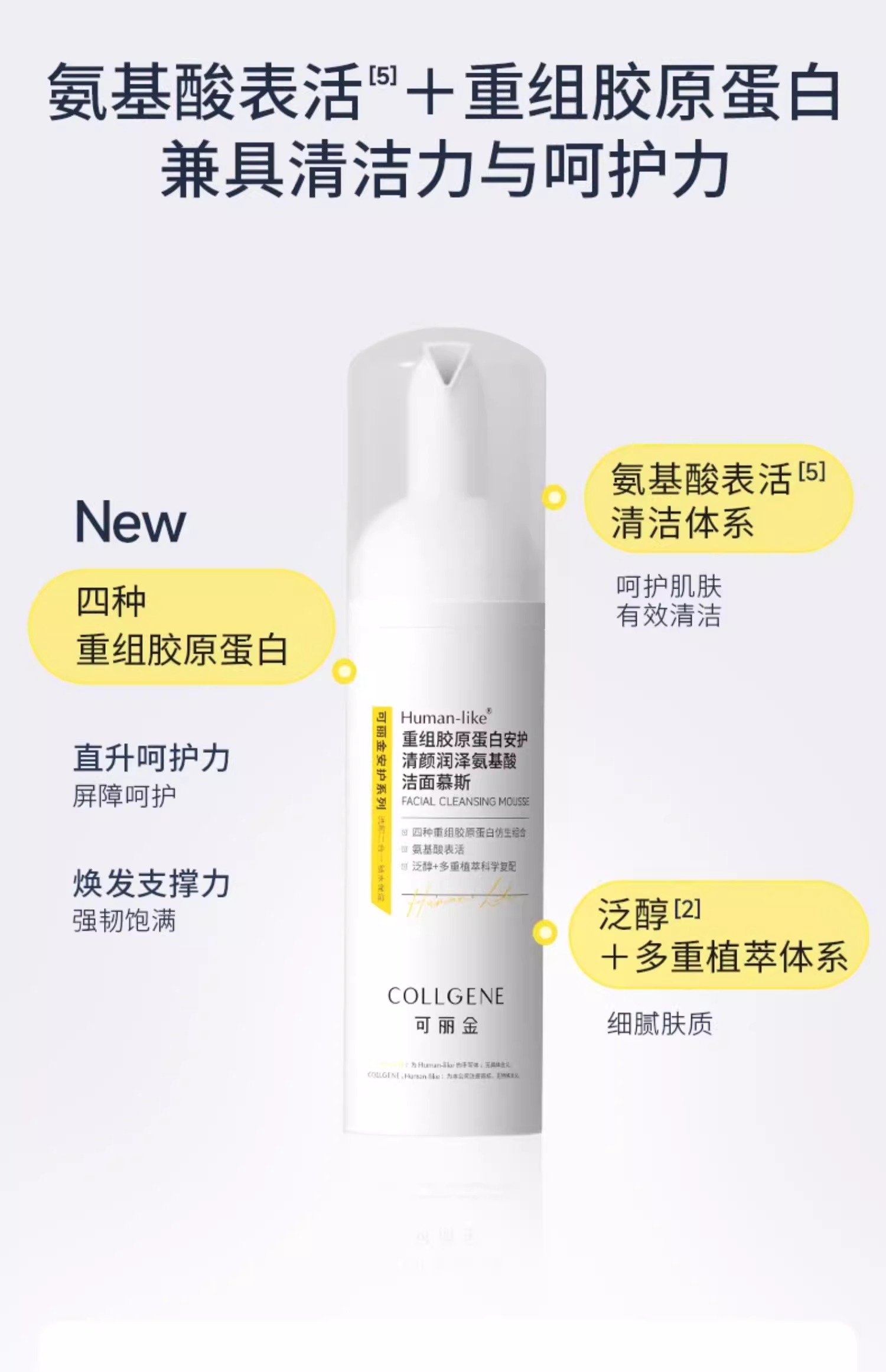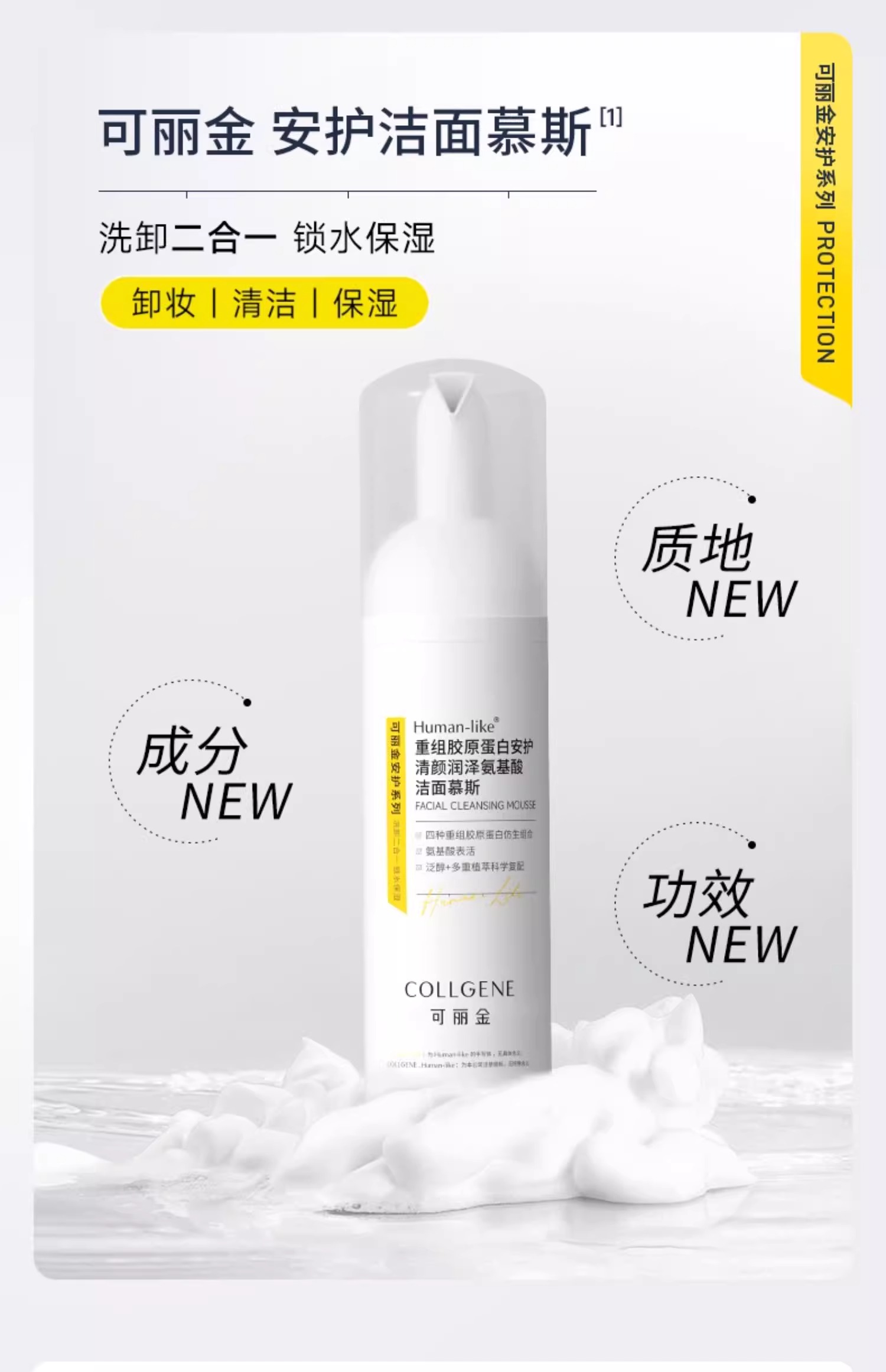 【可丽金Human-like重组胶原蛋白安护清颜润泽氨基酸洁面慕斯】160ml/瓶