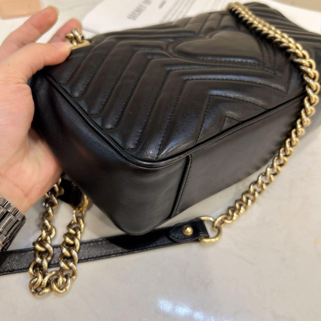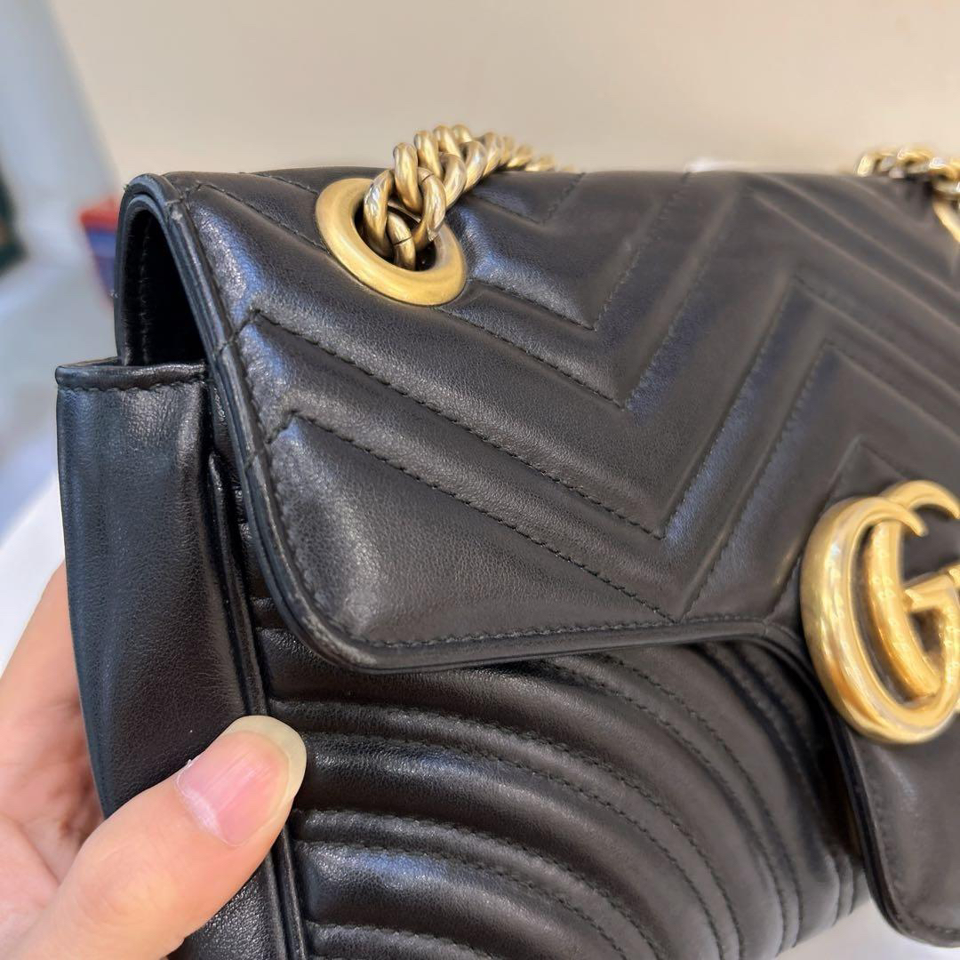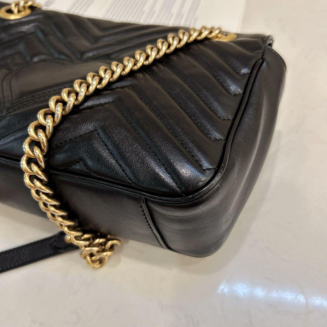 【商品详情】正品二手 Gucci 双g 马蒙 中号 牛皮 黑金 斜挎包 👝 93新 25×15 。五金及链条明显使用氧化 金属logo有磕碰 搭扣处和边角正常使用磨损 百搭经典款