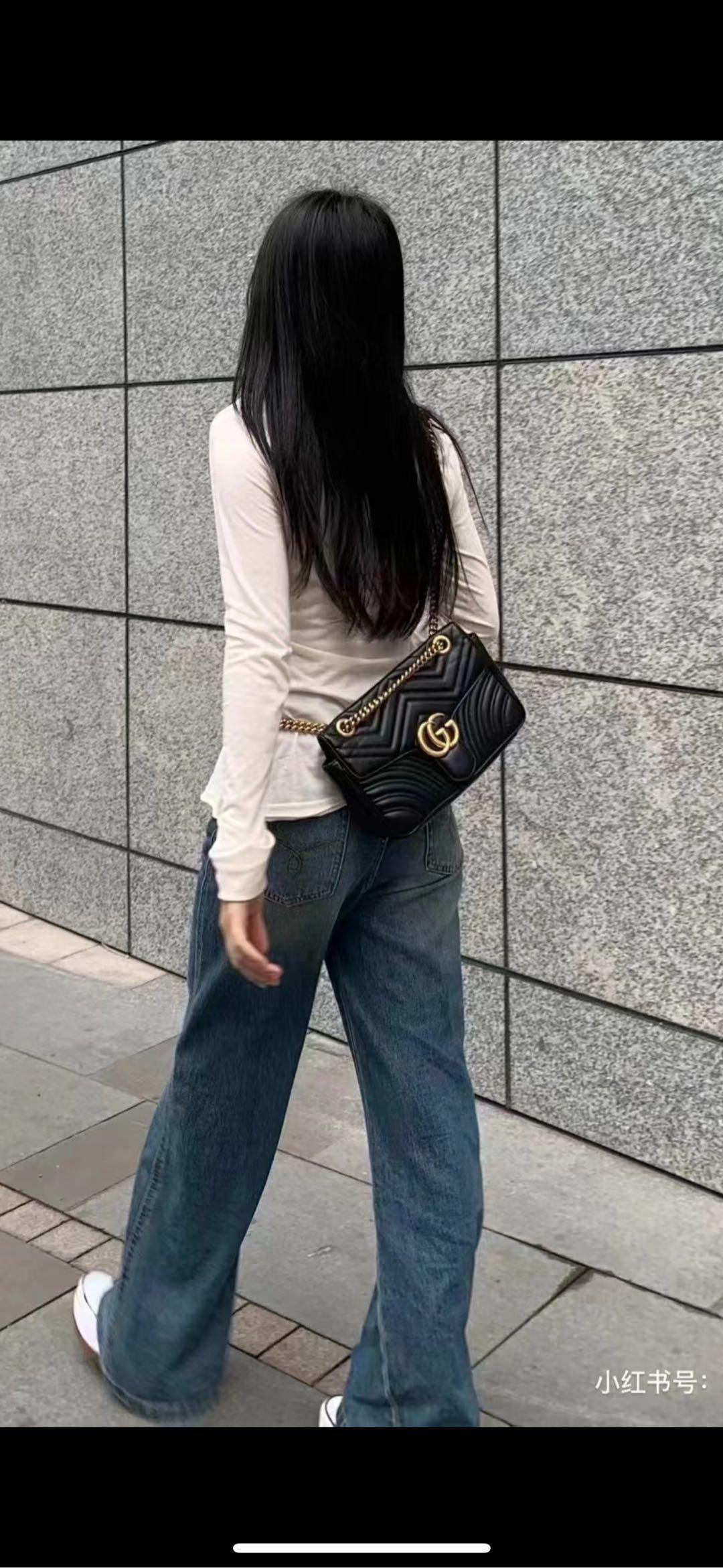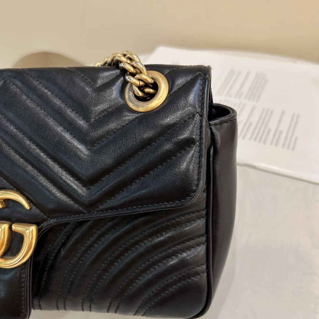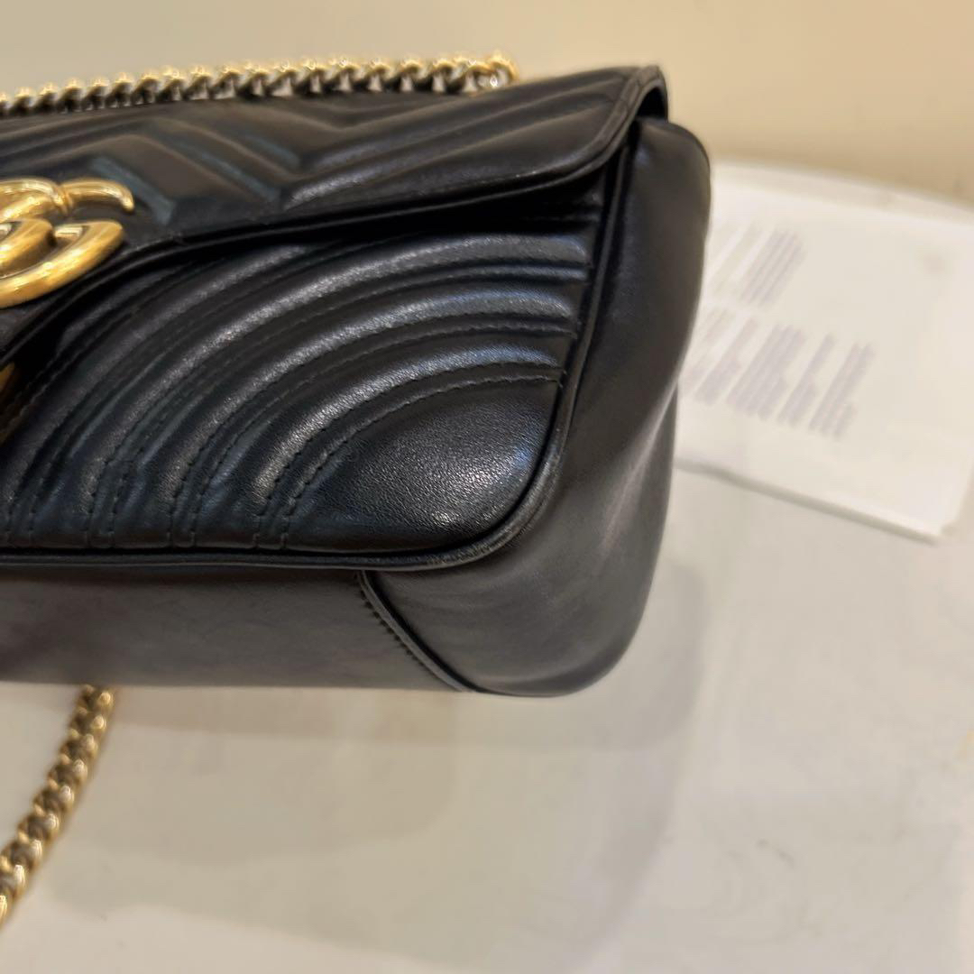 【商品详情】正品二手 Gucci 双g 马蒙 中号 牛皮 黑金 斜挎包 👝 93新 25×15 。五金及链条明显使用氧化 金属logo有磕碰 搭扣处和边角正常使用磨损 百搭经典款