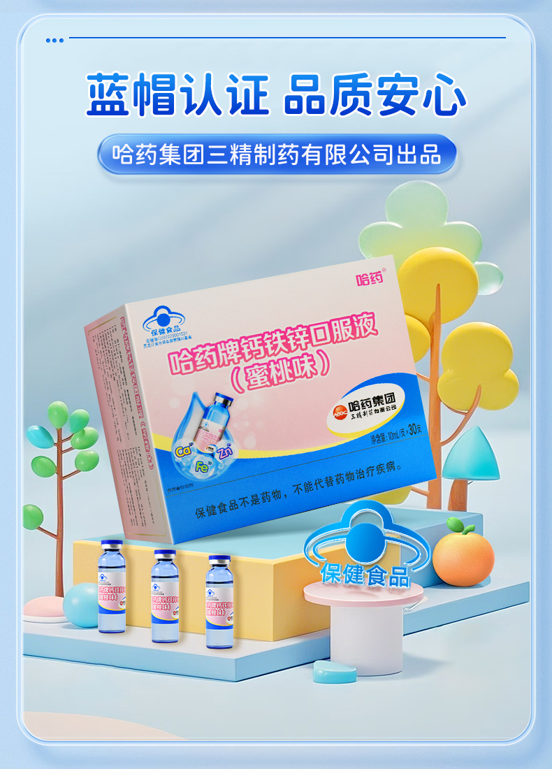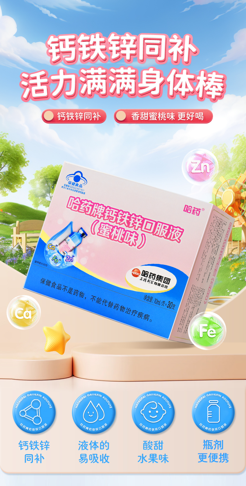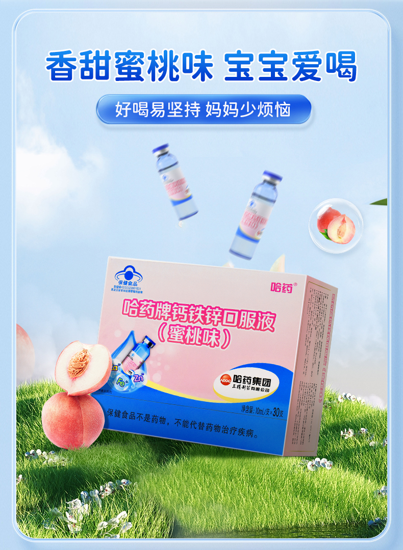 哈药牌钙铁锌口服液(蜜桃味)300ml(10ml/支*30支)*2盒+赠1盒健安喜维生素AD软胶囊10粒⭐️