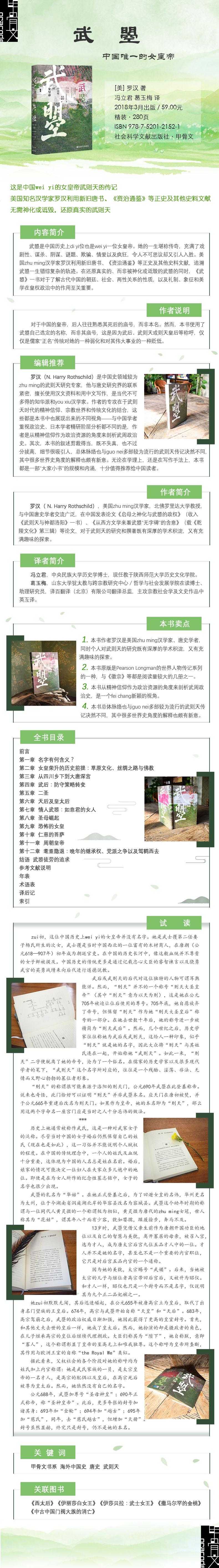 美国著名汉学家罗汉利用新旧唐书、《资治通鉴》等正史及其他史料文献,《武曌(中国专享的女皇帝)(精)》细腻地描述了武曌在多个身份与角色之间的转换:籍籍无名的武氏次女、大唐深宫中的才人武媚、逐渐登上权力宝座的天后、开创新王朝的帝王,以及作为情人、圣母、女皇、菩萨和耄耋老人的武曌。