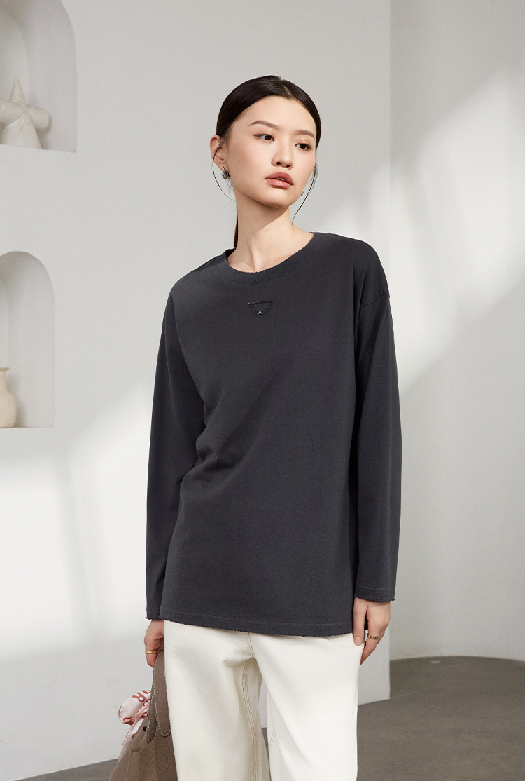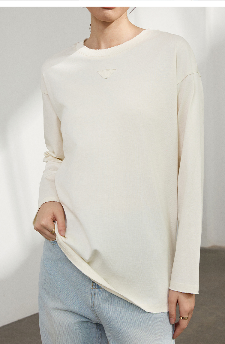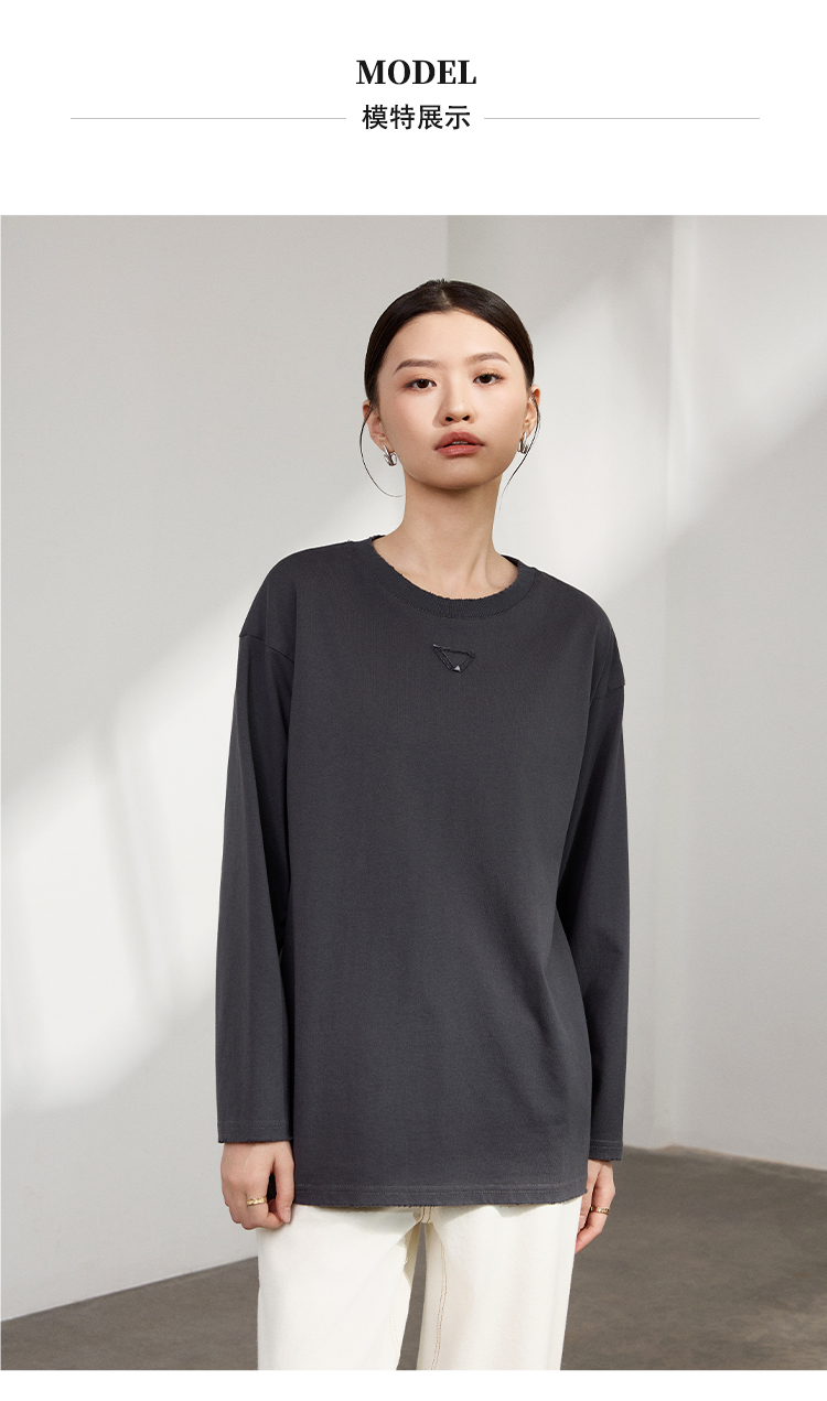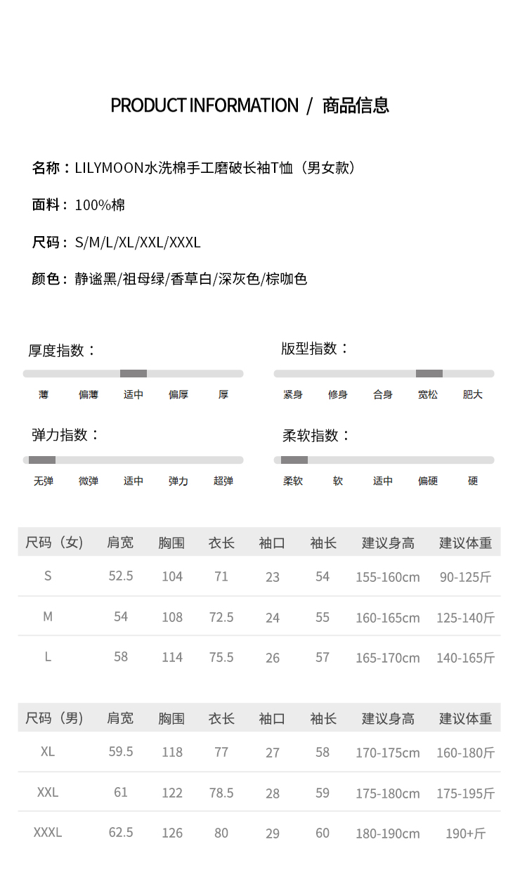 LILYMOON 水洗棉手工磨破长袖T恤男女同款情侣打底衫新疆长绒棉
