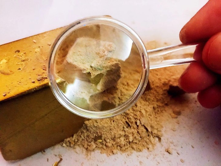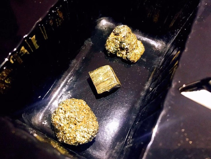 挖完之后,三块矿石看上去颜色都差不多。于是我们再继续带着娃看看,而在仔细对比之后,我们发现其中两块只是普通的黄铜矿,并不是真的黄金。