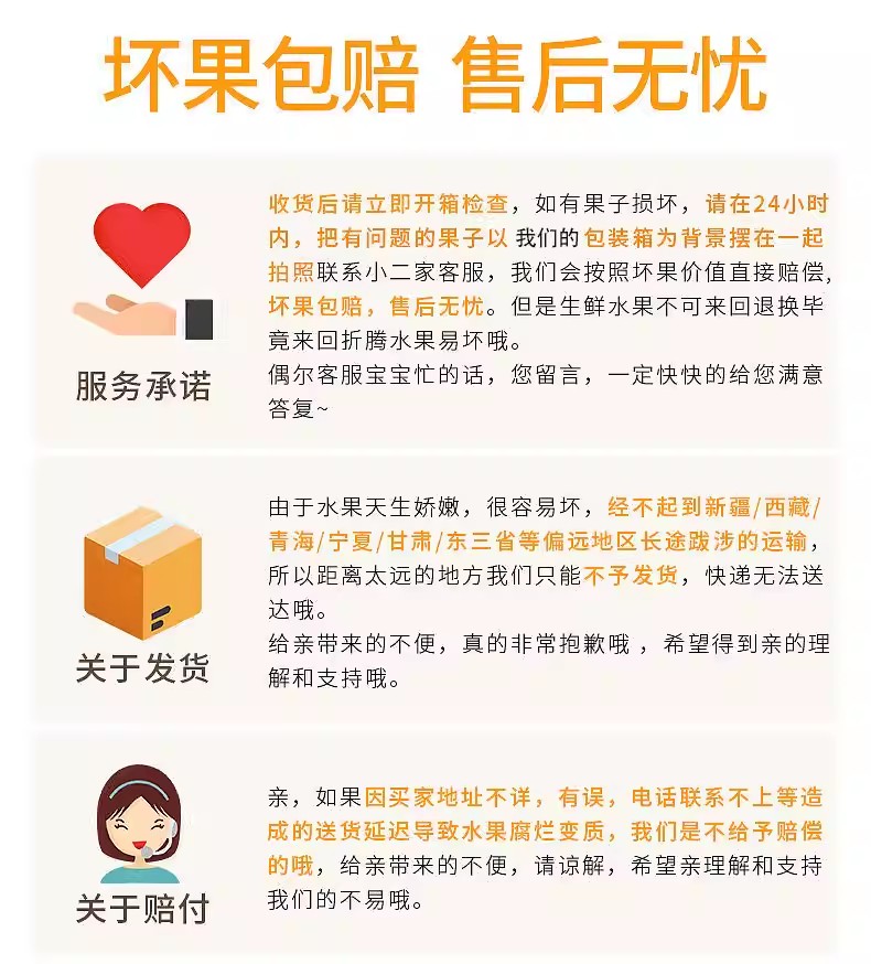 【售后理赔标准】数量不足补发或者按比例赔付,口感(酸、无味、太甜等)因个人标准不同不售后。