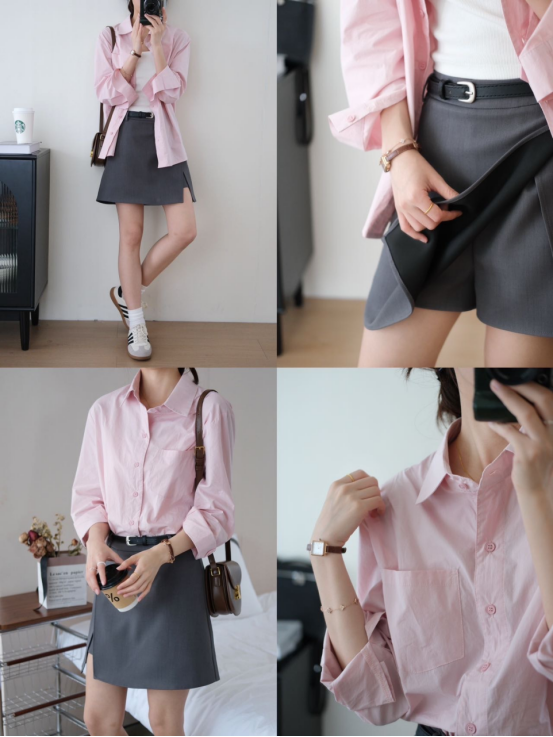 ⚠️团长上身实拍 清爽的粉色真的让人一眼沦陷,简直是行走的滤镜 100%纯棉面料,肤感柔滑舒适仿佛会呼吸 应季正穿,可以叠穿各种马甲、外套都很合适 再热一点贴身单穿,也完全不会有闷热粘腻感 微宽松的版型上身太显瘦了,但是不会过于肥大 上身拜拜肉小肚腩瞬间隐形❗️秒变纸片人 配吊带裙温柔到窒息,搭牛仔裤慵懒法式风拉满 配开叉短裙更是气质拉满💋全场景通用的衬衫