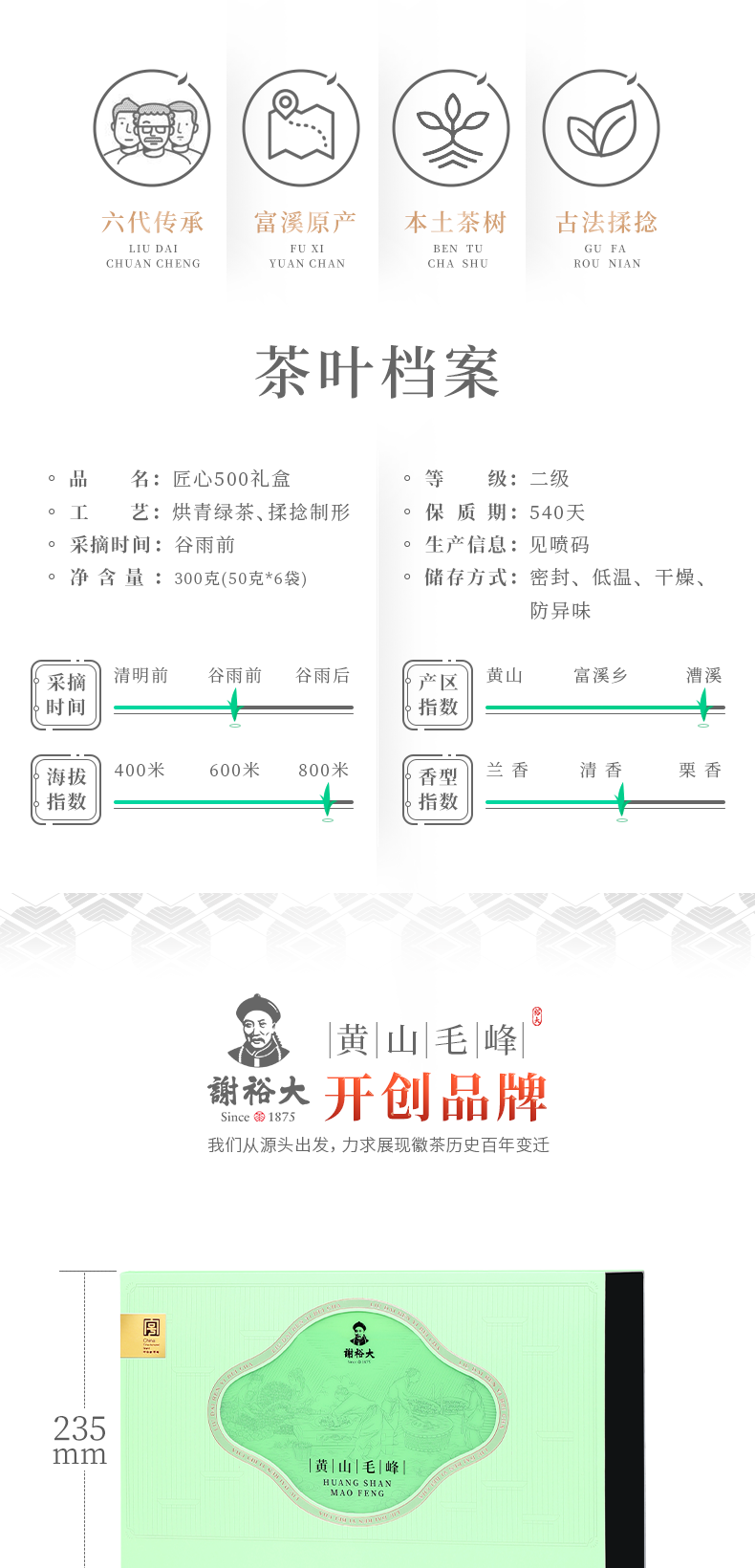 谢裕大 黄山毛峰匠心500 茶叶礼盒300g(50g*6袋) 富溪原产 古法揉捻 48小时发货