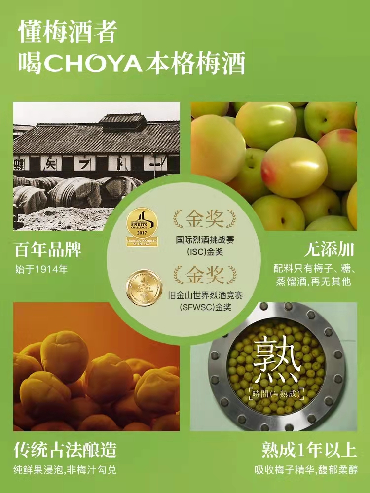 日本进口蝶矢俏雅CHOYA一年陈本格15度青梅子酒女士低度果酒720ml RDCT