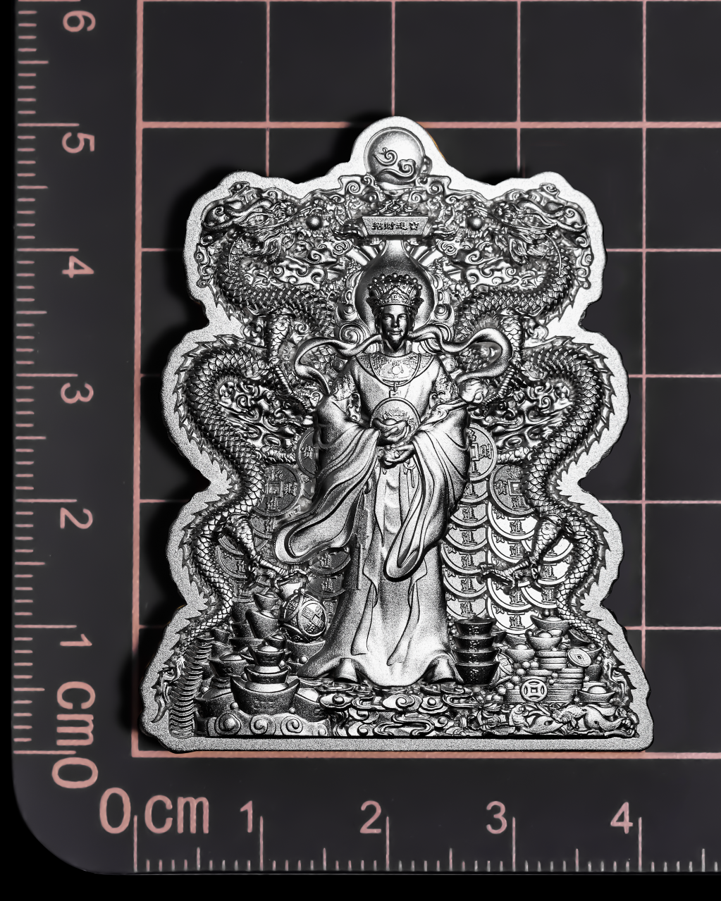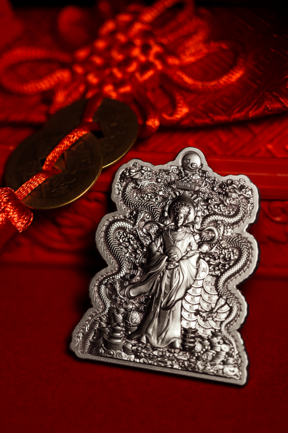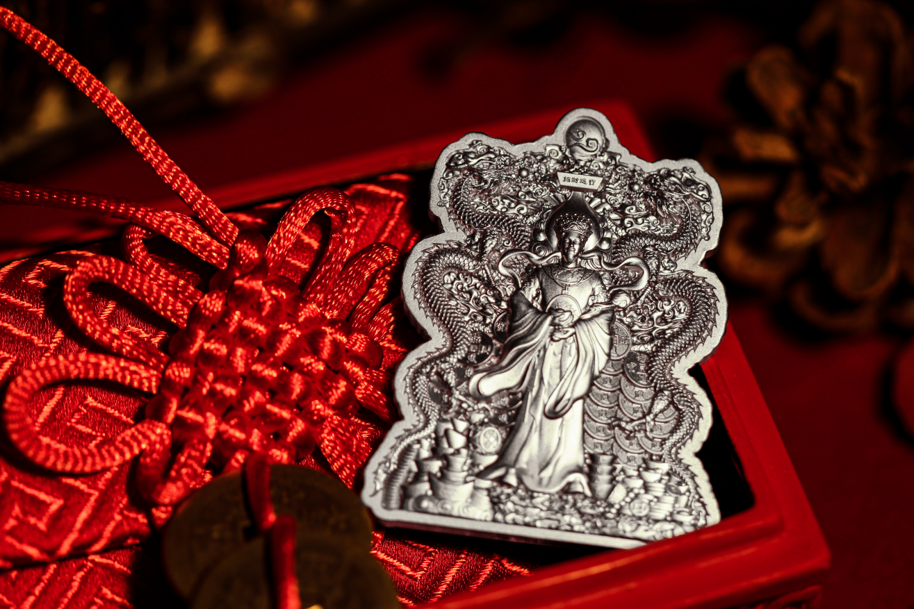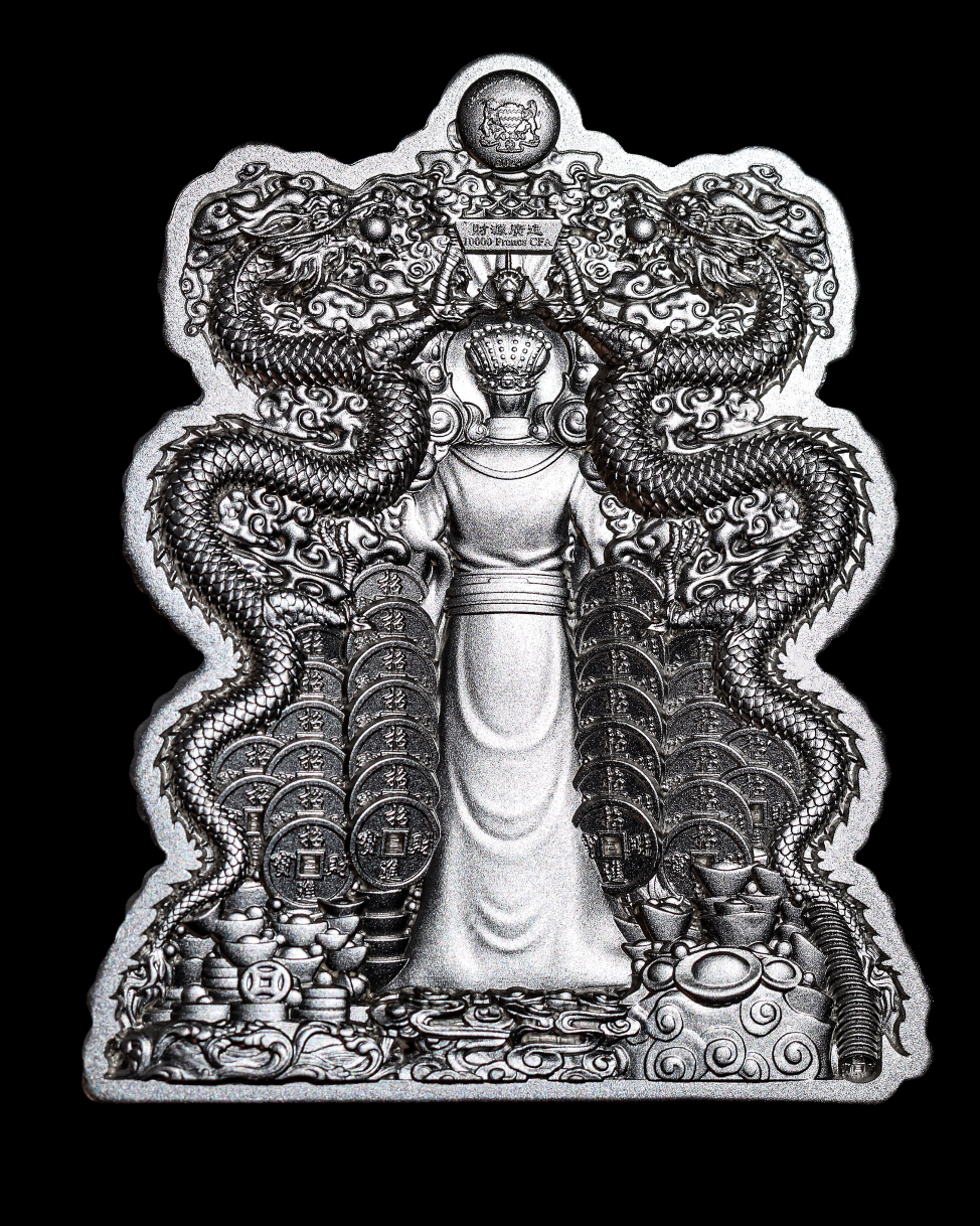 ▲2024年乍得 中国双龙财神爷高浮雕仿古纪念银币