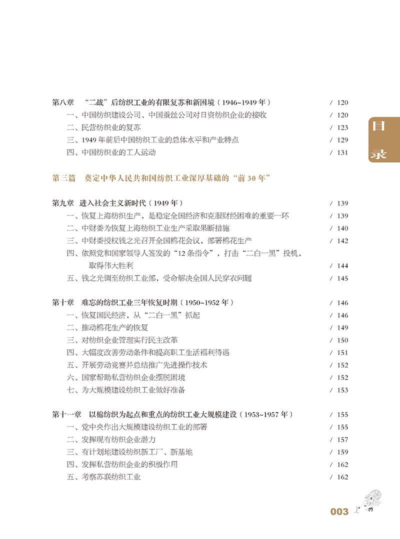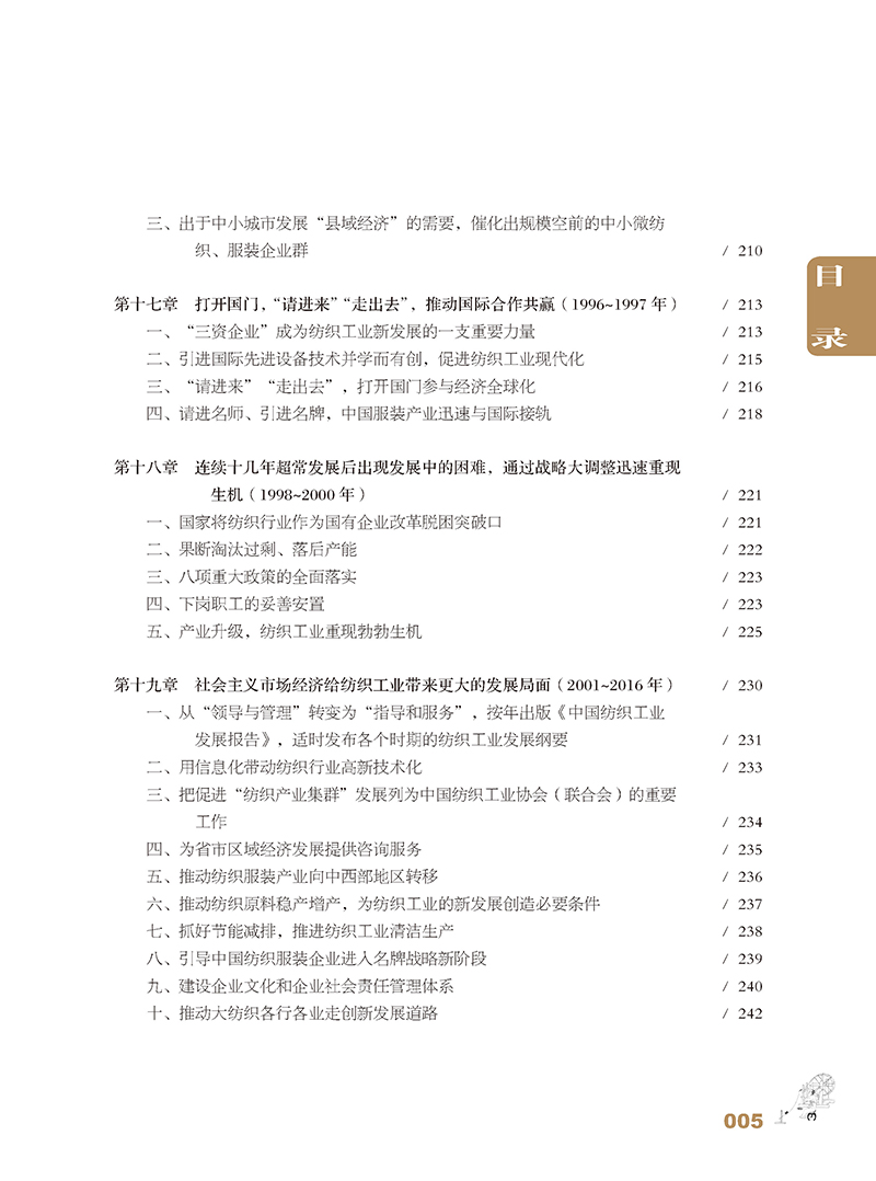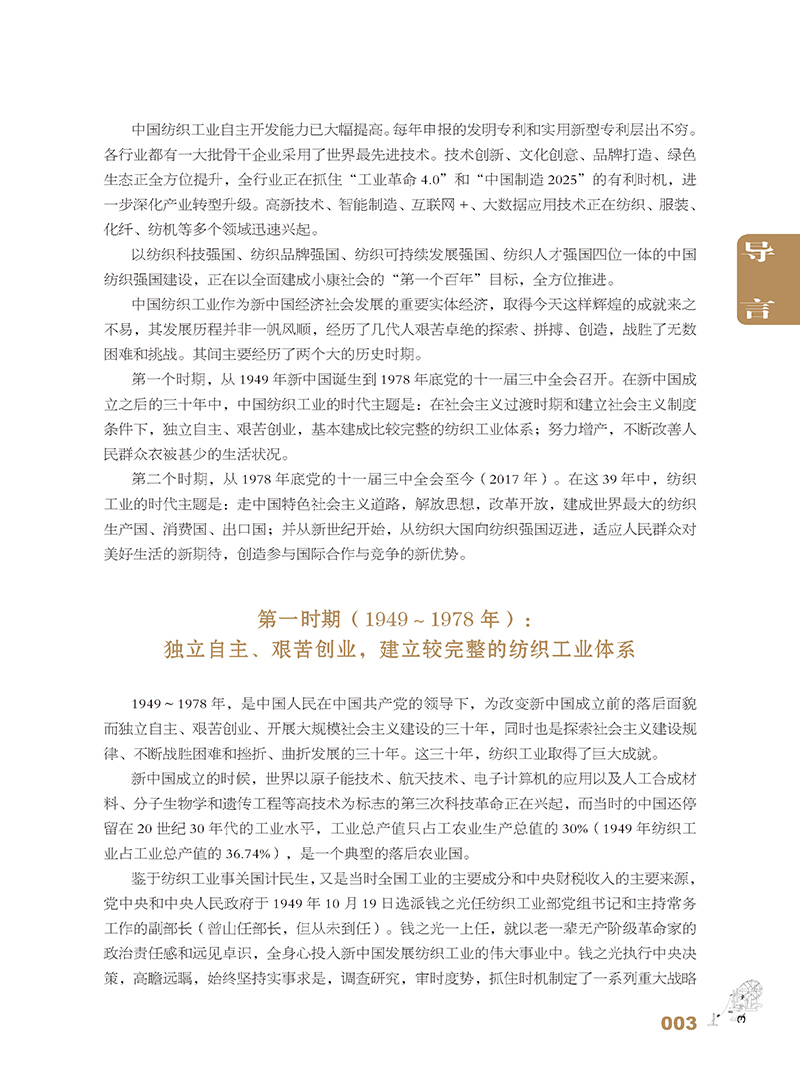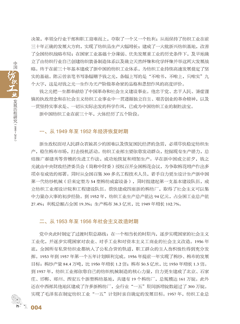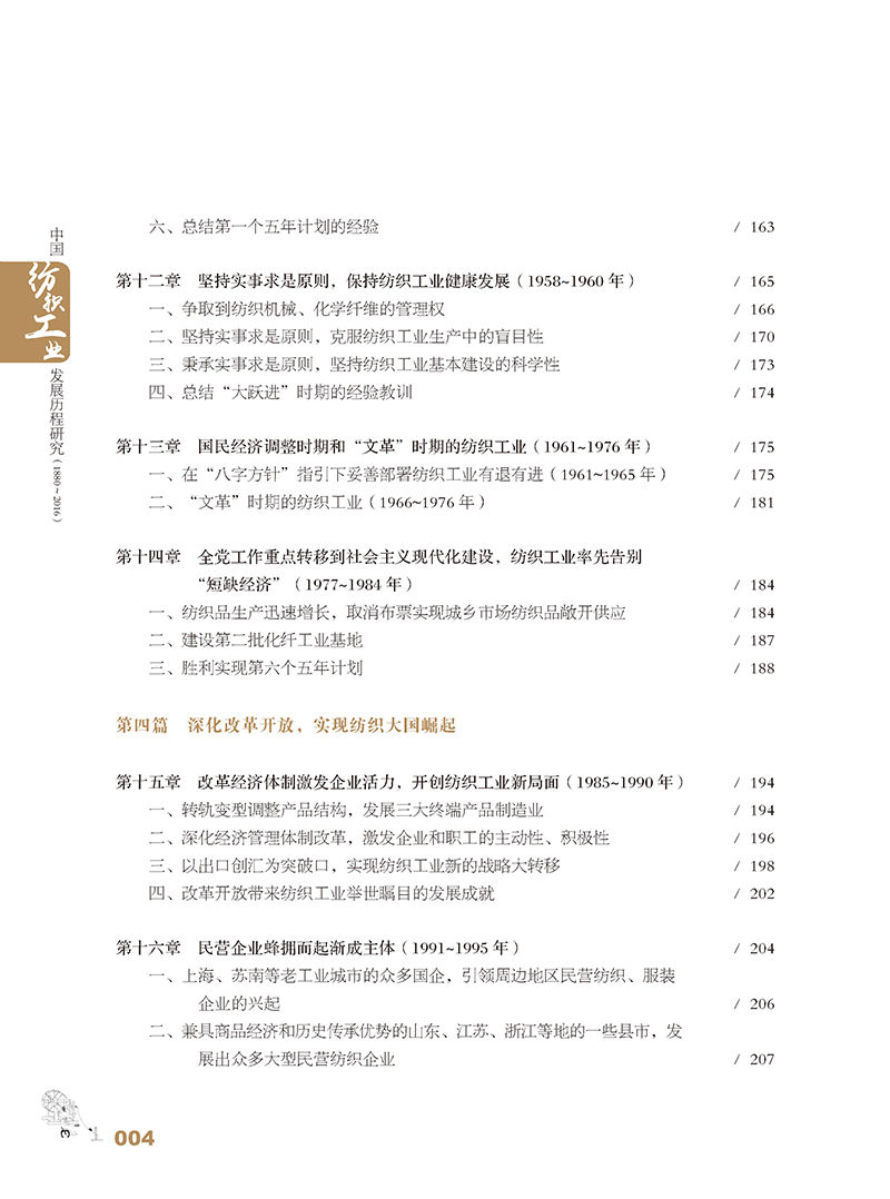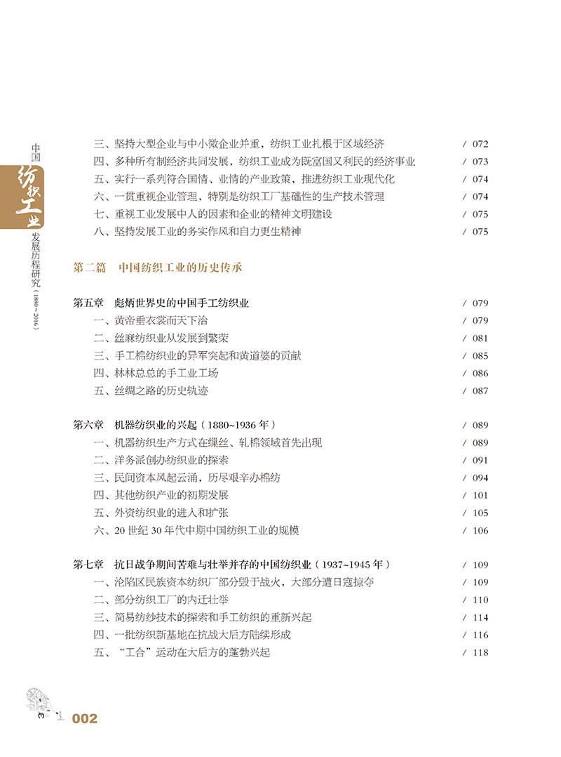 《中国纺织工业发展历程研究(1880—2016)》是一部中国纺织工业的全史。全书共八篇。*篇至第四篇为编年史,全面、系统地阐述了机器纺织工业自清末洋务运动时期发生、发展以来一个半世纪的历程;第五篇至第八篇采取纪传体方式,分别就纺织工业产业链、纺织原料和市场、工业布局、企业结构和产业集群、科教兴业等进行了翔实阐述。书中还对从黄帝时代开始的手工纺织业的发展以及古代“丝绸之路”的辉煌做了简要回顾。为便于读者查考,书末附有中国纺织工业大事记和统计资料。
