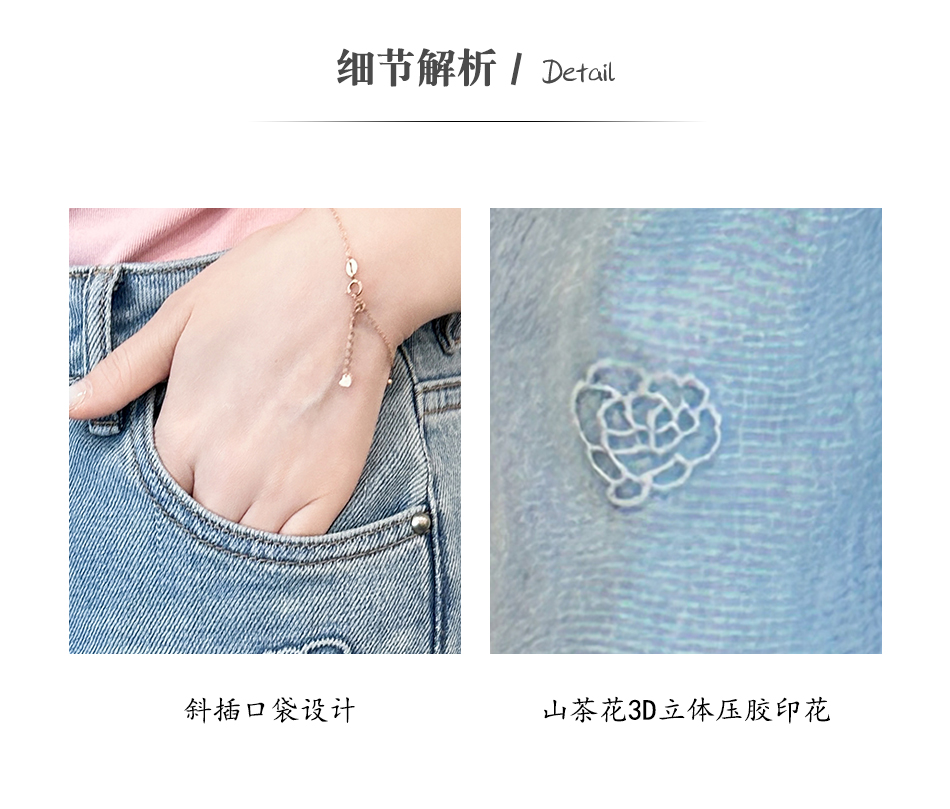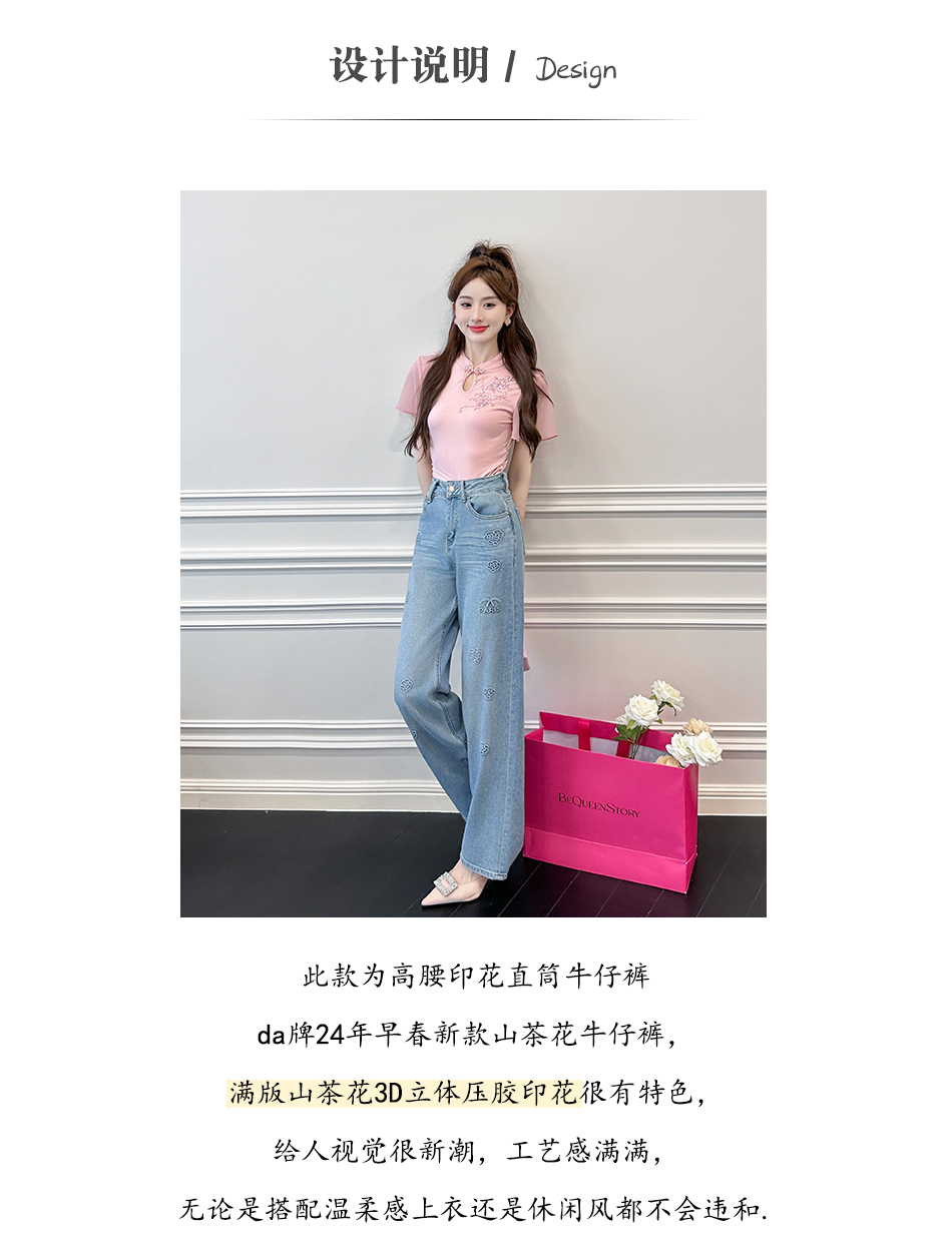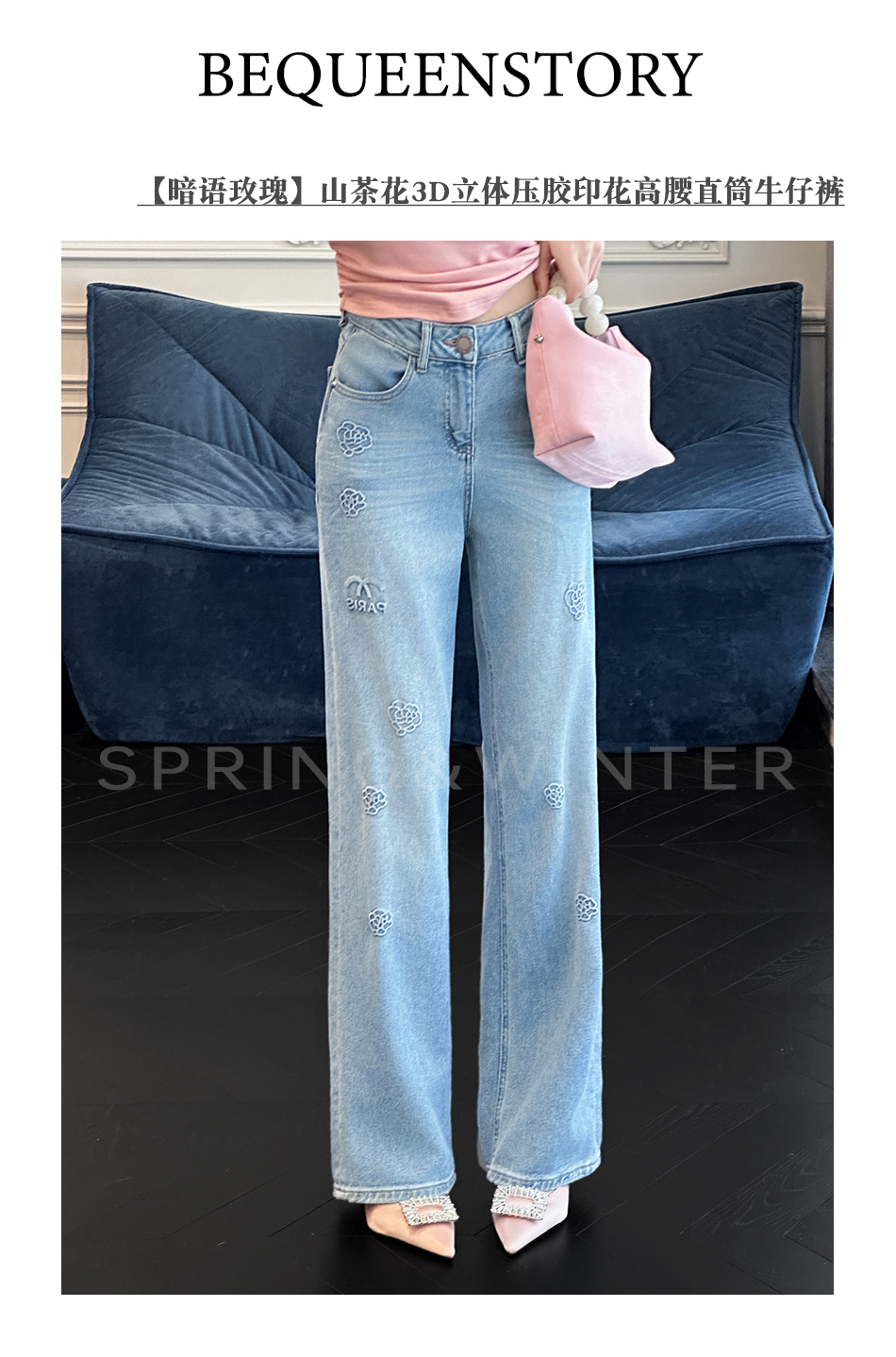 余潇潇【暗语玫瑰】重工山茶花3D立体压胶印花高腰直筒百搭牛仔裤