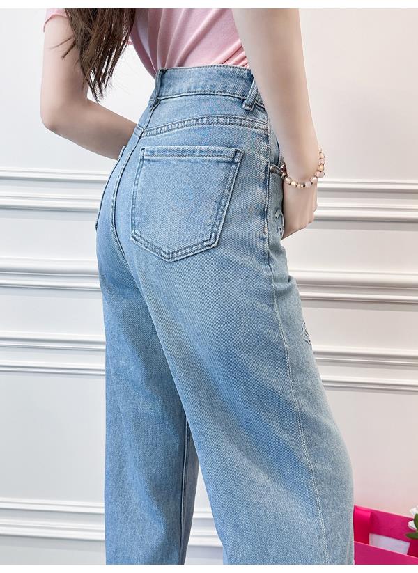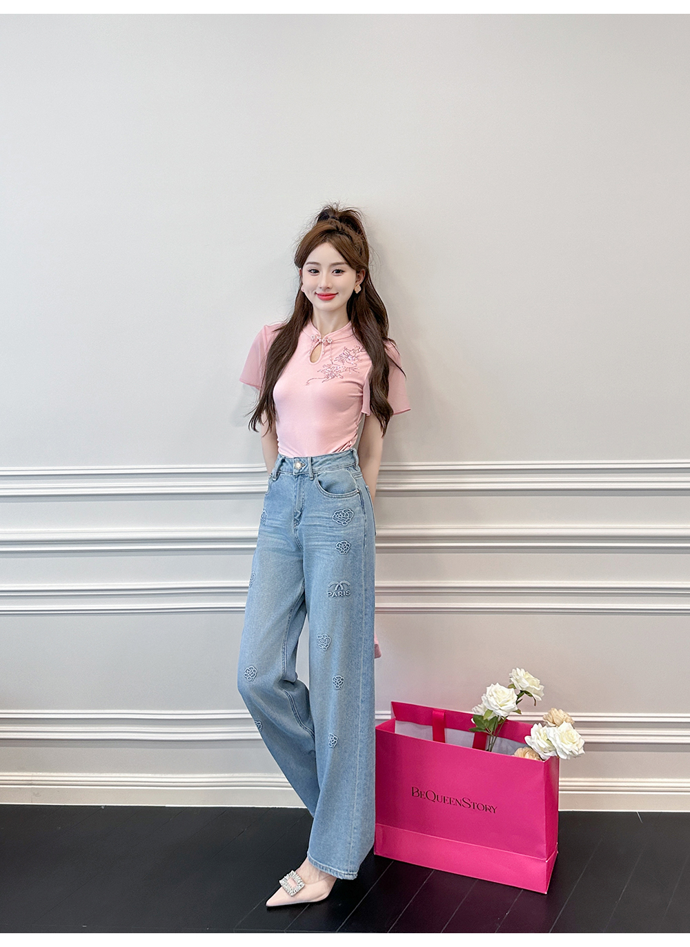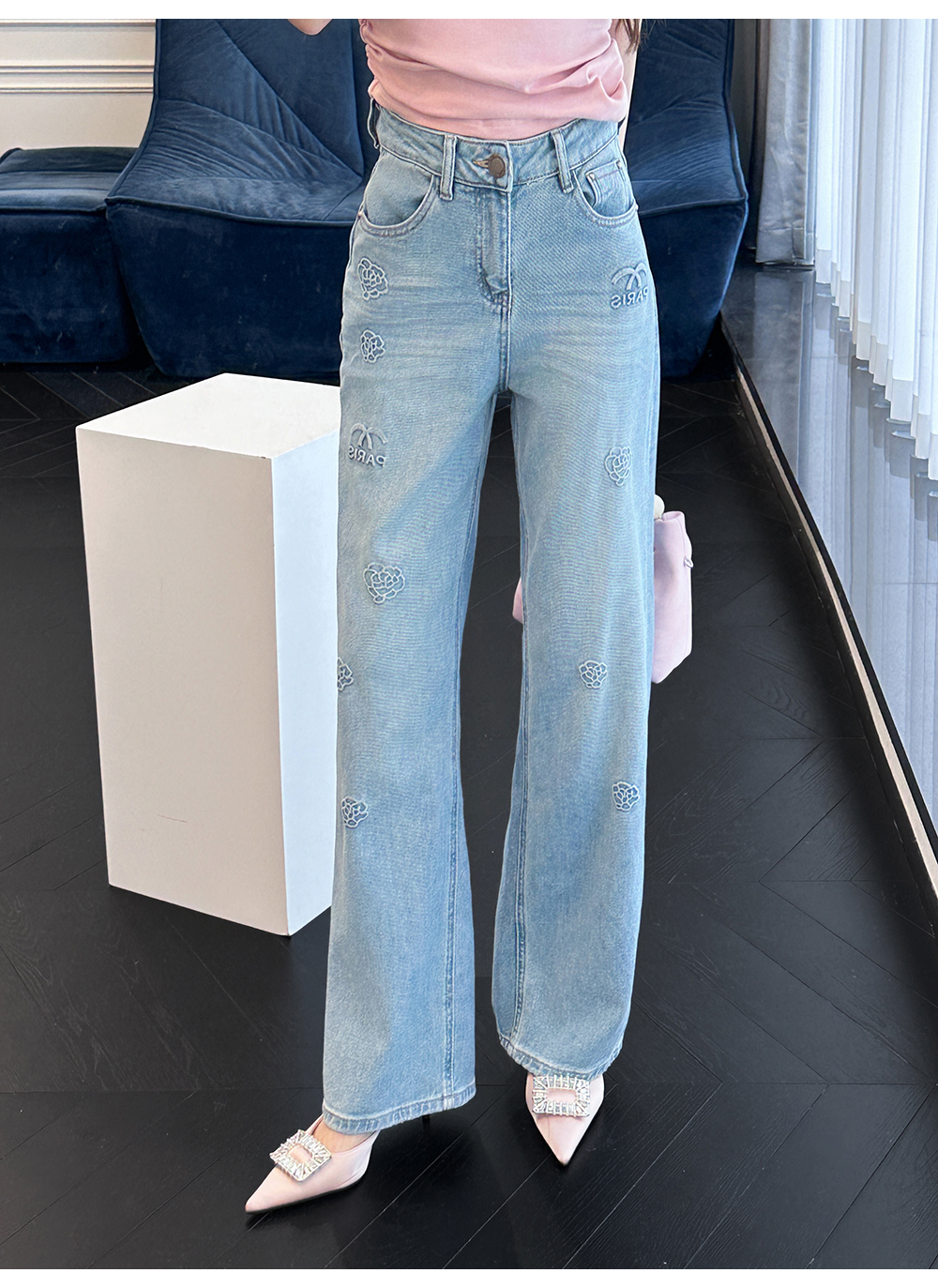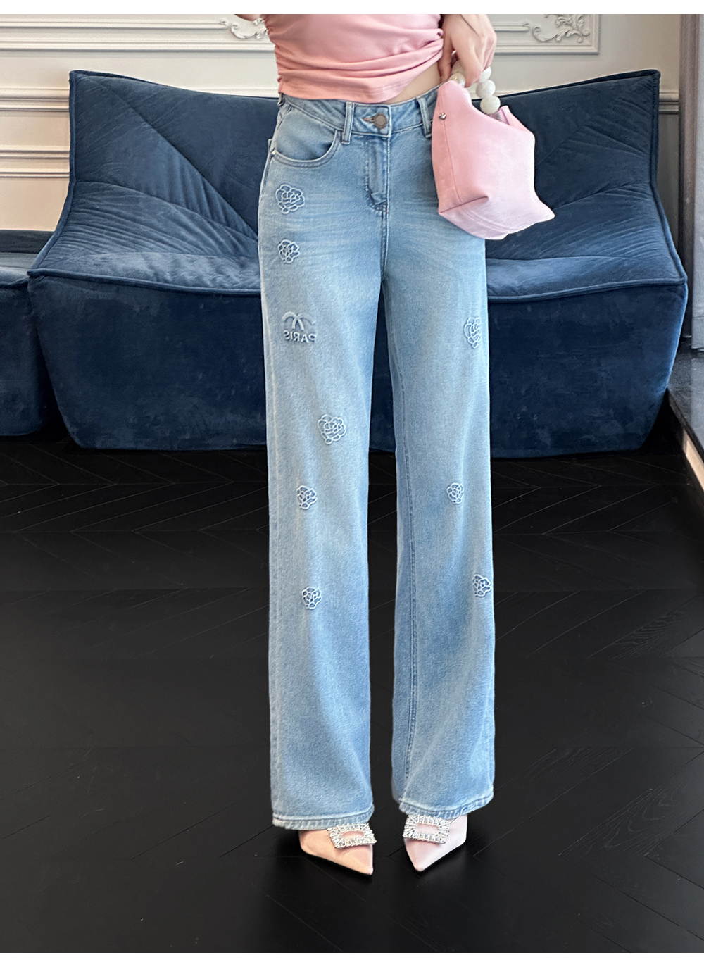 余潇潇【暗语玫瑰】重工山茶花3D立体压胶印花高腰直筒百搭牛仔裤
