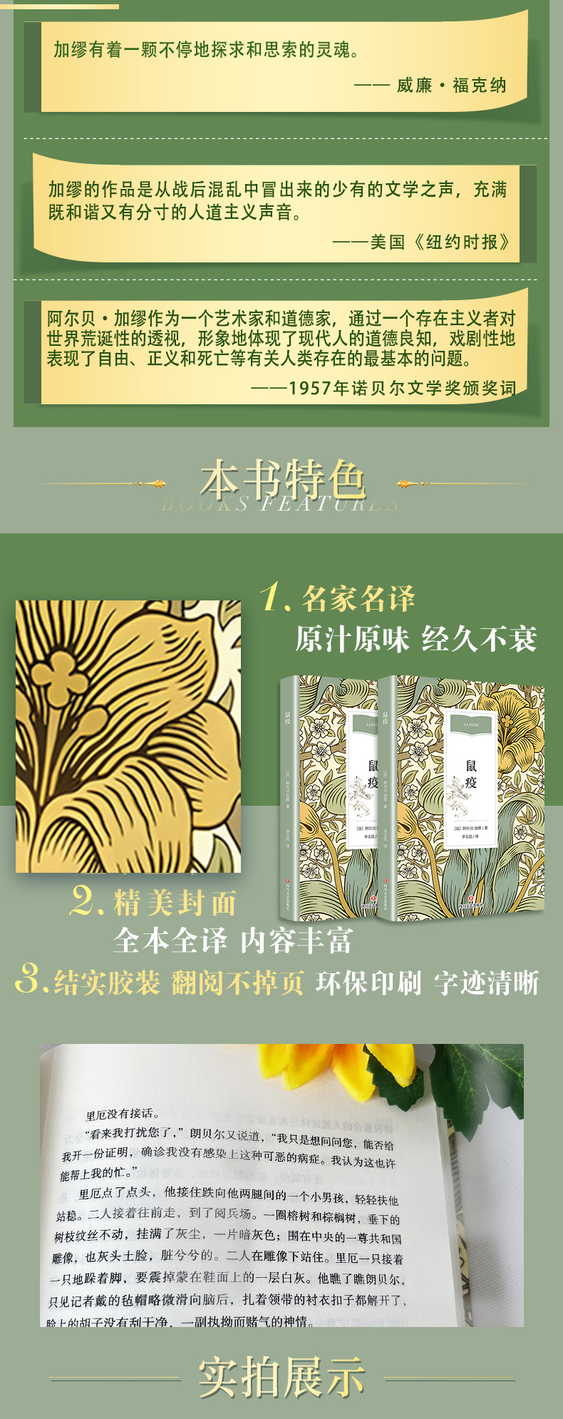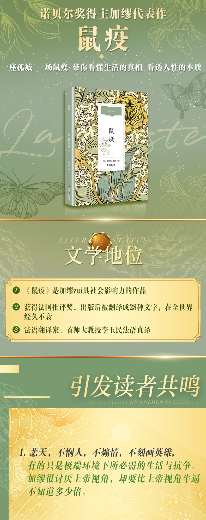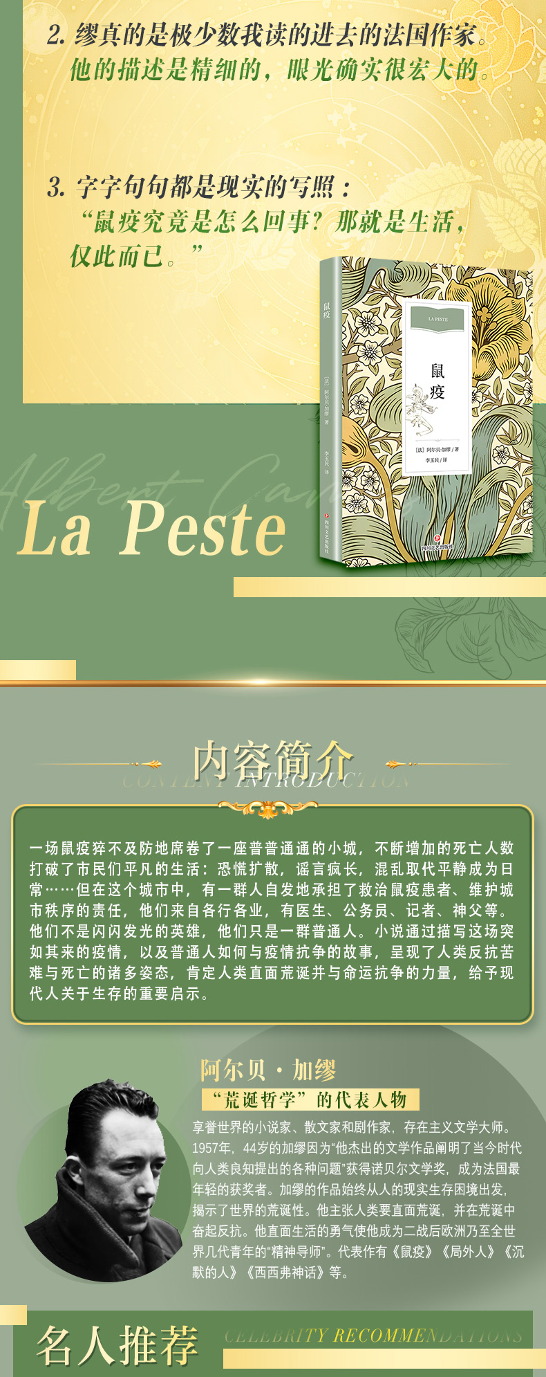 小说讲述的是北非地中海地区的一座小城奥兰突然暴发了鼠疫,突如其来的鼠疫让人不知所措。政客狂妄无知,掩饰诱过,甚至想利用灾难来获取利益;原来过着委靡不振生活的小人物,凭著黑市门路,为人民带来各种禁品,突然成为了城中的风云人物;小百姓恐慌无助、自私贪婪,每天都只是过著颓废生活。鼠疫城市被重重封锁,无人能够自由进出。被困在城中的人民,朝思暮想着住在城外的亲朋好友。一位到城公干的记者被迫过著无亲无友的生活,只有寄望参与自愿队消磨时间。主角里厄医师这时挺身而出救助病人,与一些同道成了莫逆之交。不过,他的妻子却远在疗养院,生死未卜。最终鼠疫退却了,然而尽管喧天的锣鼓冲淡了人们对疾病的恐惧,可是奥兰人永远不会忘记鼠疫曾给他们带来的梦魔。本书是阿尔贝·加缪最重要的代表作,被列为现代世界文学名著。加缪在小说中用细致的笔触描写了在这座爆发瘟疫的孤城里人们的孤独、恐惧、焦虑、痛苦、挣扎和斗争,呈现了......