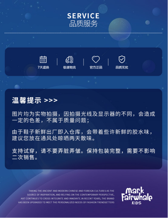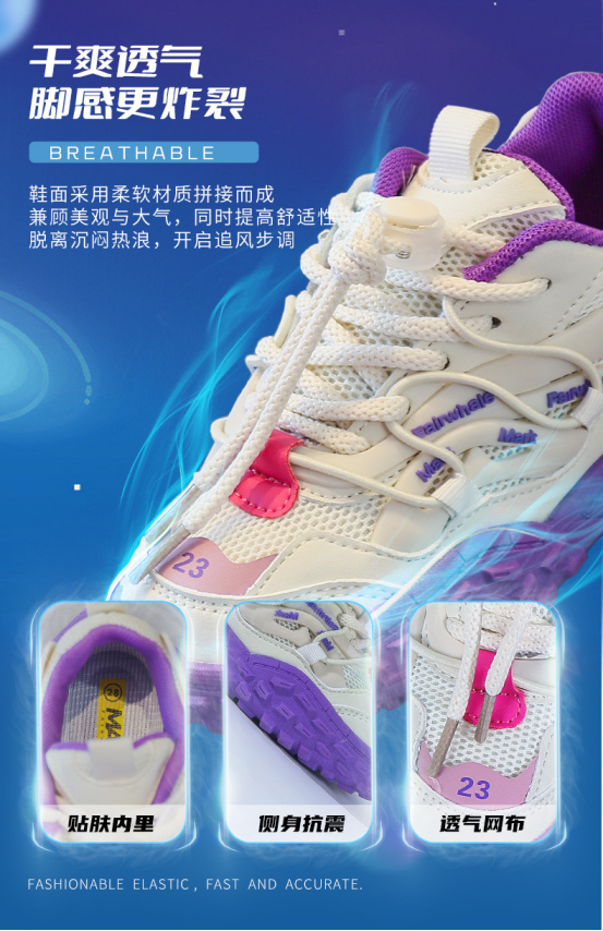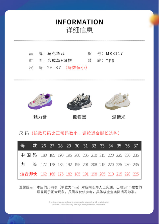 马克华菲23年春季新品童鞋MK3117 品牌:马克华菲 规格:26-37码(码数偏小) 颜色:温情米/魅力紫/熊猫黑3色可选 材质:合成革+织物+TPR 跟高:3cm 帮高:5cm 产地:福建泉州 发货地:福建泉州 发货快递:圆通快递/丰网速运/中通快递/韵达快递随机发 发货时长:72小时 不发货地区:港澳台、海外 售后说明:在不影响二次销售的情况下,支持7天无理由退换货,非产品本身质量问题需要客户自行承担运费