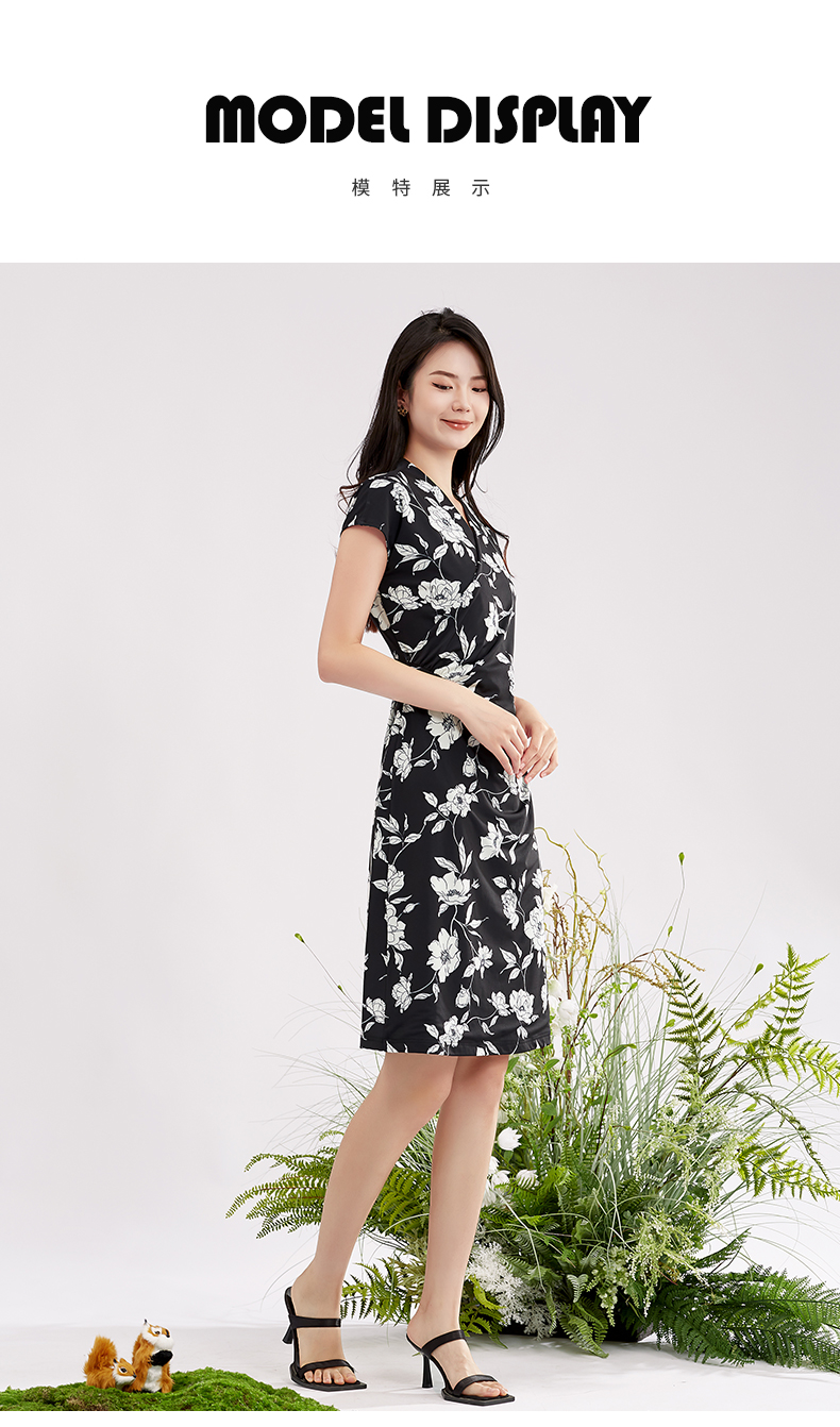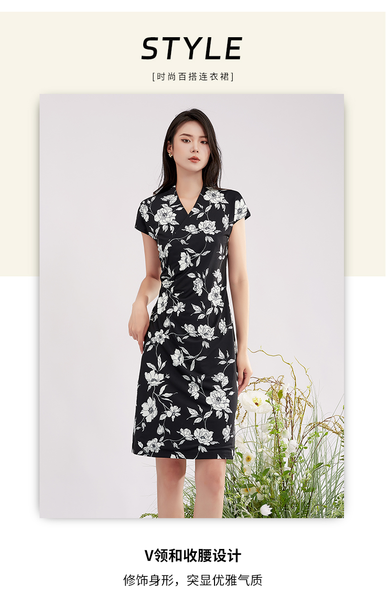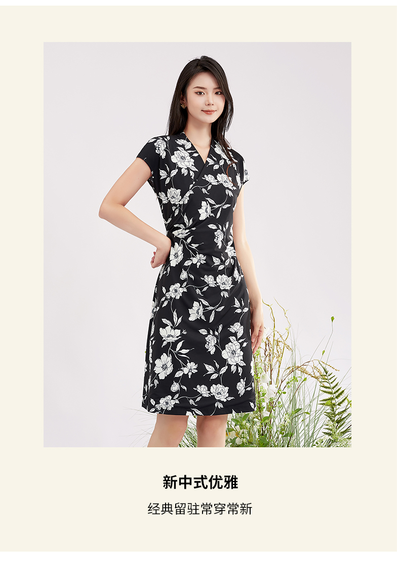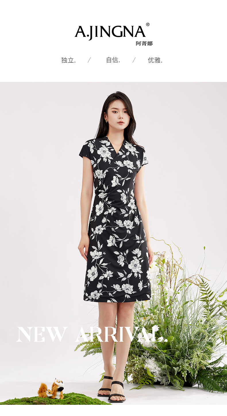 【商场同款】阿菁娜V领花卉印花优雅连衣裙A28X112098