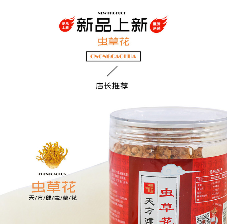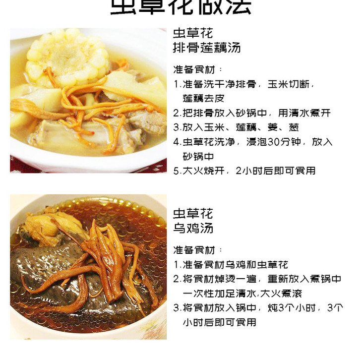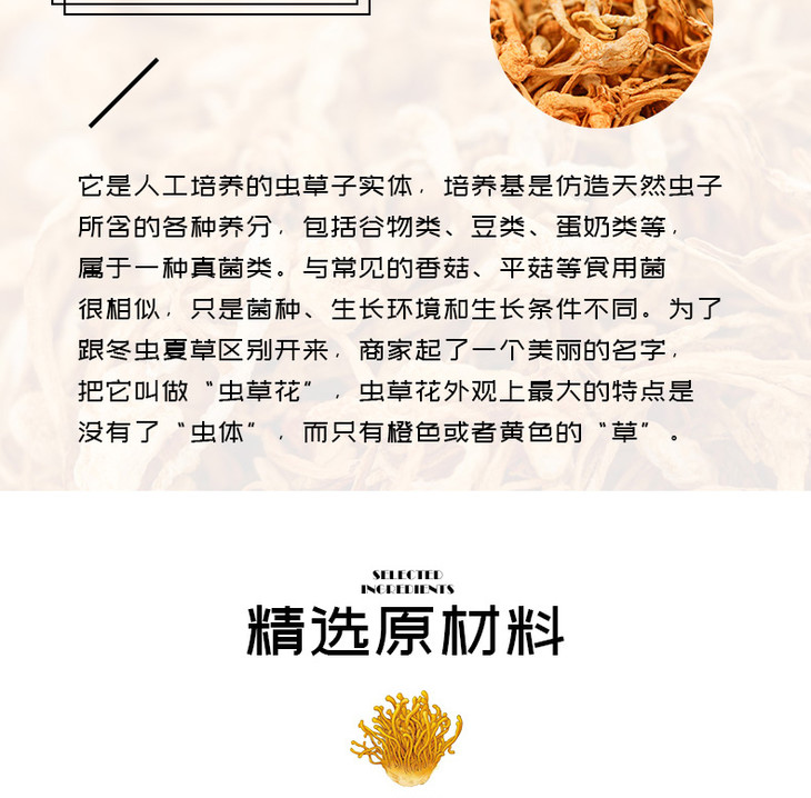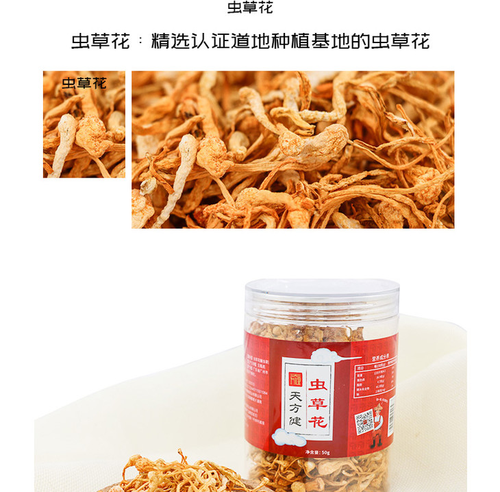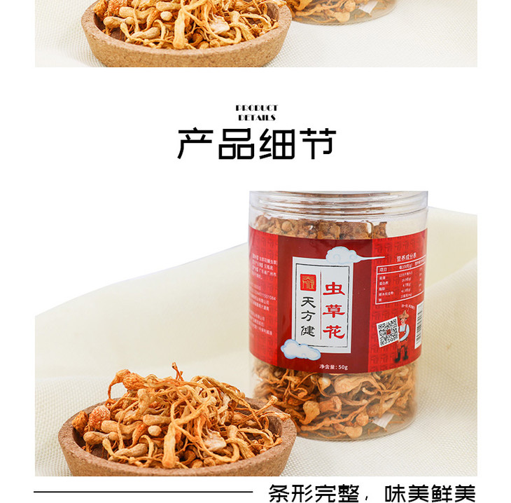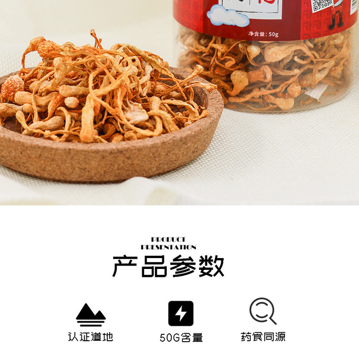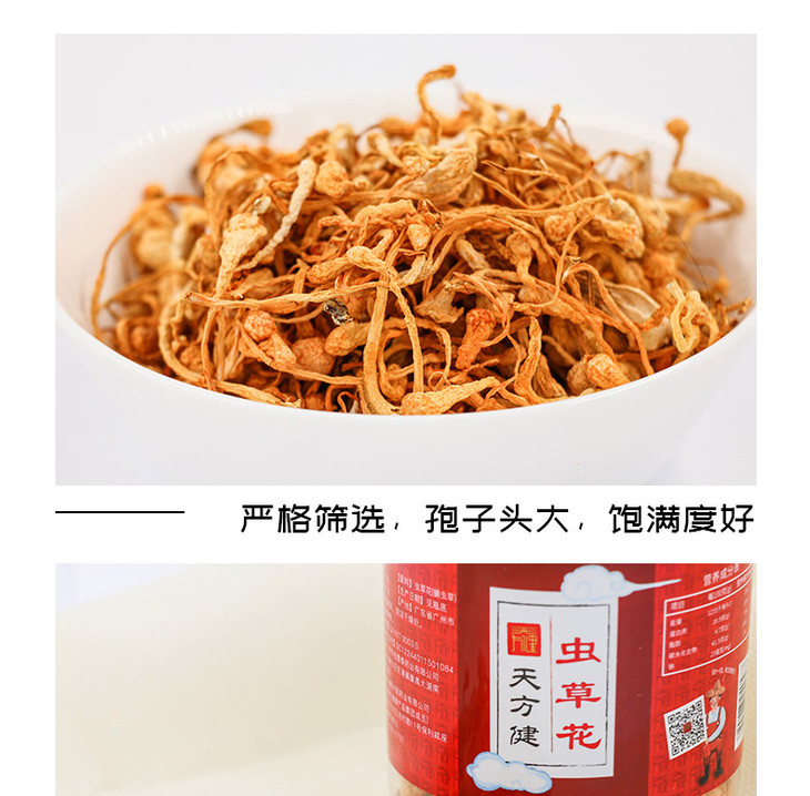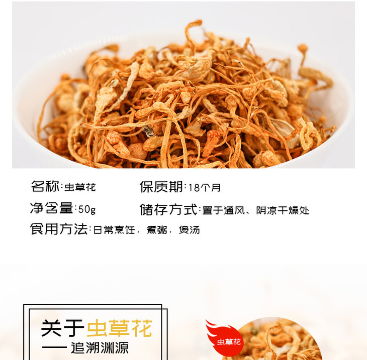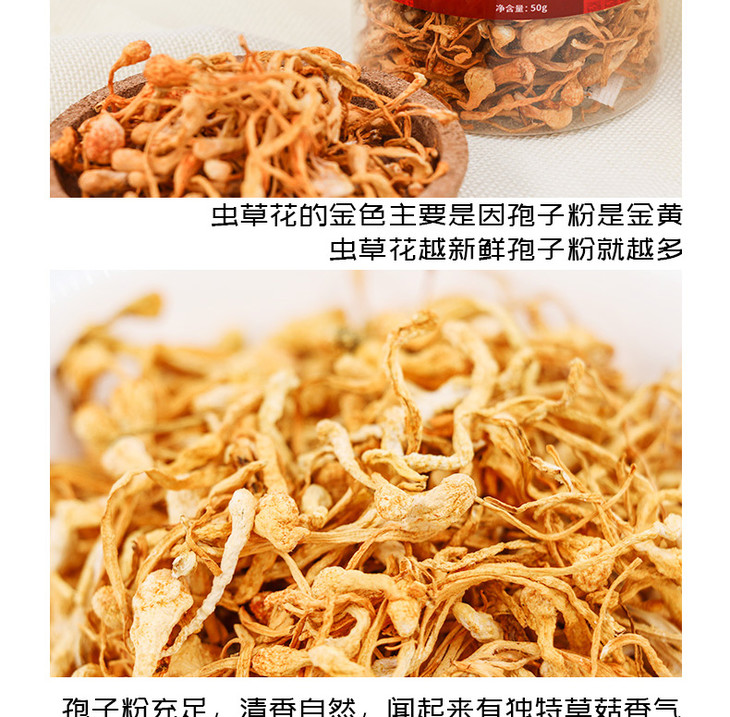 虫草花50克,孢子头大 条形完整 色呈金黄 汤色明亮 入口醇香 口感清甜