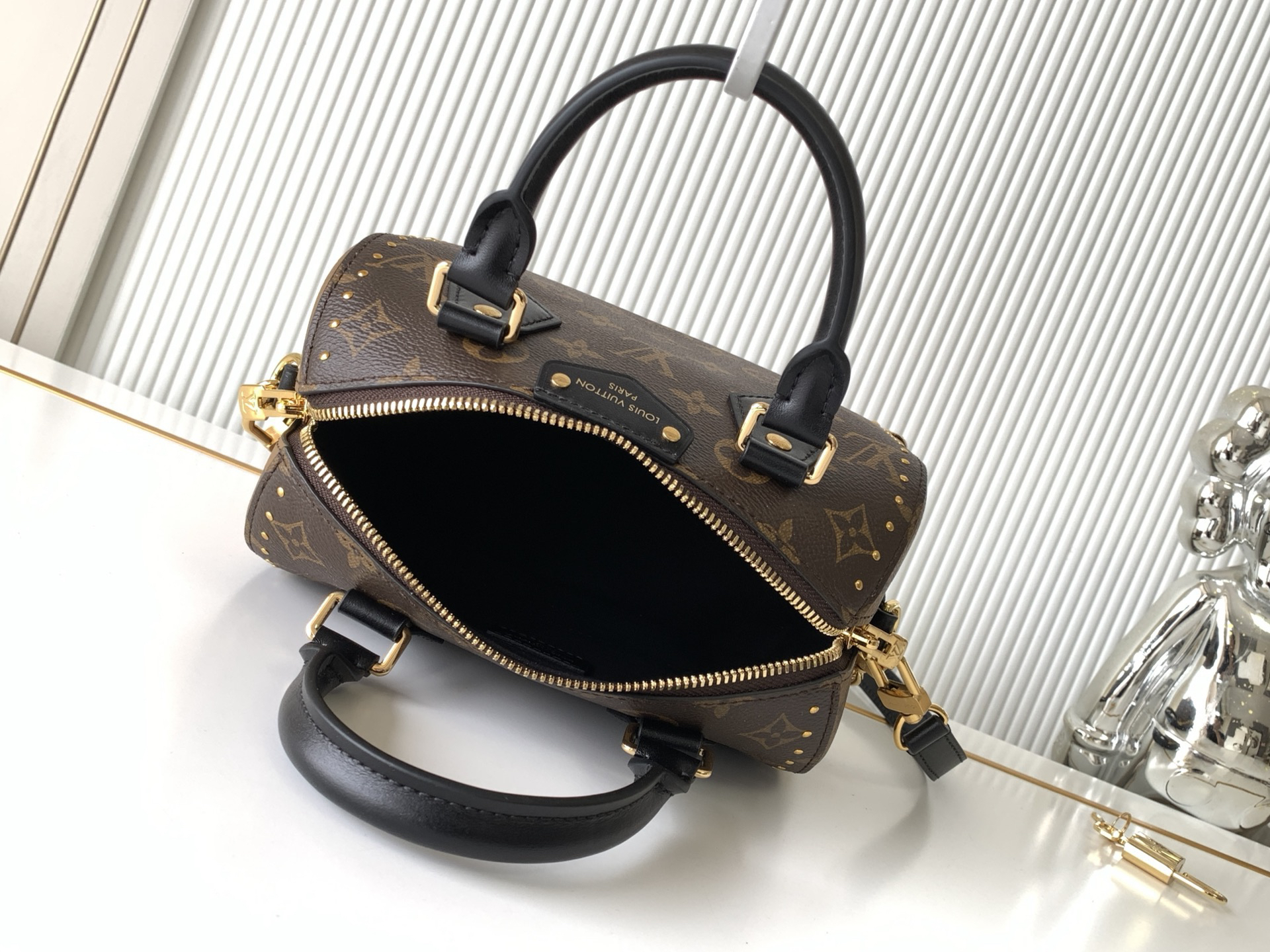 秋冬特惠💰1300 渠道级LV【全钢五金 变码芯片】te级LV 全套包装 M13146老花杏 Speedy Trunk 手袋以大胆理念重构经典设计,瞩目亮相路易威登2025 Cruise 早春秀场。Monogram帆布搭配Monogram Reverse饰边,展现 Nicolas Ghesquière的标志性笔触,耀目金属件致敬品牌悠远制箱传承。肩带和链条均可拆卸,斜挎、肩背或手提皆宜。