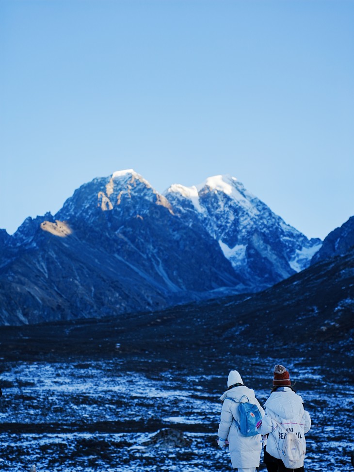 这里可以眺望海拔7556米的贡嘎雪山,在晨光中,站里在山脊上,远方山峦的轮廓逐渐清晰,被染成金色