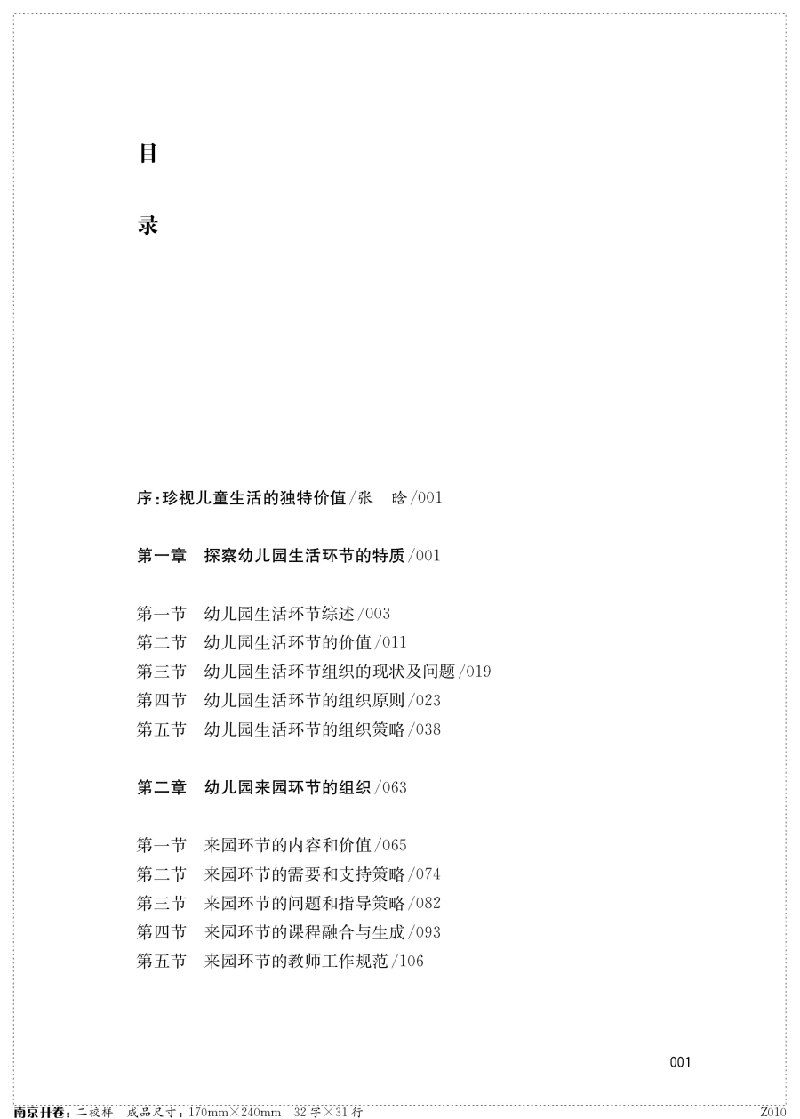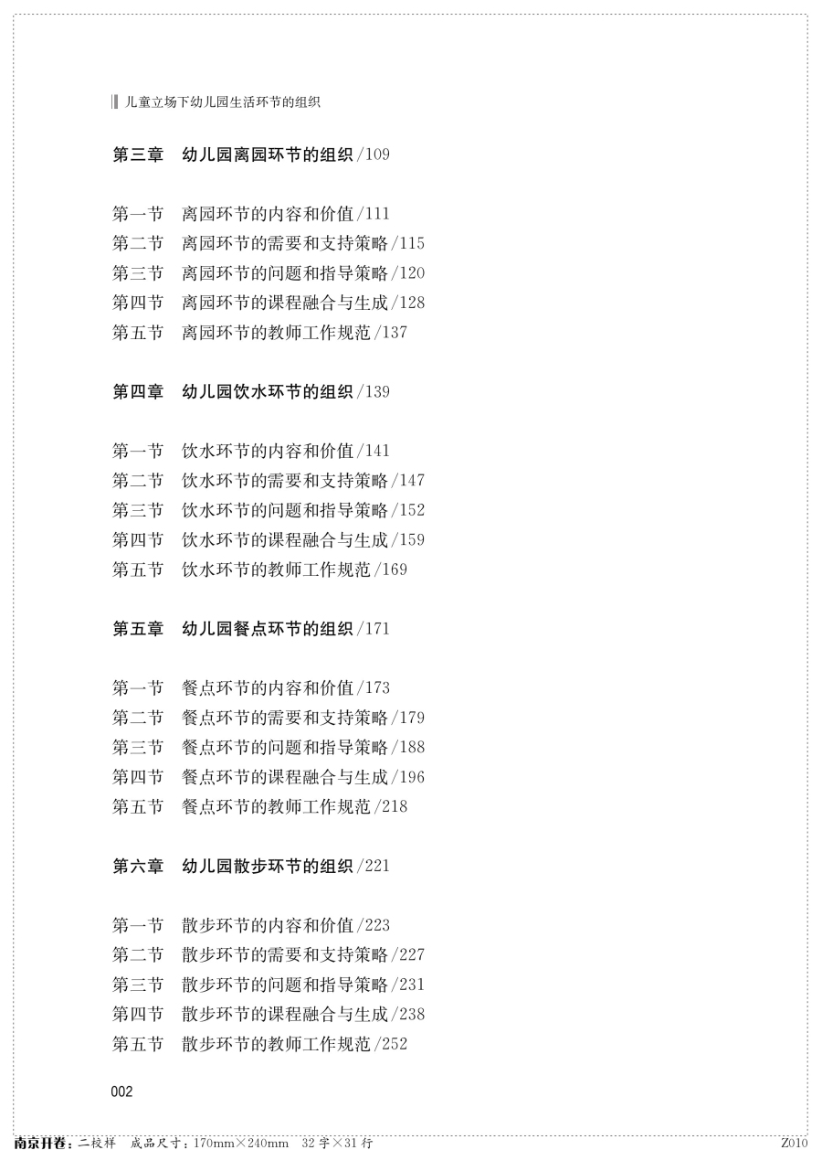 本书为江苏省教育科学“十三五”规划重点课题“基于幼儿需要的幼儿园生活环节的价值挖掘和组织实施研究”研究成果。作者从儿童立场出发,充分考虑儿童的需要,围绕幼儿园一日生活的八大环节,阐述了各环节的具体内容和价值、现状、问题和指导策略,与课程的融合与生成,以及教师工作规范等内容。作者观察并思考了幼儿园生活环节存在的问题,调查和分析了各年龄段幼儿在八个生活环节上的需求,从培养幼儿独立生活能力、集体生活意识和学习关键经验的角度出发,提出了个生活环节的组织策略。