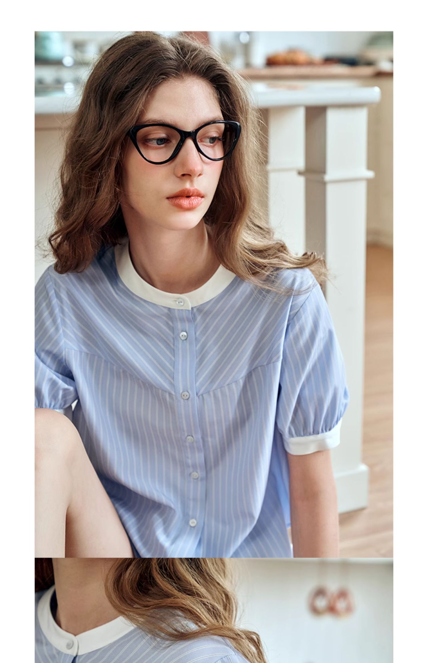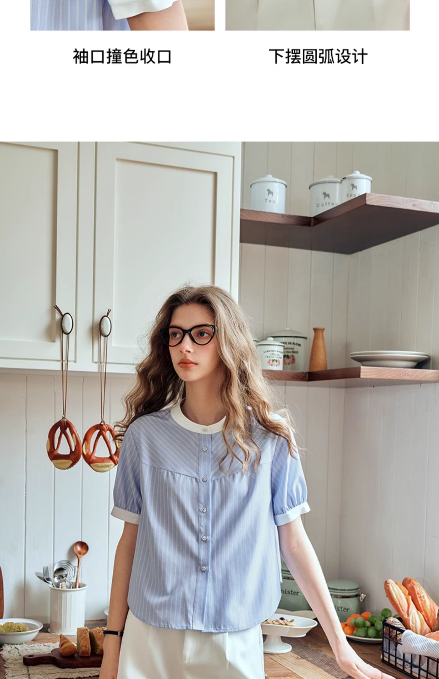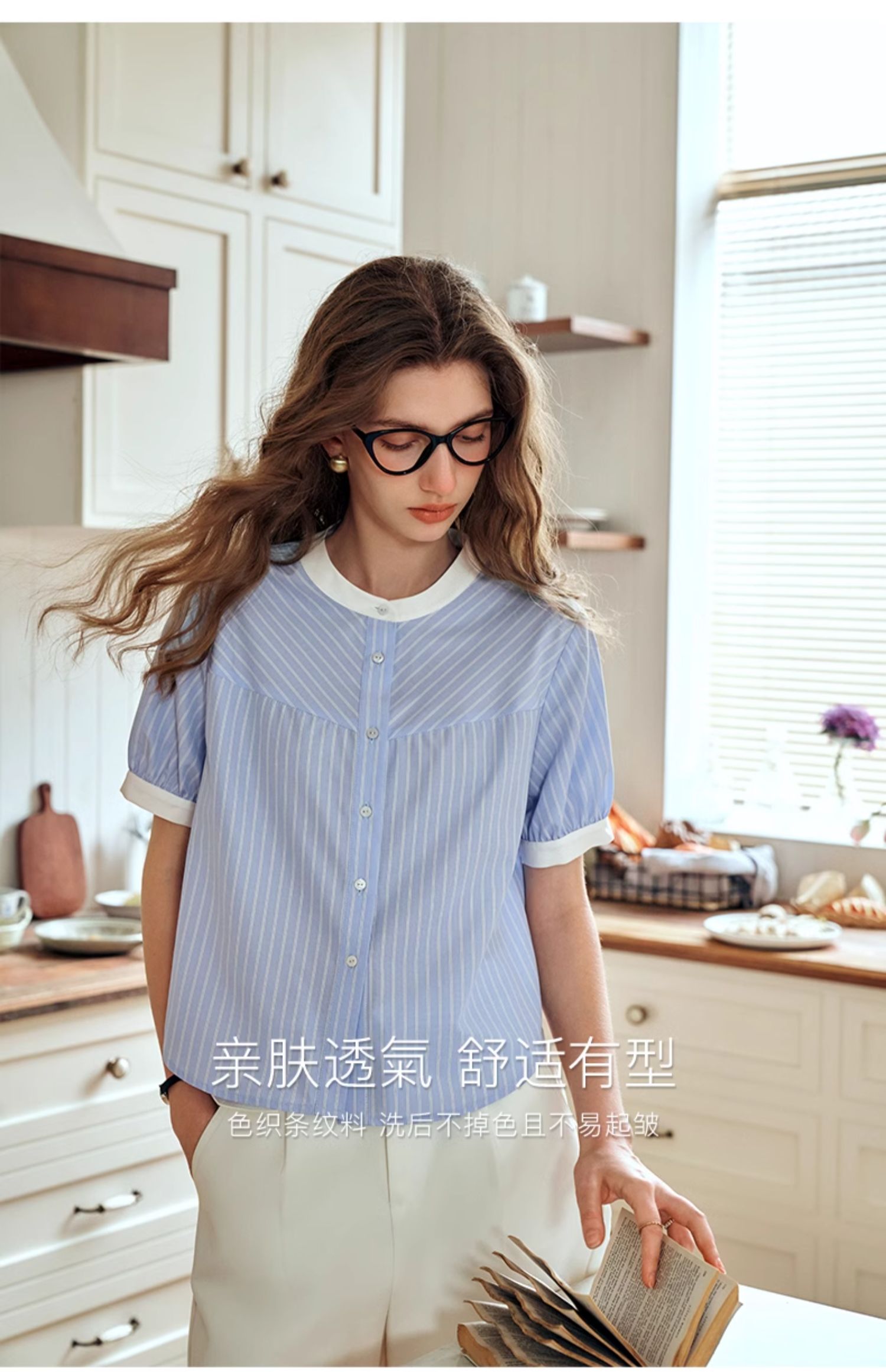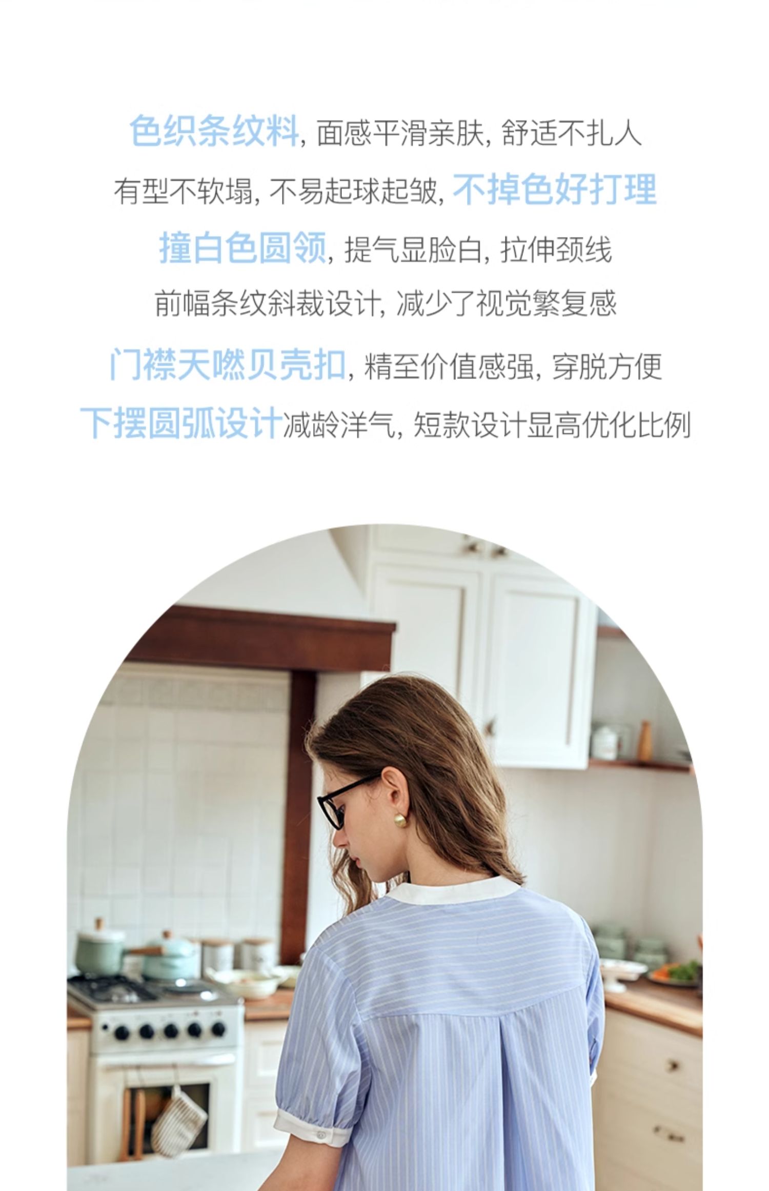 OLrain欧芮儿蓝色条纹衬衫女夏季2024年新款设计感通勤短袖上衣