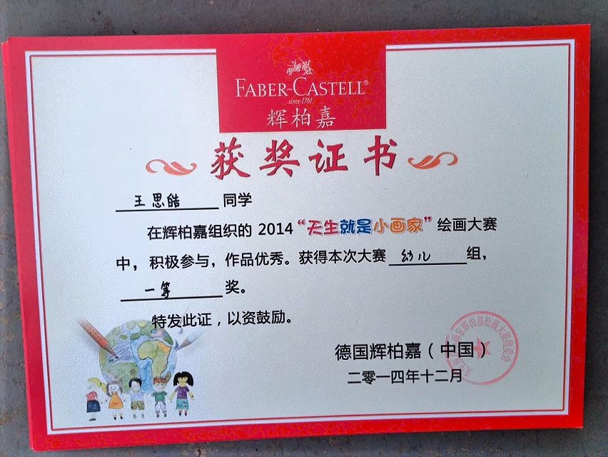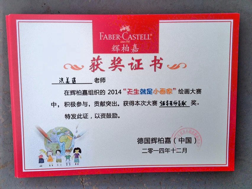 2014—2015年两次成功组织学生参赛德国辉柏嘉和中国少年报主办的“天生就是小画家”全国青少年彩铅绘画《梦幻城堡》的比赛活动,获一等奖5人(免费香港亲子游)、二等奖57人。