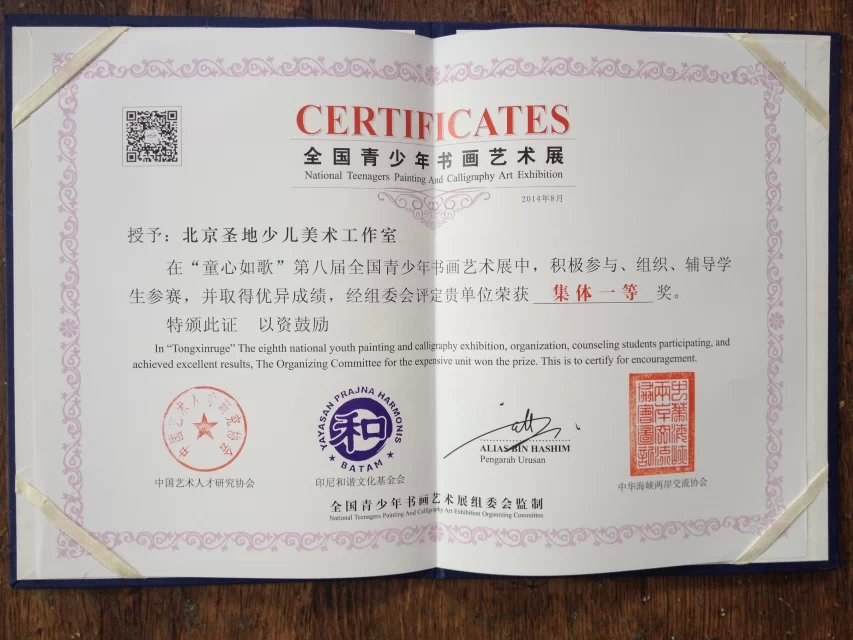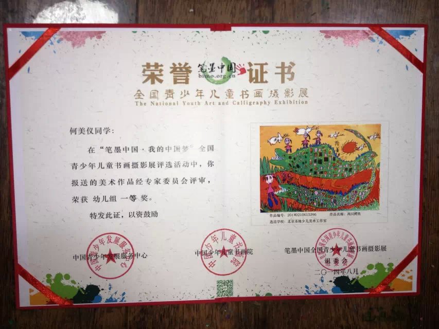 2012—2015年每年组织学生参加《艺术玩家》、《笔墨中国》、《童心如歌》、《大美》等颇具影响力的全国青少年书法、绘画大赛,获特等奖 4人,金奖 38 人。童创·圣地因成绩突出多次被评为全国学校艺术教育先进单位。