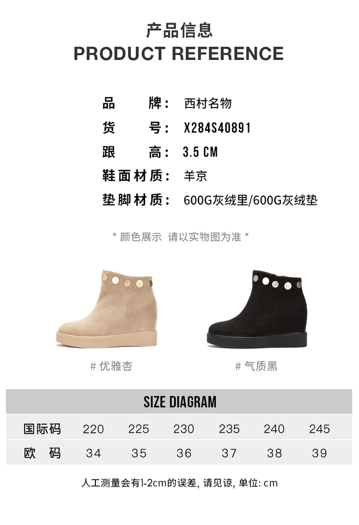 西村名物冬季新品加绒加厚时髦内增高冬靴X284S40891