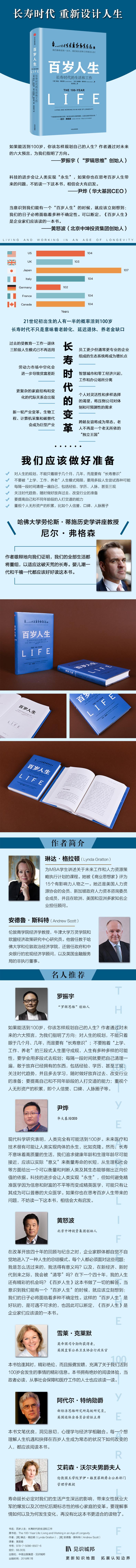 ■主流媒体和学界、商界、政界人士一致好评。《经济学人》《伦敦商学院评论》《卫报》《哈佛商业评论》《财富》《新科学家》《商业记者》以及美国广播公司和小企业趋势网站等媒体热烈推荐。《伦敦商学院评论》书评如此总结本书:“《百岁人生》为每一个生活在其中的个人,为全力一搏从而扭转现状的企业,为不得不应对长寿引发后果的政府描绘了一幅巨大的世界图景。”