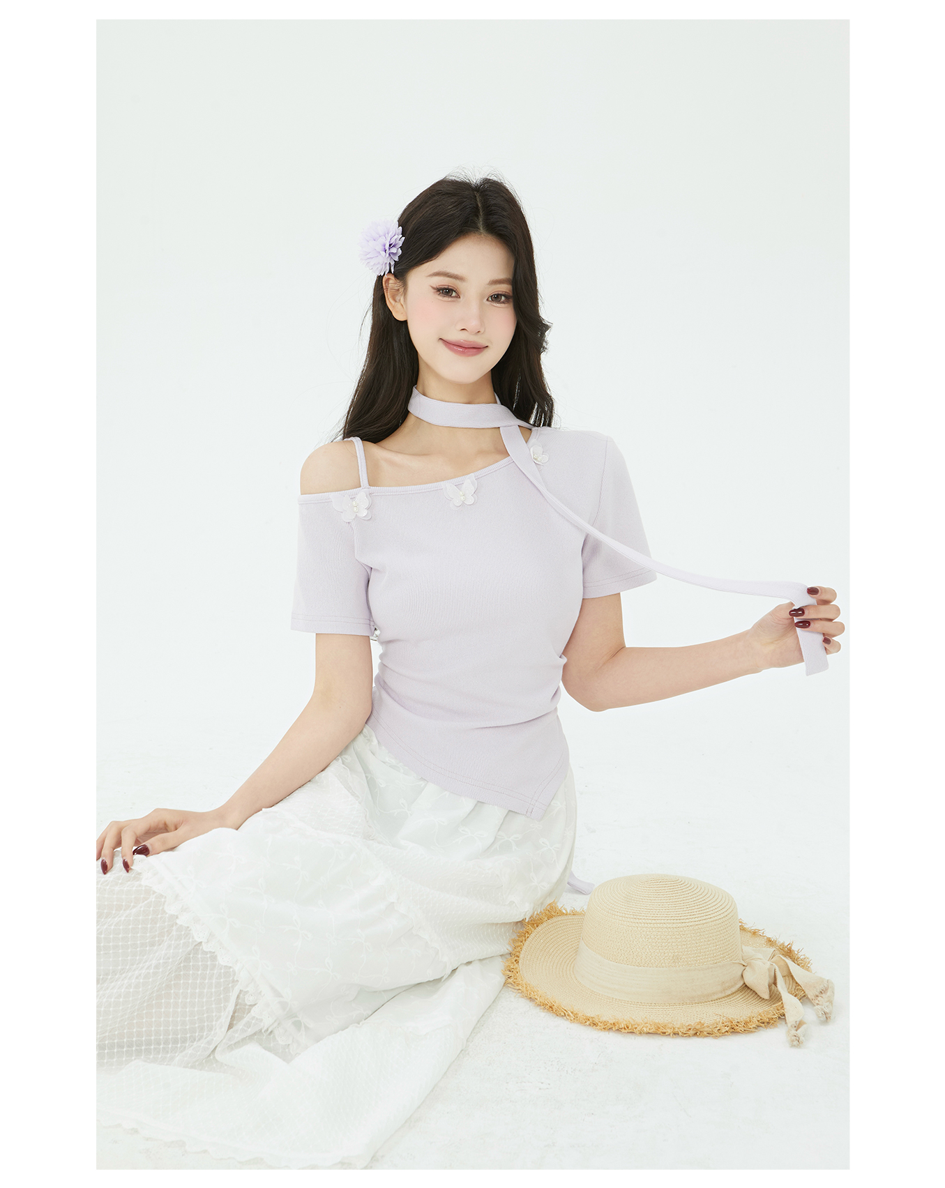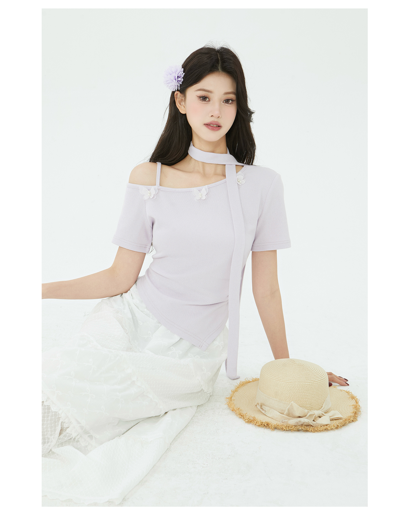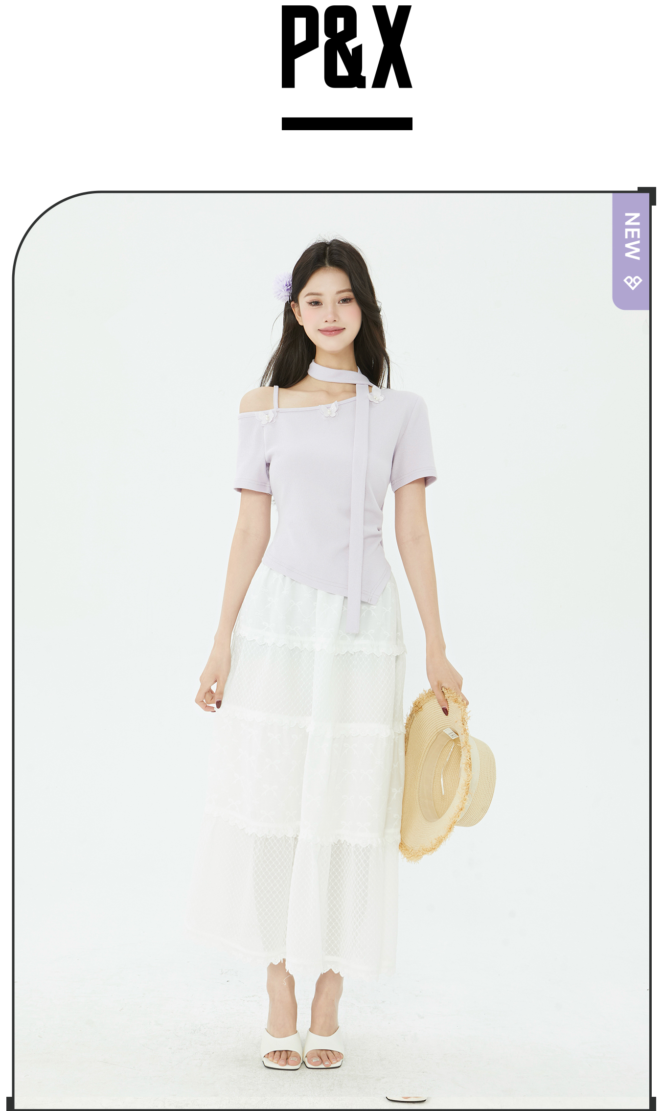 P&X设计师2025夏季新修身斜肩蝴蝶甜美设计感T恤 825202236 紫色