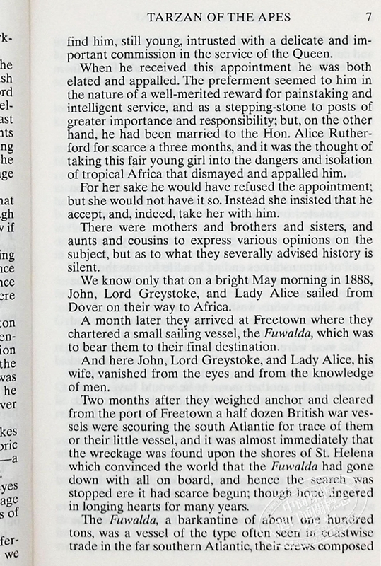 《人猿泰山》是美国科幻小说中的经典之作。英国勋爵带着怀孕的夫人去非洲赴任,不料途中船员哗变,夫妇俩被抛弃在茂密的非洲原始森林。不久孩子降生,而勋爵夫妇却不幸惨遭人猿突袭双双丧生。母猿格拉收养了这个后来被称作“泰山”的孩子。泰山在格拉的精心呵护下成长,他不仅学会了在森林中的生存本领,同时还具有人类特有的聪明和智慧,长大后的泰山成了人猿部落的首领。泰山平静的生活终于随着一支美国人类探险队的闯入而被打破,他爱上了探险家的女儿珍妮。之后,泰山的生活发生了巨大变化,并衍生出许多传奇的故事。小说悬念丛生,高潮迭起。该书自出版以来,被译成世界上几十种文字,并曾经先后多次被改编成电影、电视剧和动画片。