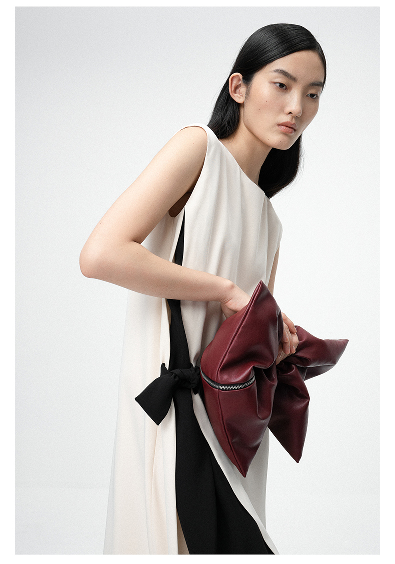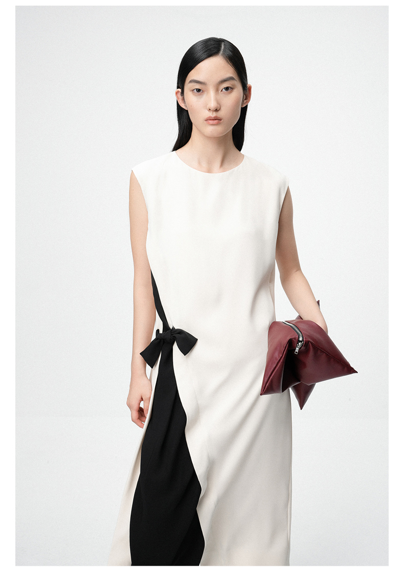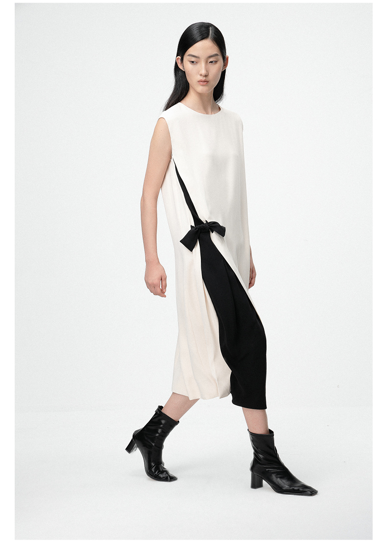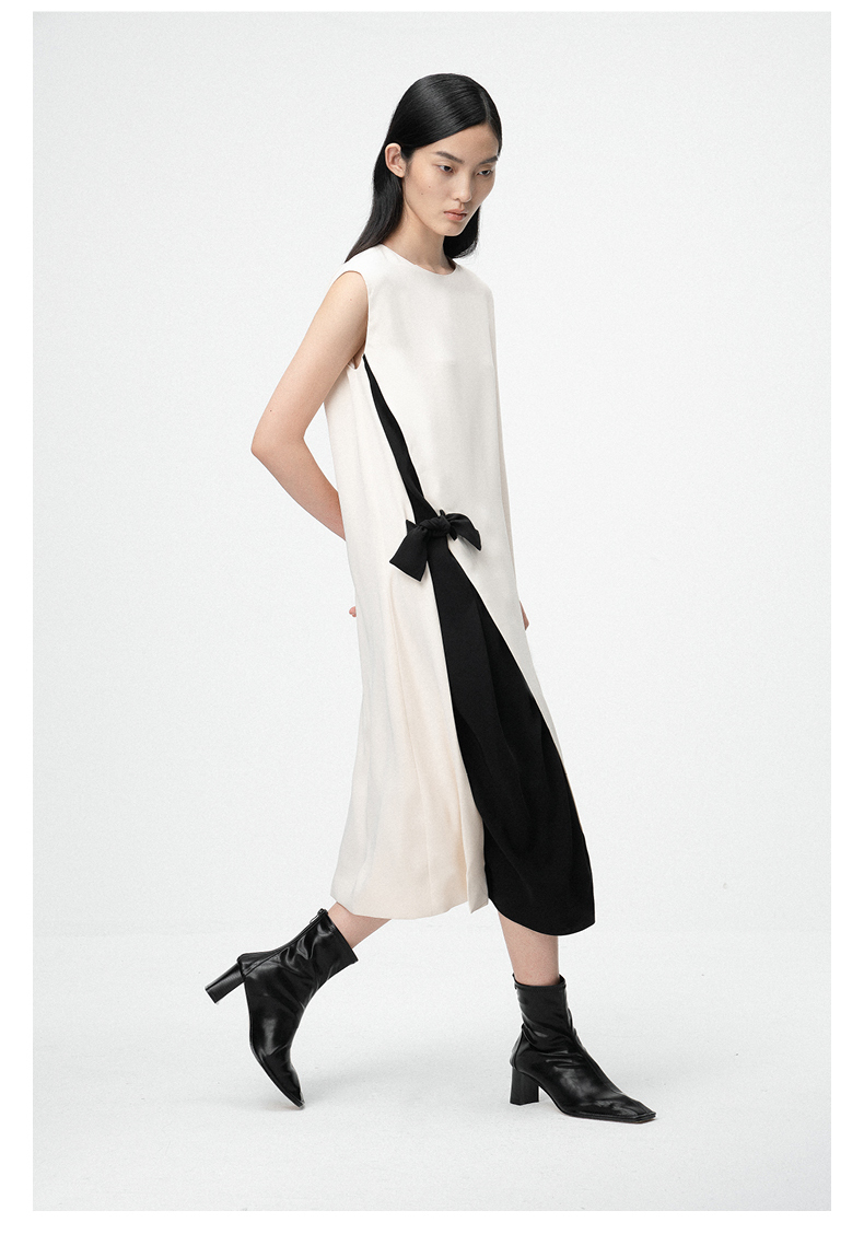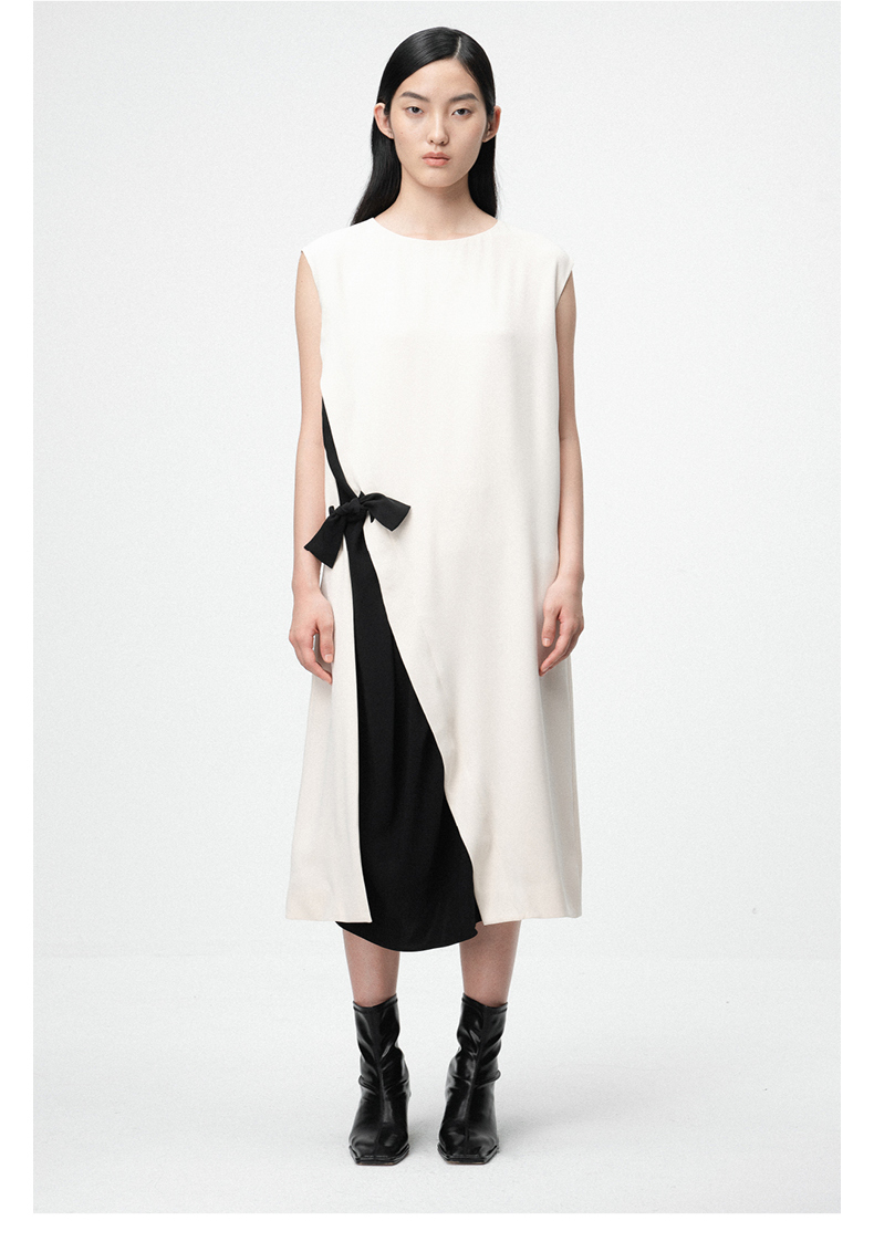 【奥萝拉】米白拼缝黑色蝴蝶结落肩宽松连衣裙/0000743