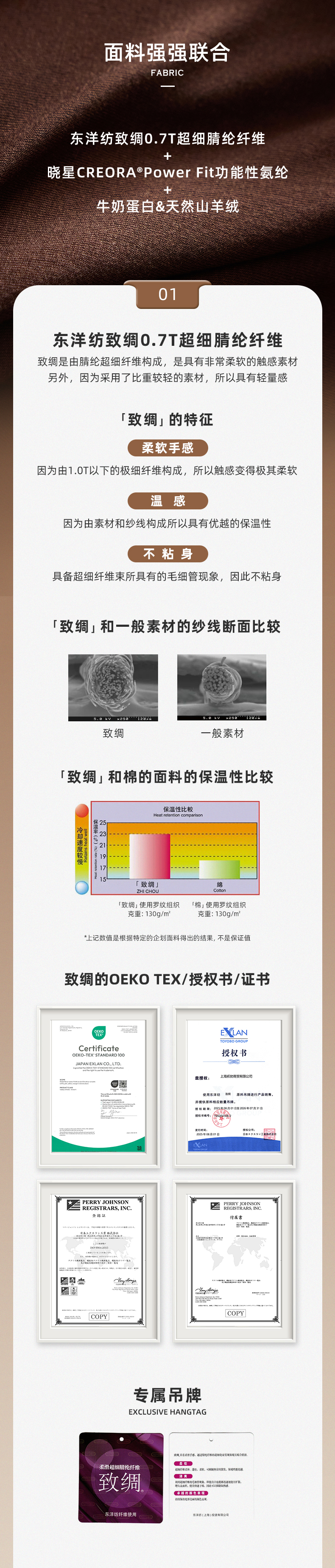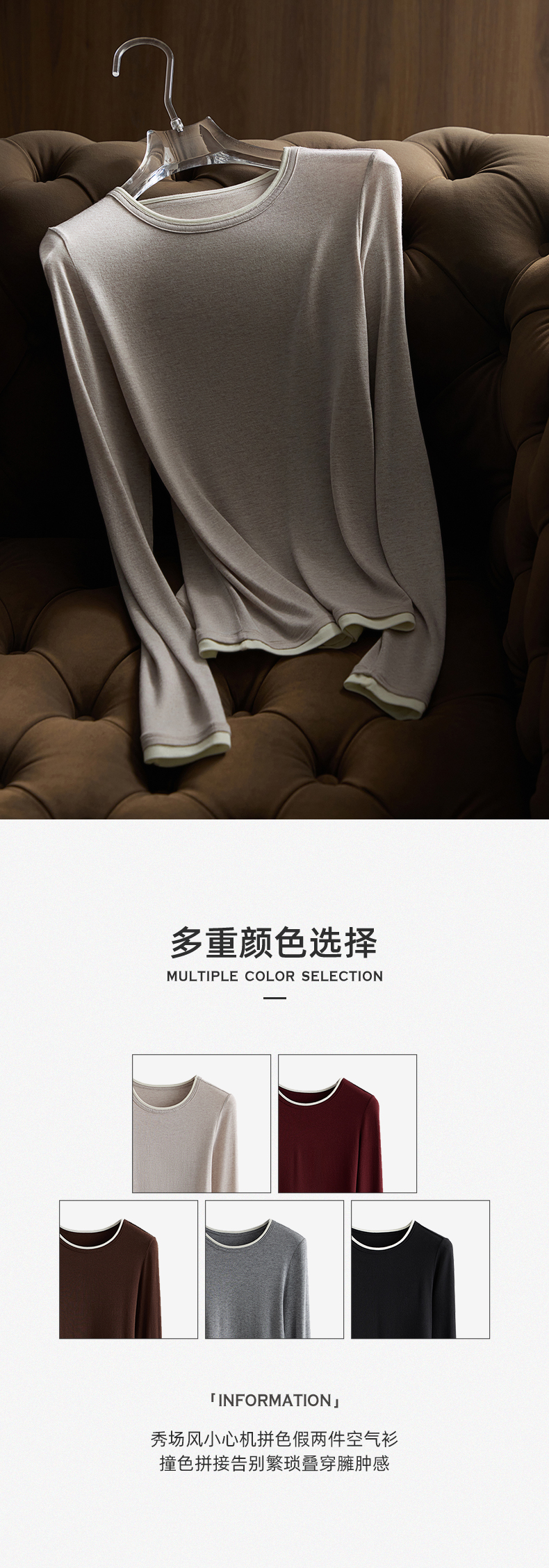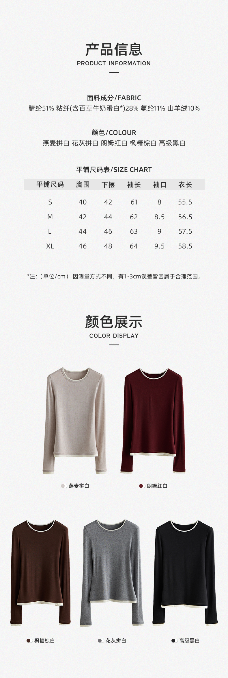 日本进口东洋纺致绸牛奶蛋白山羊绒自发热假两件长袖t恤 撞色拼接设计 手感柔软,经典圆领修饰脖颈曲线;150g克重轻膨体面料,自带高级微光泽感