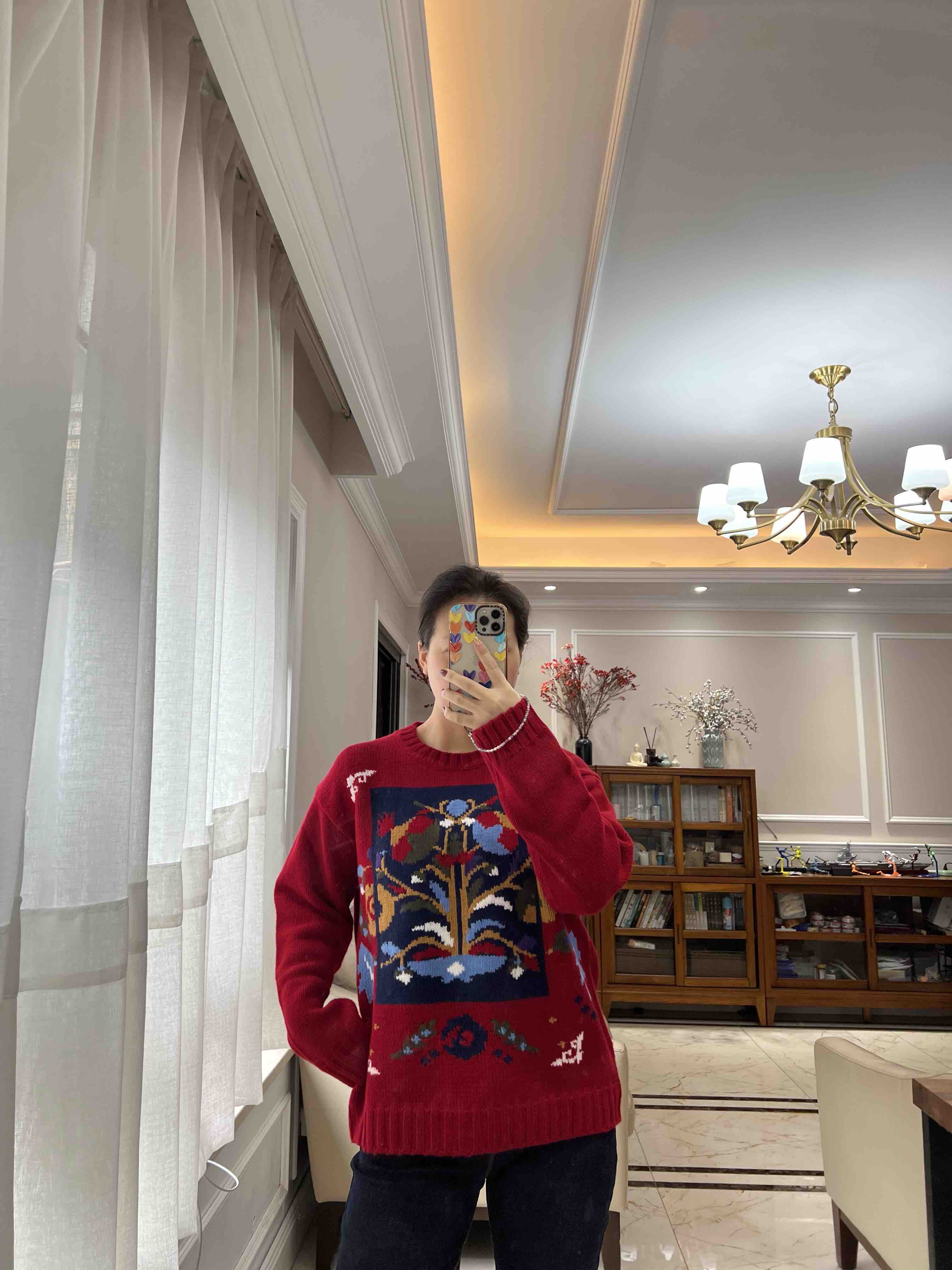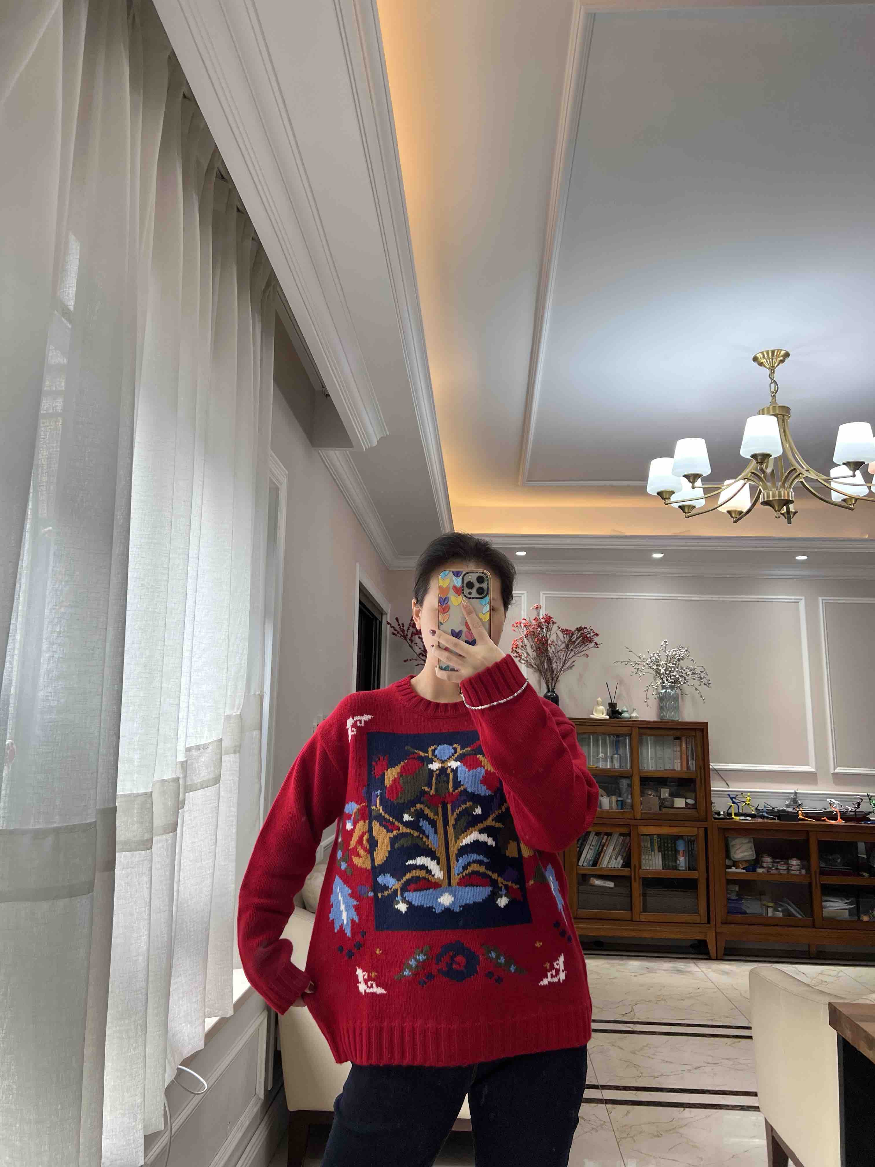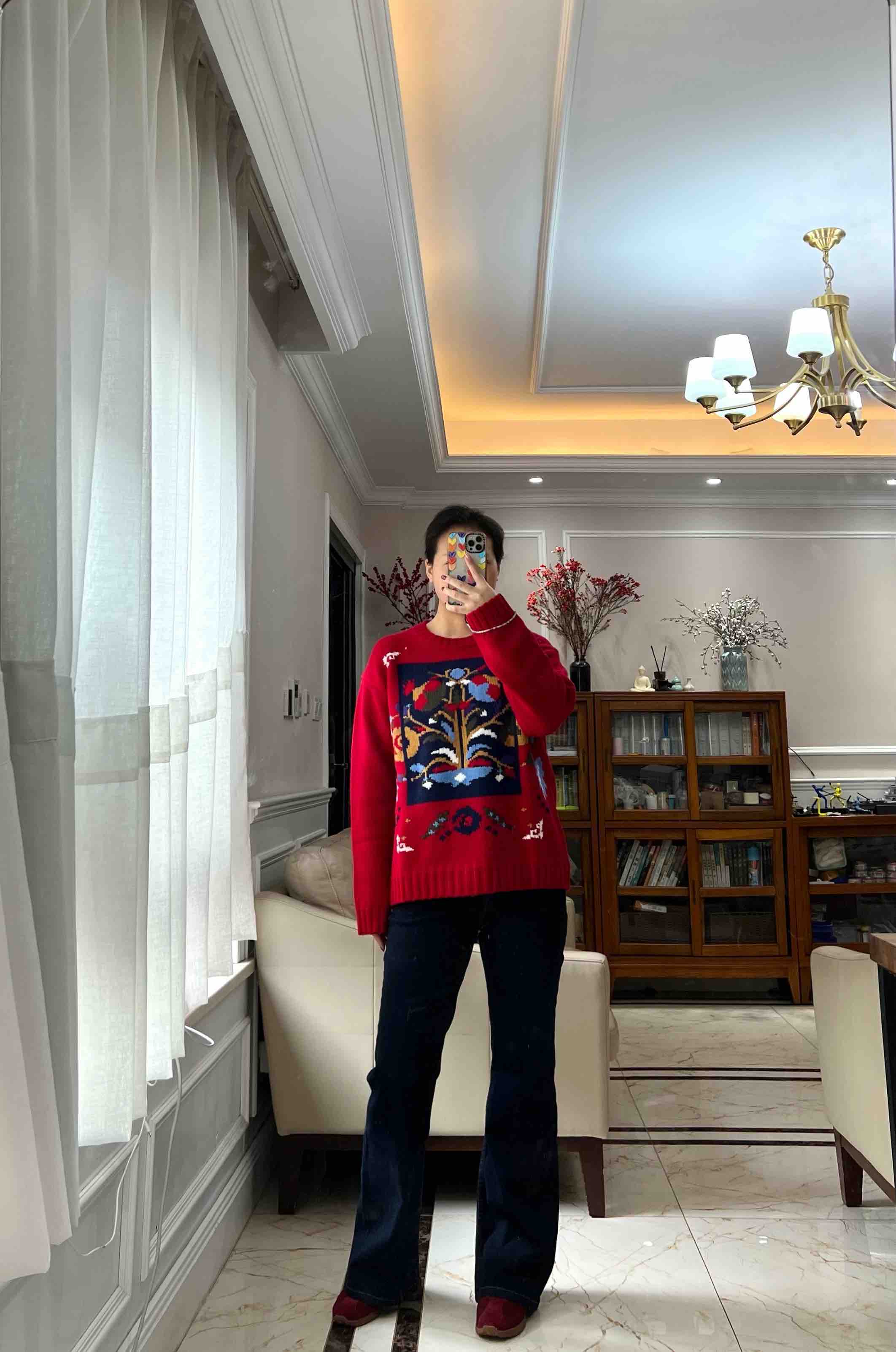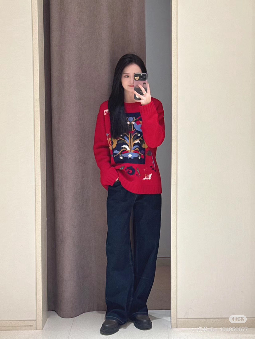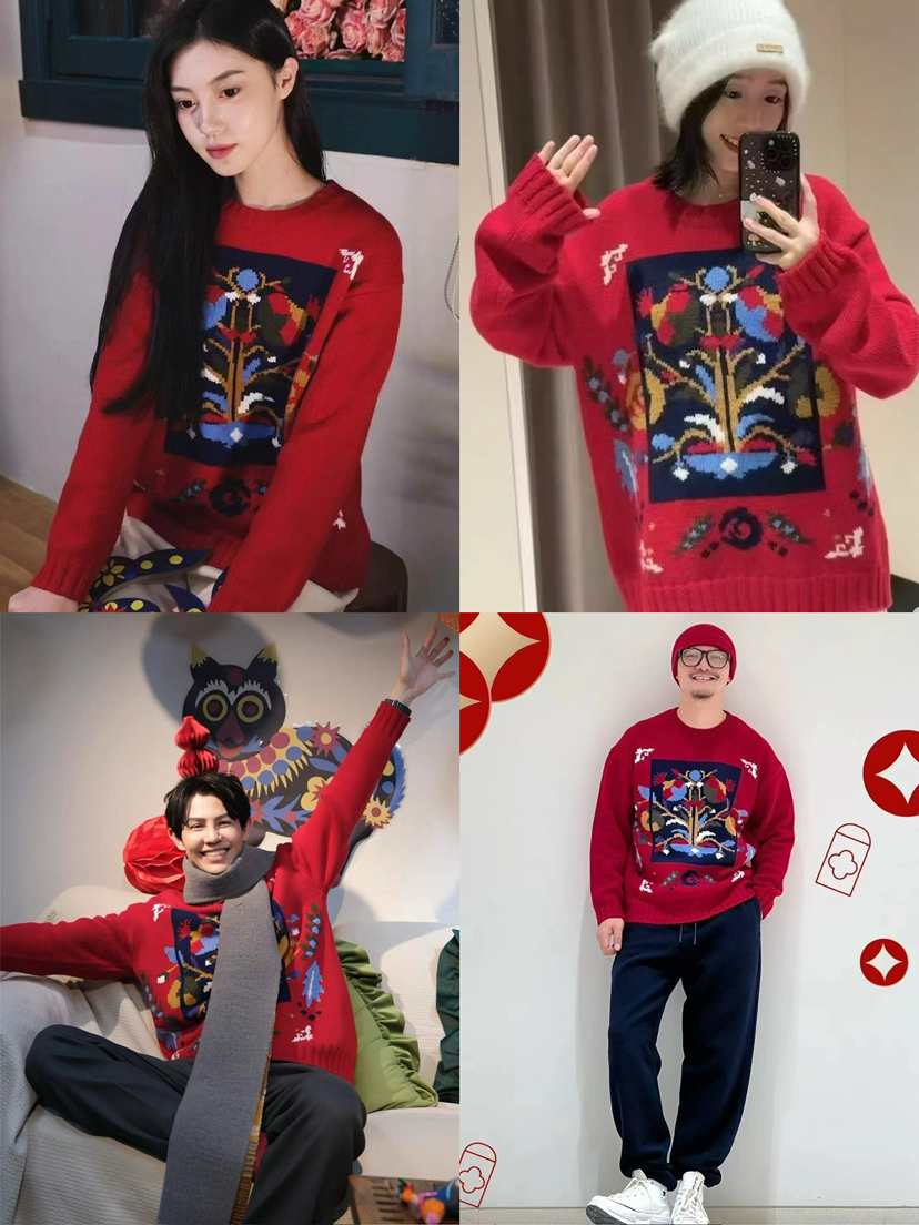 百分百绵羊毛,重磅针织,蓬松的手感,温暖立体的质感,古典民间的剪纸元素点缀,传达了福寿三多的新春寓意