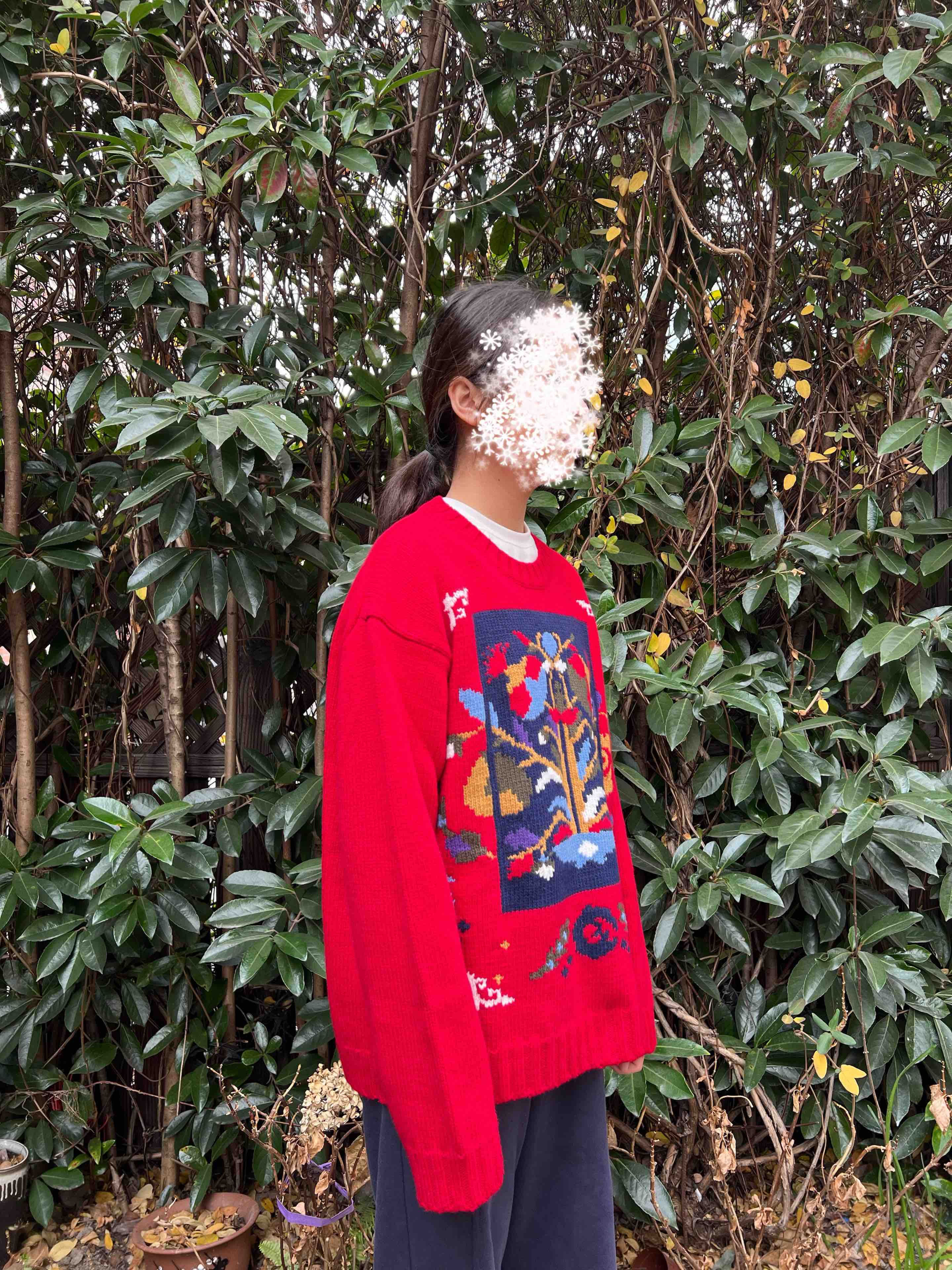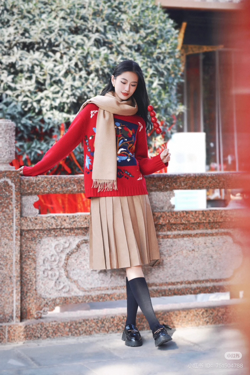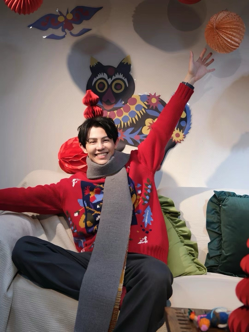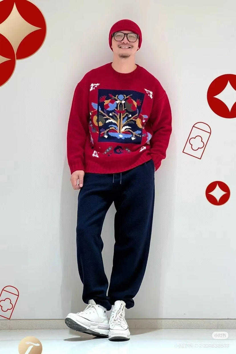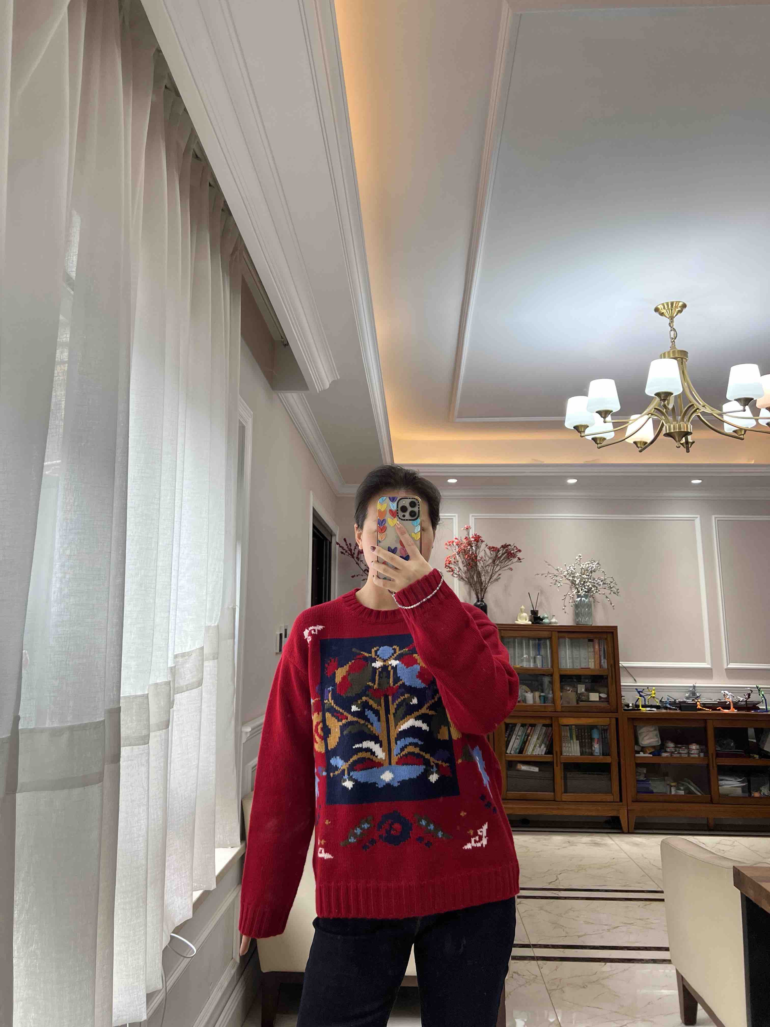 百分百绵羊毛,重磅针织,蓬松的手感,温暖立体的质感,古典民间的剪纸元素点缀,传达了福寿三多的新春寓意