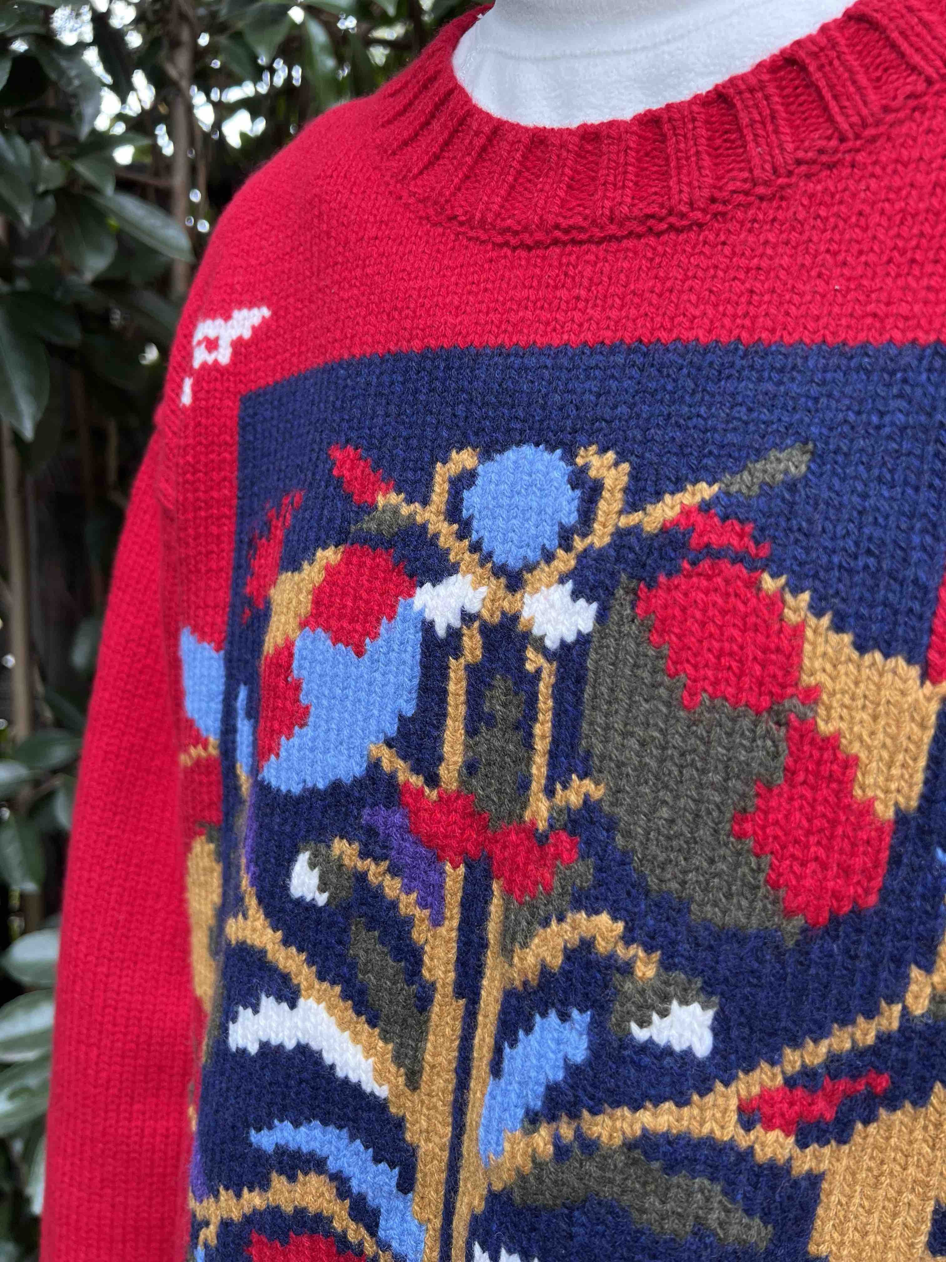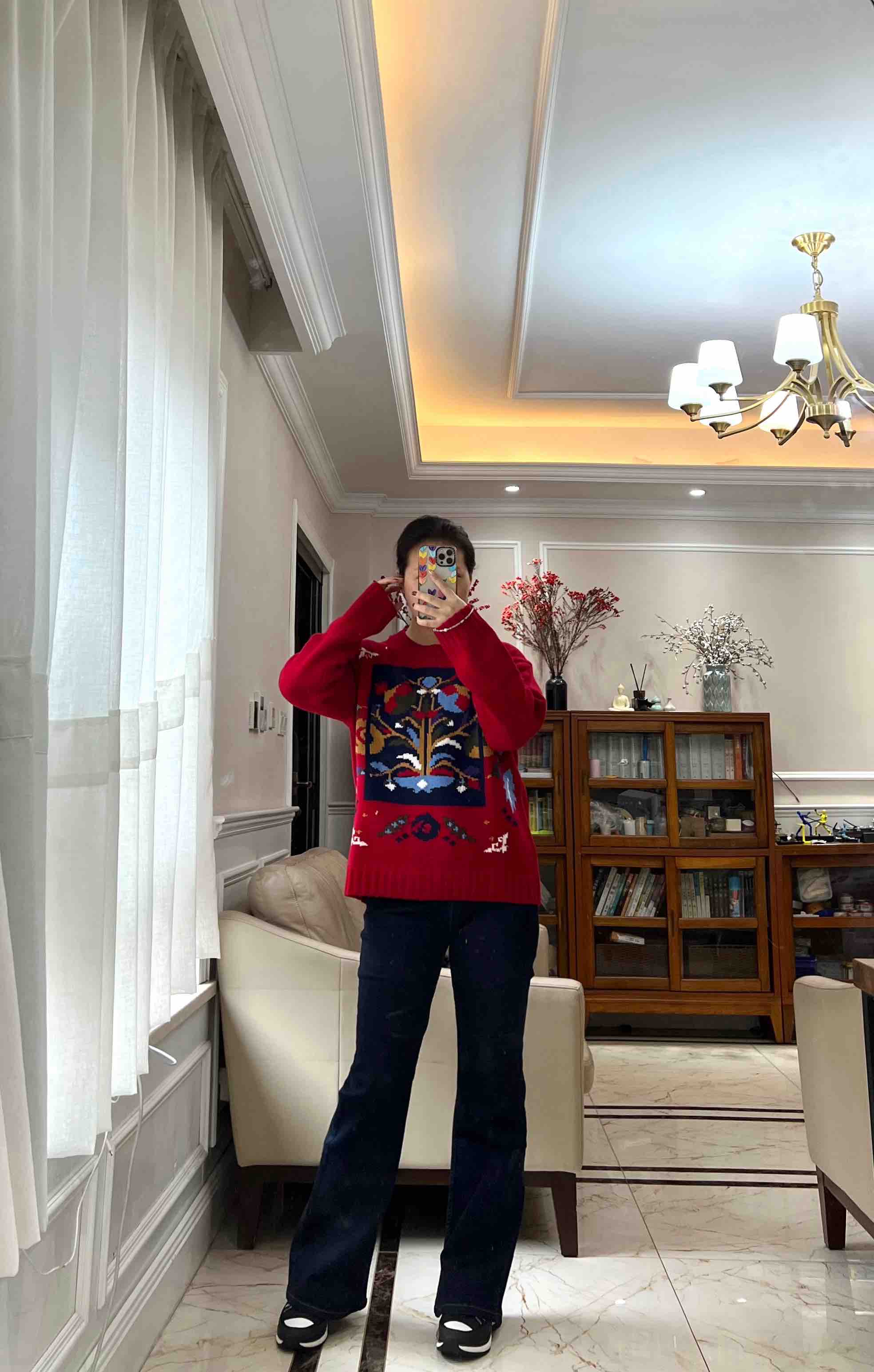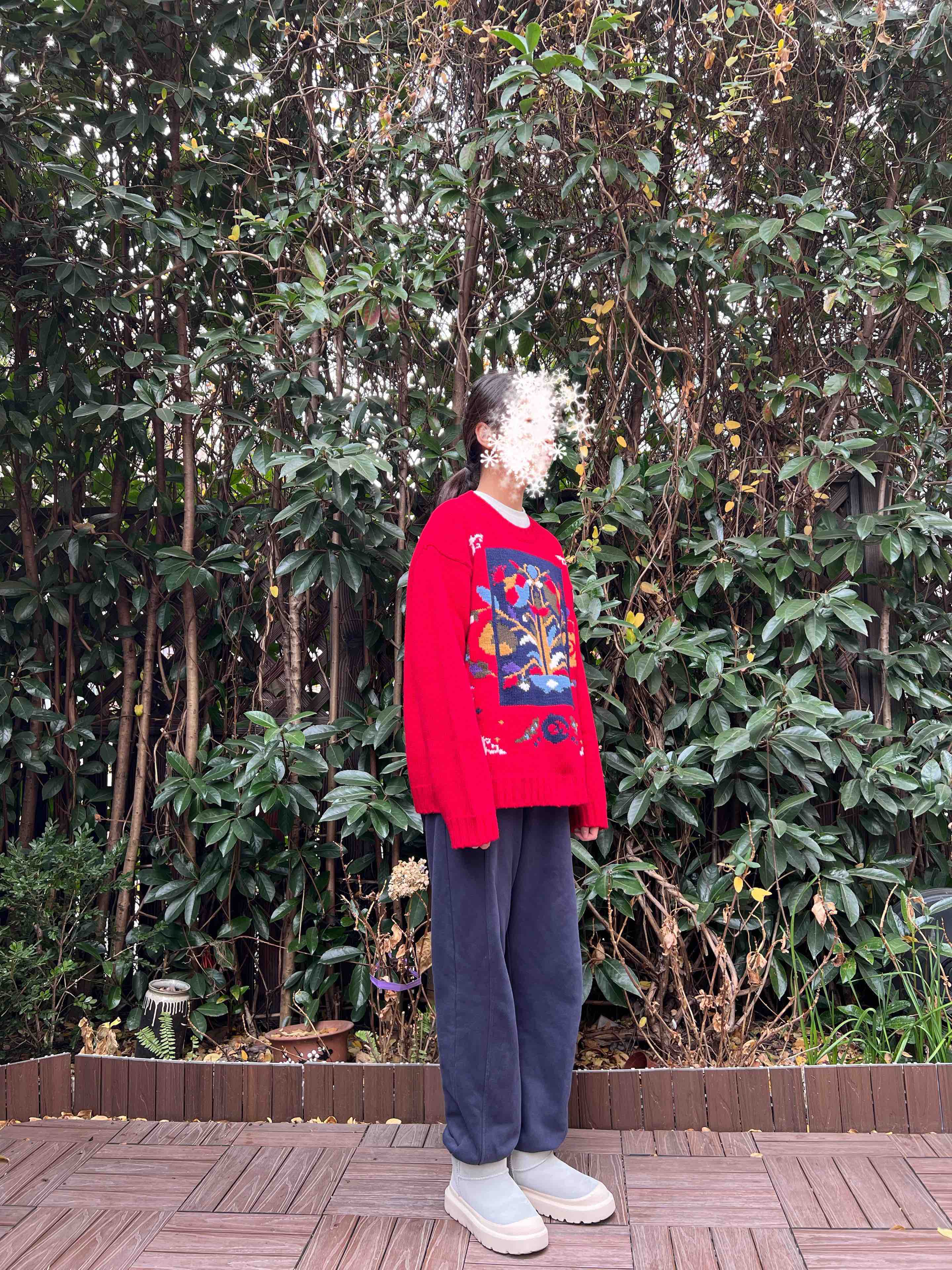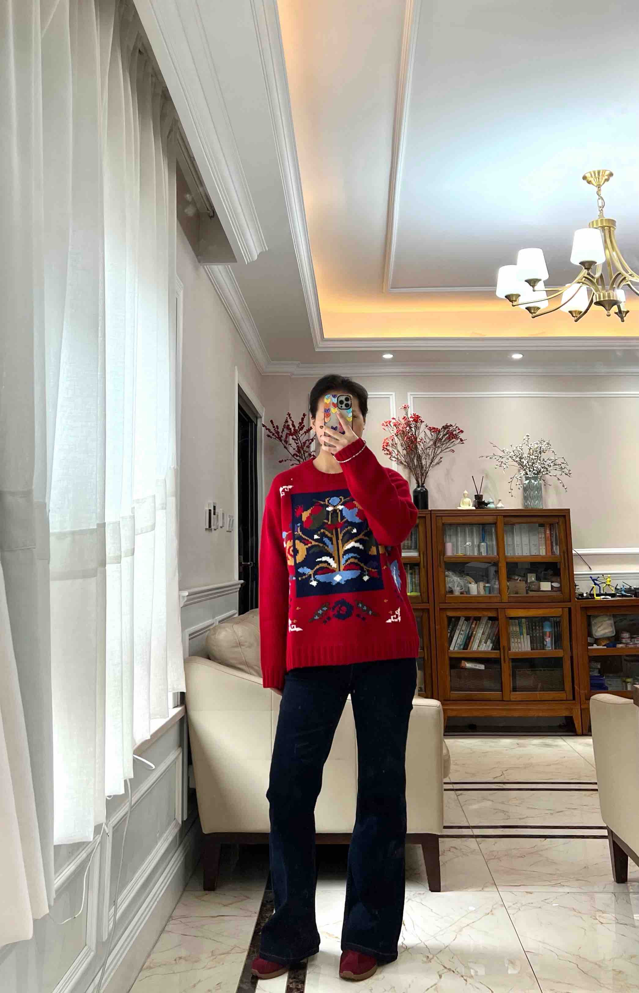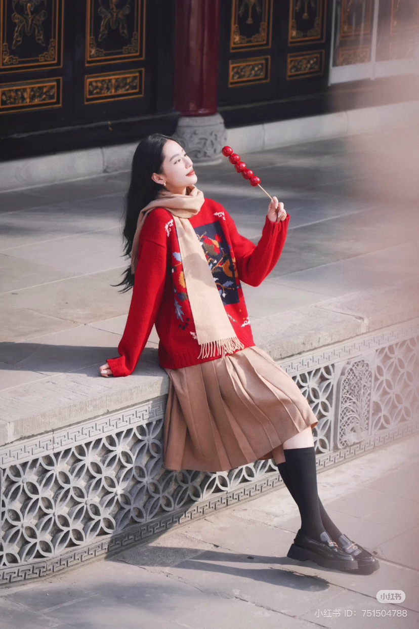 百分百绵羊毛,重磅针织,蓬松的手感,温暖立体的质感,古典民间的剪纸元素点缀,传达了福寿三多的新春寓意