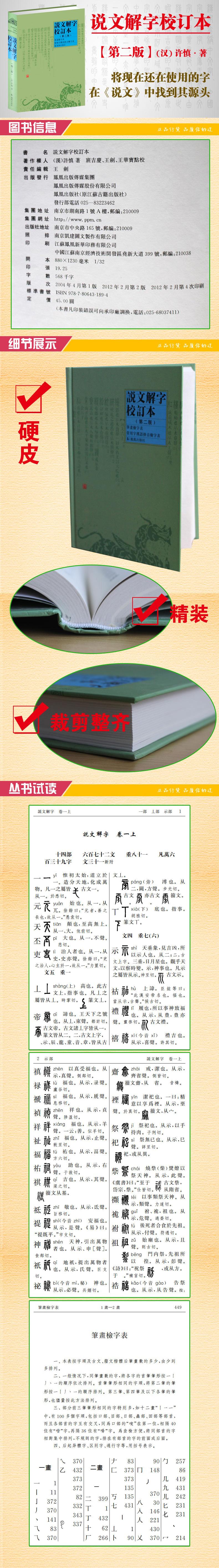 许慎著的《说文解字校订本(第2版)(精)》以清同治十二年(工873)?昌治刻本(以下???本)?工作底本,以清嘉?十四年(1809)?星衍覆刊宋刻大徐本(以下???本)?主校本,?考段玉裁《?文解字注》,桂馥《?文解字??》,王筠《?文句?》、《?文?例》,朱??《?文通?定?》等古代《?文》大家的著作,以及今人的研究成果,?行??、校勘。
