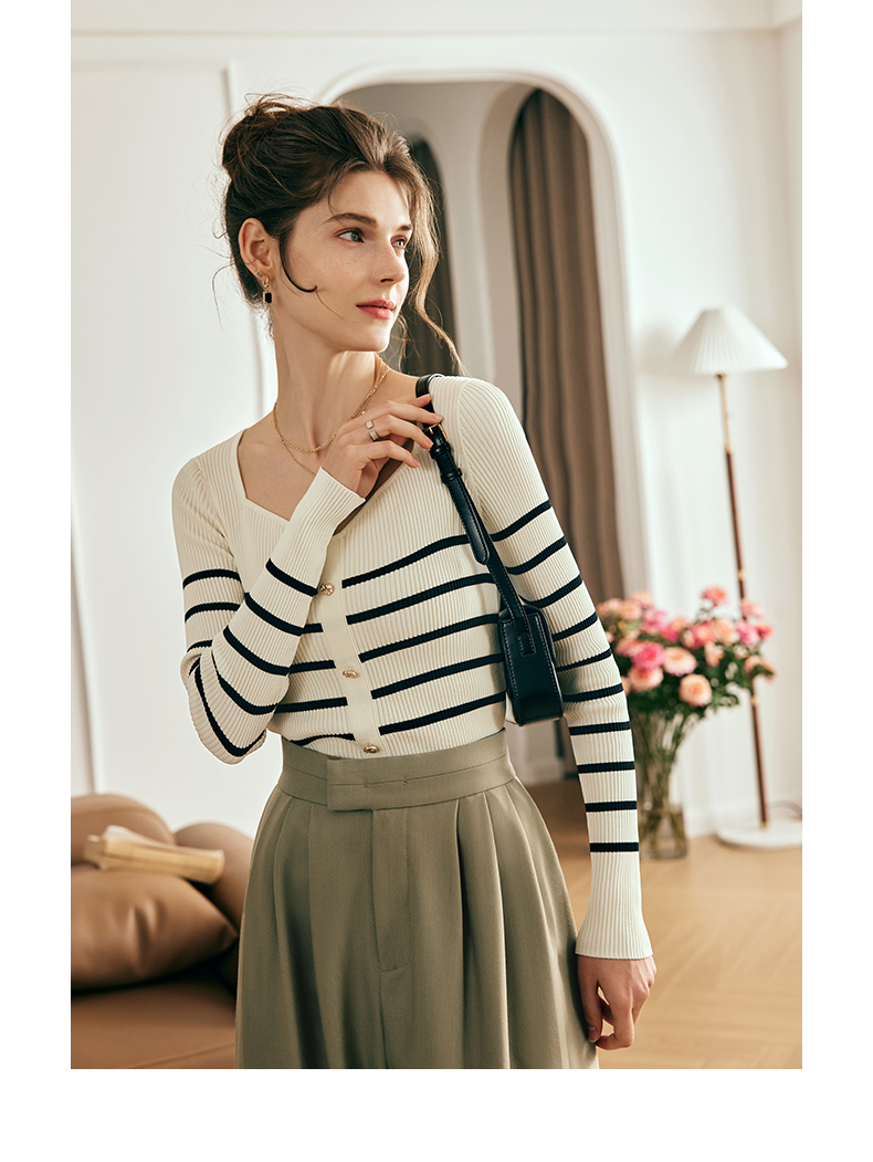 OLrain欧芮儿法式方领条纹针织衫女夏季2023年新款修身撞色套头衫
