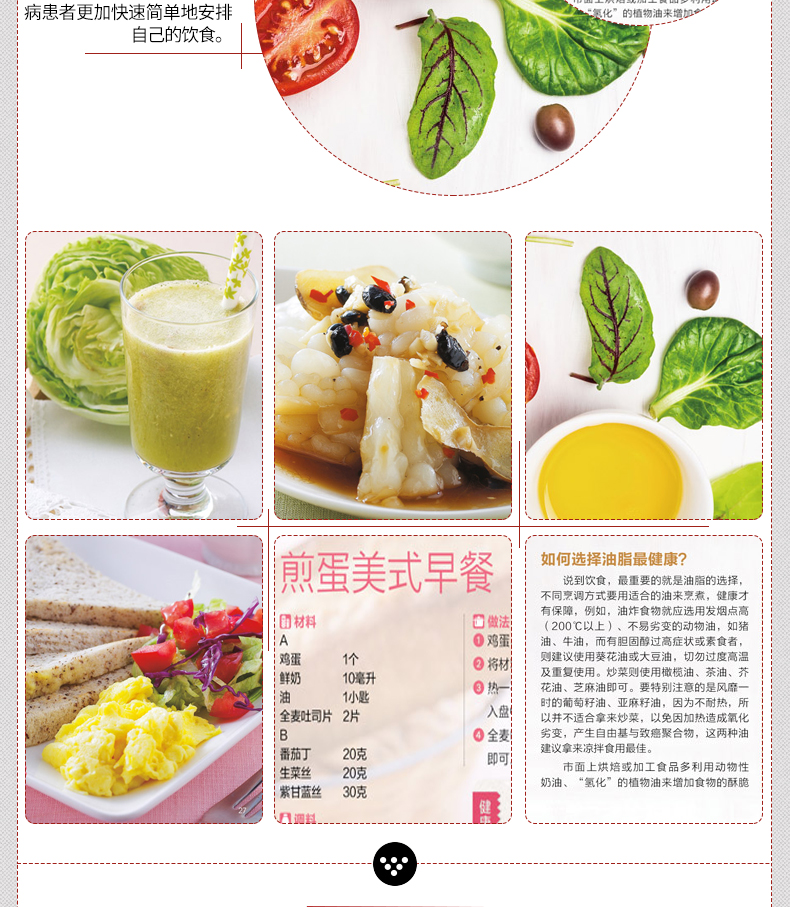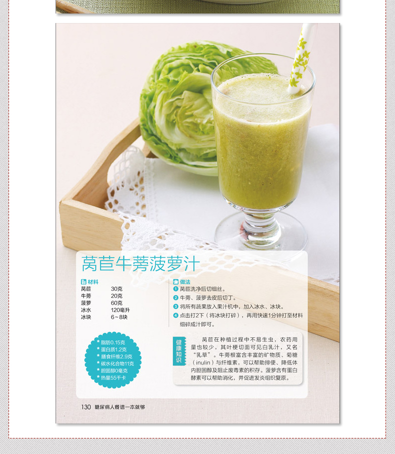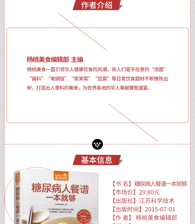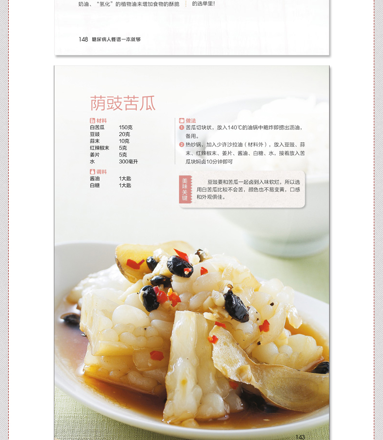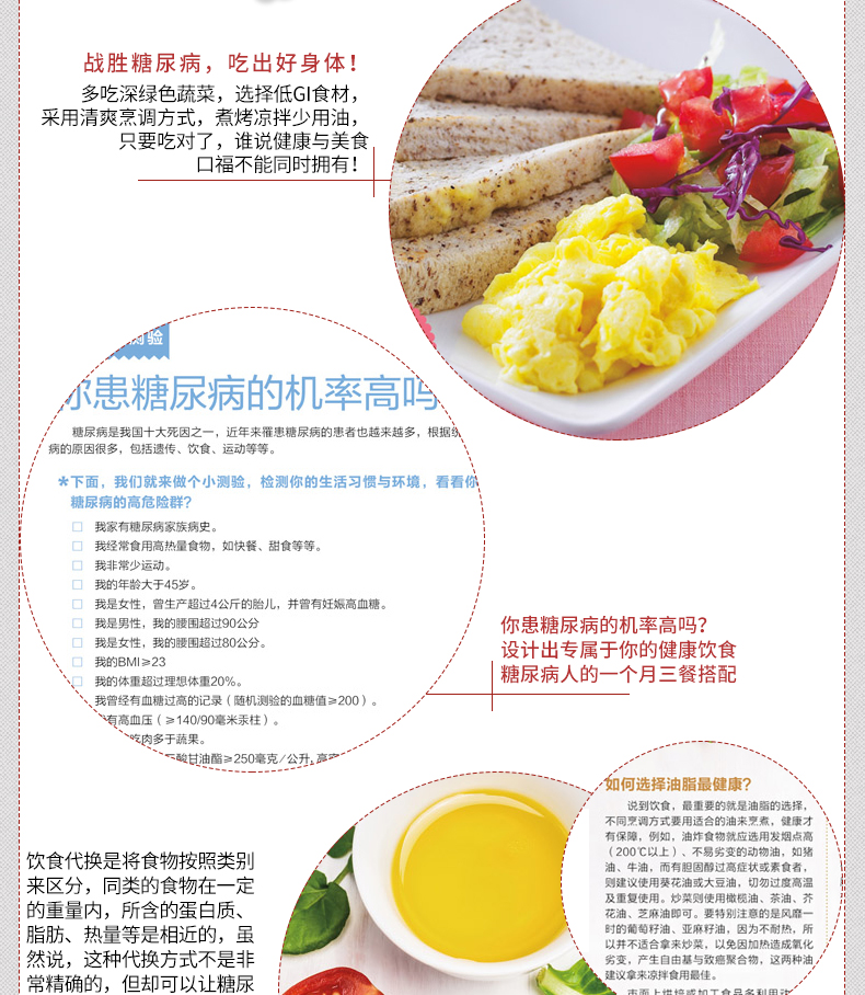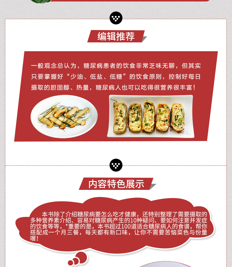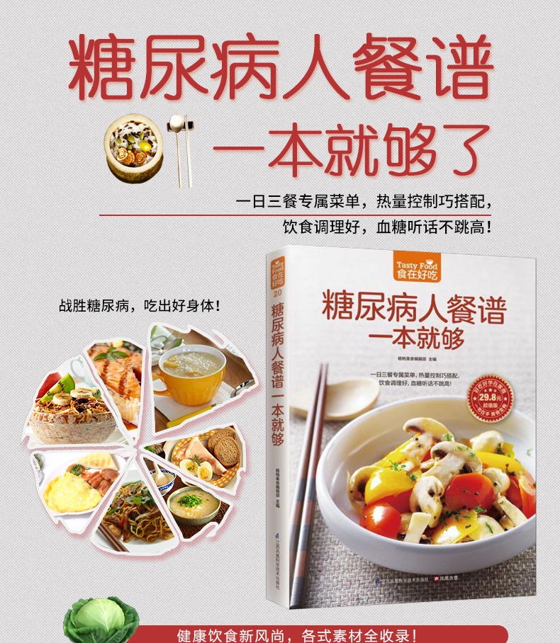 一般观念总认为,糖尿病患者的饮食常乏味无聊,但其实只要掌握好“少油、低盐、低糖”的饮食原则,控制好每日摄取的胆固醇、热量,糖尿病人也可以吃得很营养很丰富!更多精彩美食好书请点击这里:经典家常粤菜一本就够(在家也能烹制的粤式美食)女性养生膳食谱263例(爱上膳,养生、养颜又养心!)川湘菜客家菜一本就够(近200 道特色川湘菜、客家菜,就是这个味儿!)人气料理分分钟一学就会(一本书满足全家人的营养需求!)