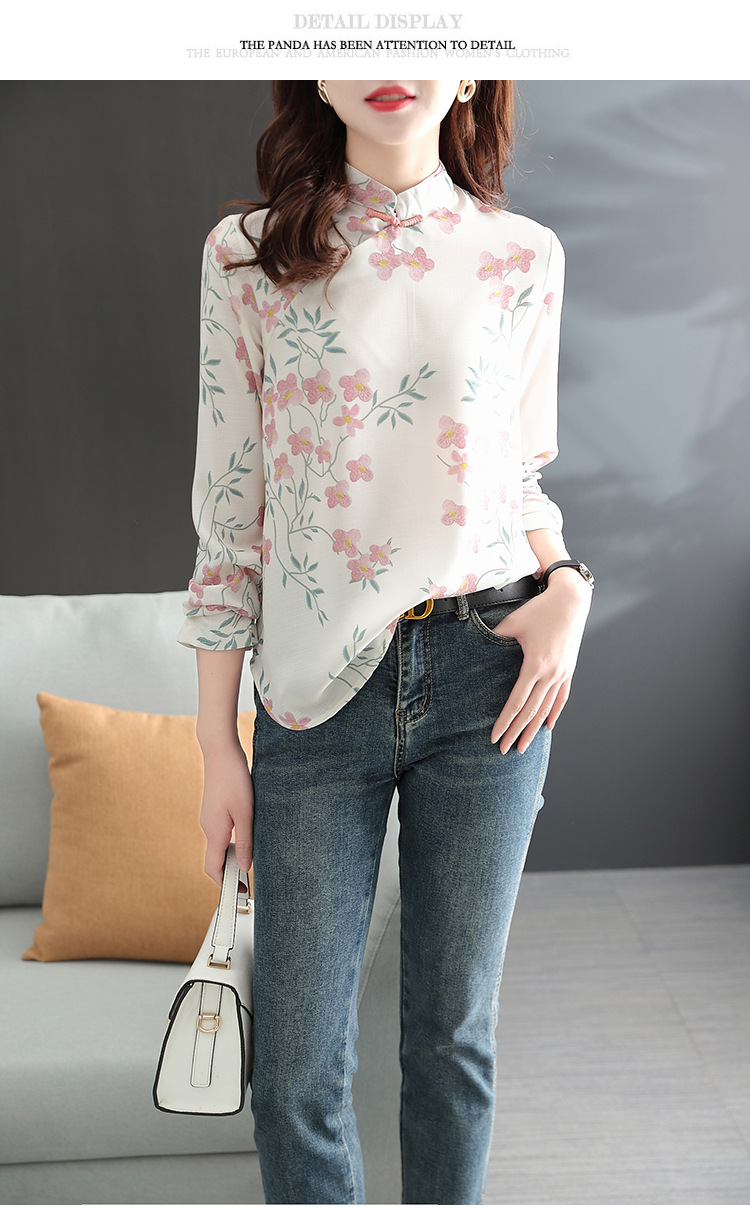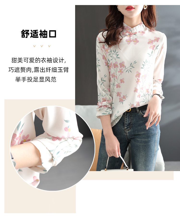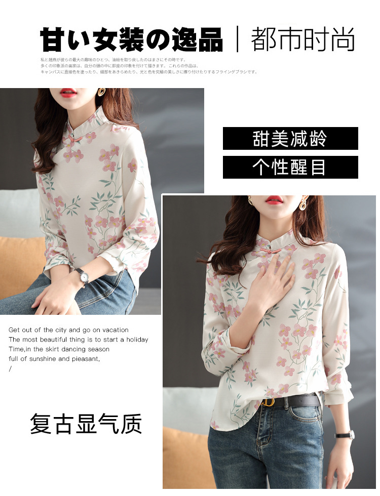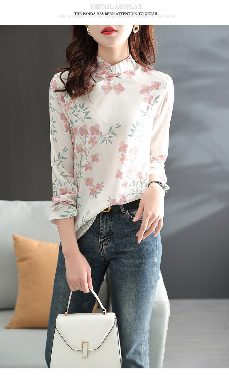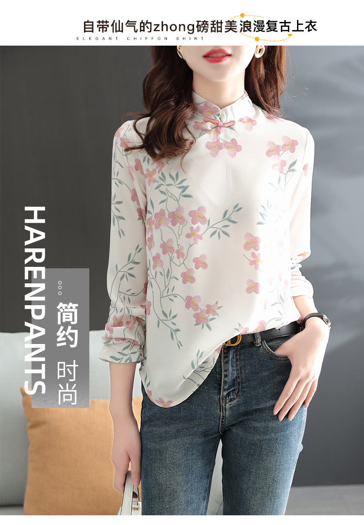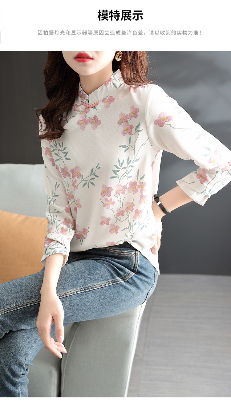 中式改良旗袍上衣女春秋中国风复古立领气质盘扣印花刺绣长袖衬衫 YX2051