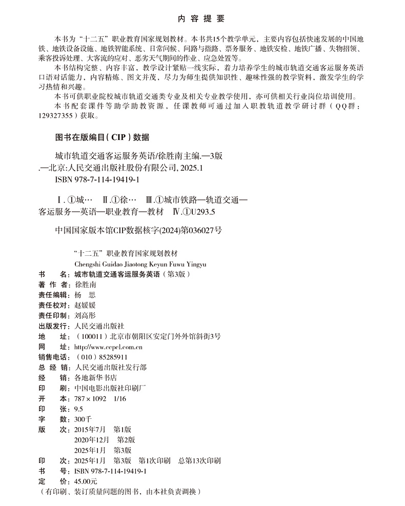 书名:城市轨道交通客运服务英语(第3版)