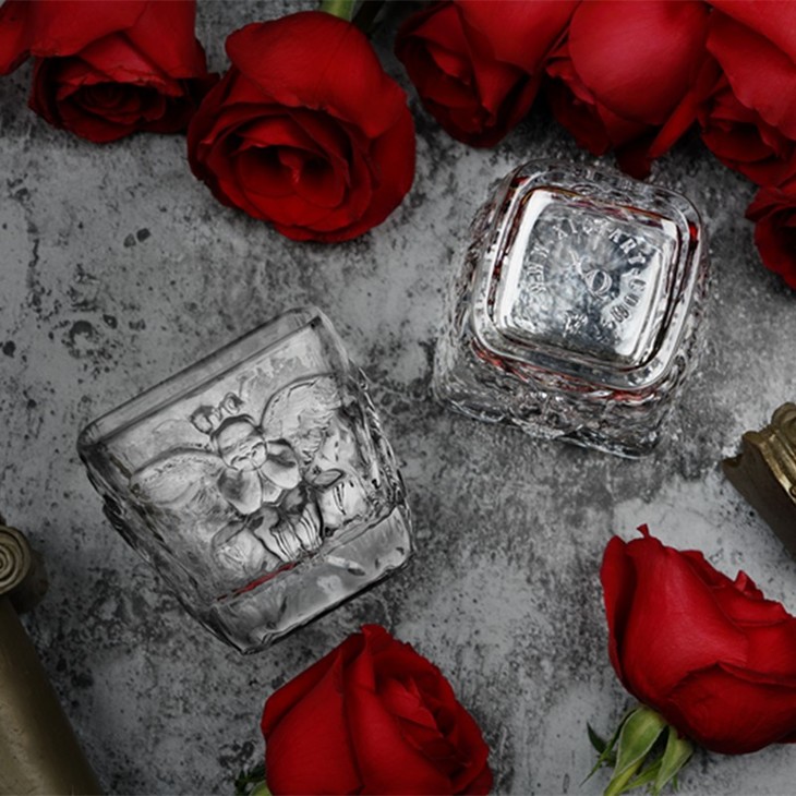 罗马之心方形威士忌杯“Heart of Rome Collection”Angel Old-fashioned Whiskey Glass (square-shaped)。这是一款灵感源自欧式风格建筑中的代表——罗马柱(Marble Pillar)式方形古典威士忌酒杯。2018年新年伊始,稀奇艺术“一杯子”家族将这个新系列命名为“罗马之心”,寓意浪漫唯美的古典装饰主义。首款方形威士忌酒杯,是由稀奇艺术的经典《彩虹天使》与花叶装饰相簇而成,它浑身晶莹通透,像盛满鲜花的水晶花篮,外表晶莹华丽,手感厚重,颇具美感。