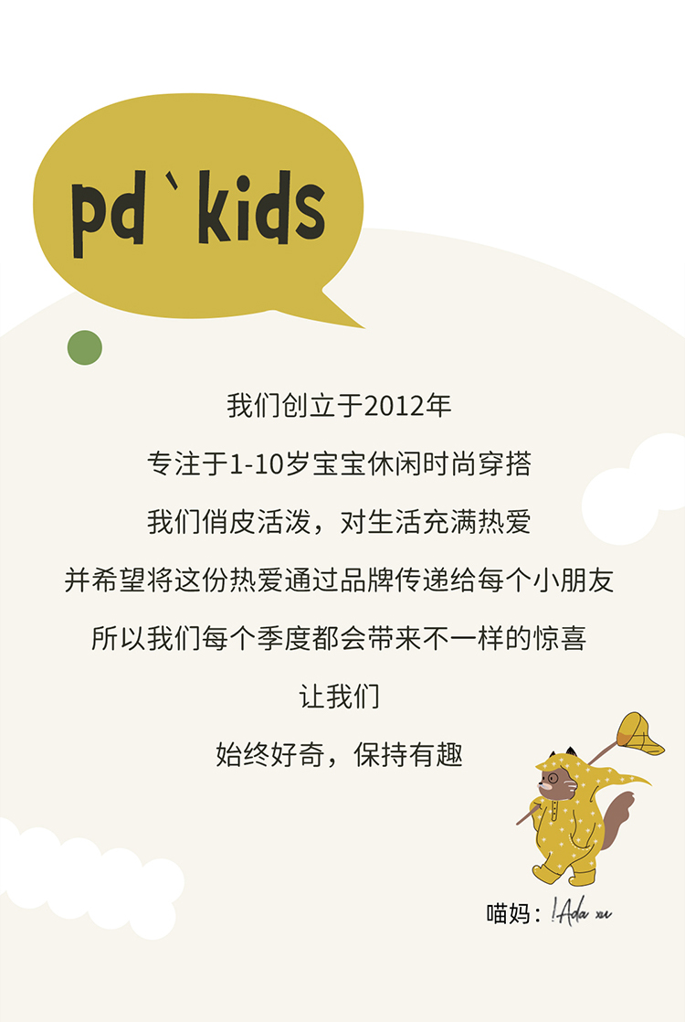 - Purrfect-Diary专注于贴近自然随性的穿着概念,轻奢平价的童装文化传播,在产品设计上更加注重婴童穿着的舒适性、安全性、更出众的国际化品牌,将欧美的育婴文化在中国进行深入的传播与推广。