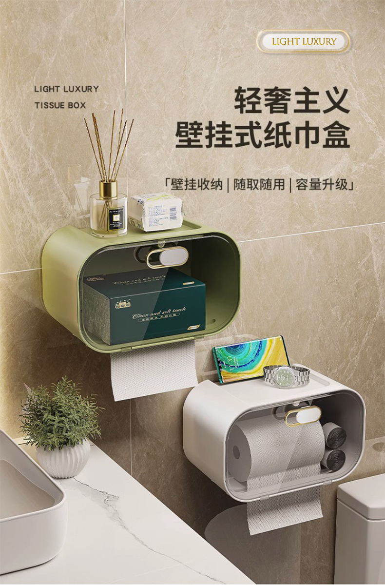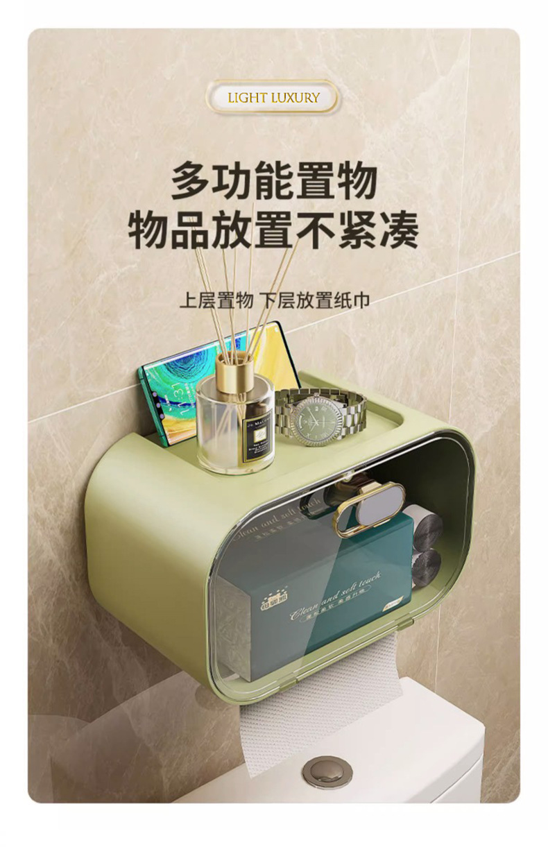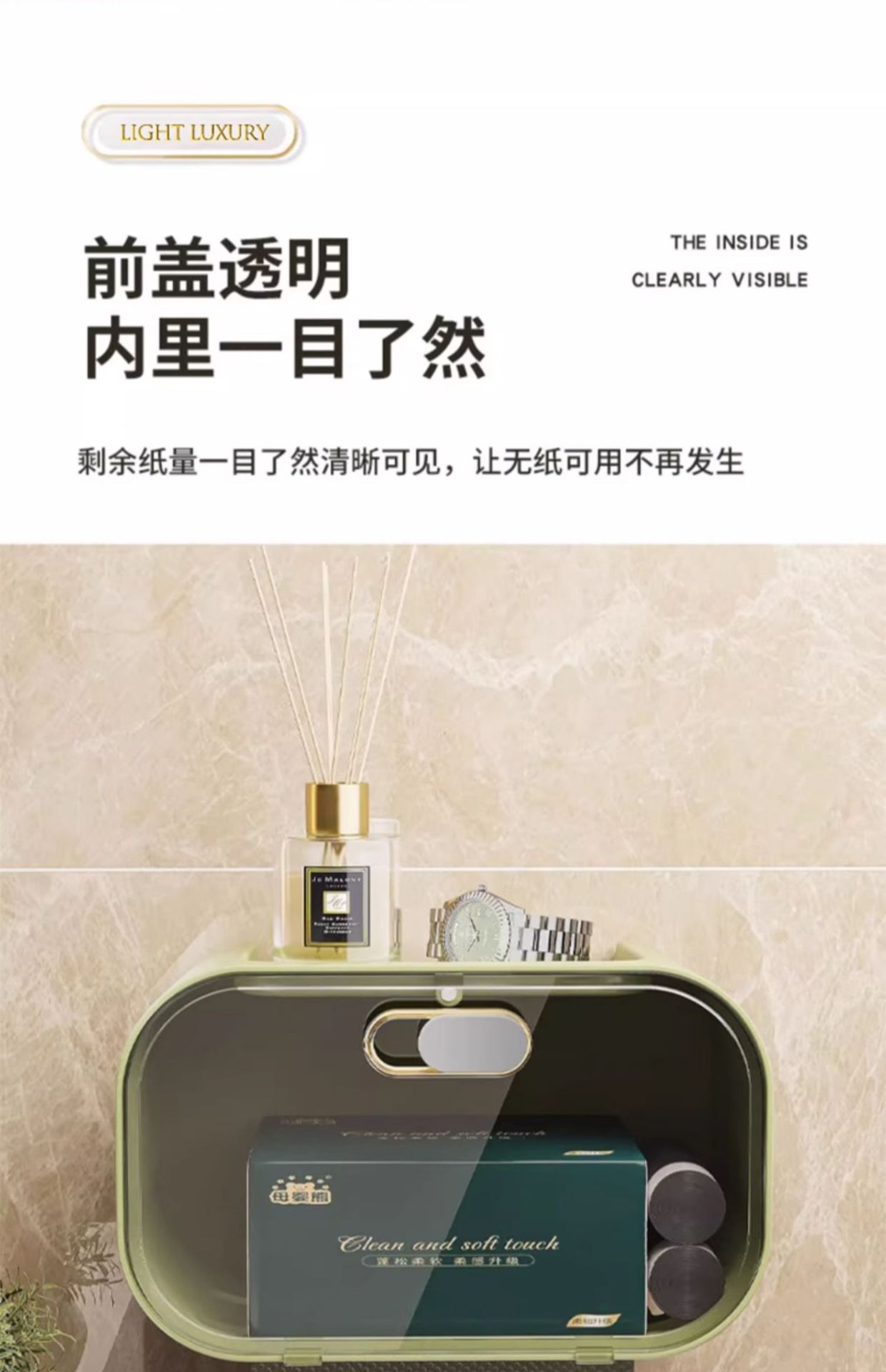 【多功能置物架!壁挂式纸巾盒】卫生间厕所纸巾盒厕纸盒抽纸盒卫生纸置物架卷纸防水壁挂式免打孔,前盖透明 内里一目了然。ry