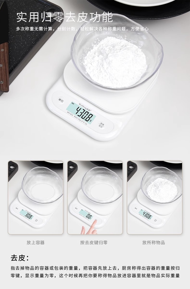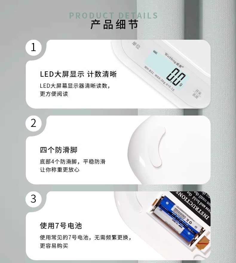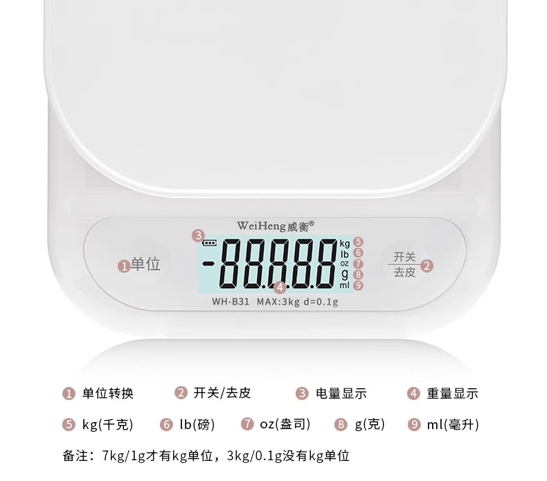 WH-B31 威衡电子秤 白色【3kg/0.1g】电池款 烘焙电子秤