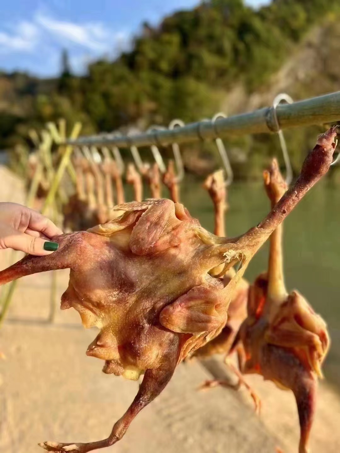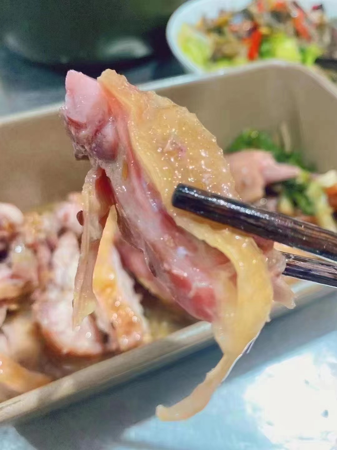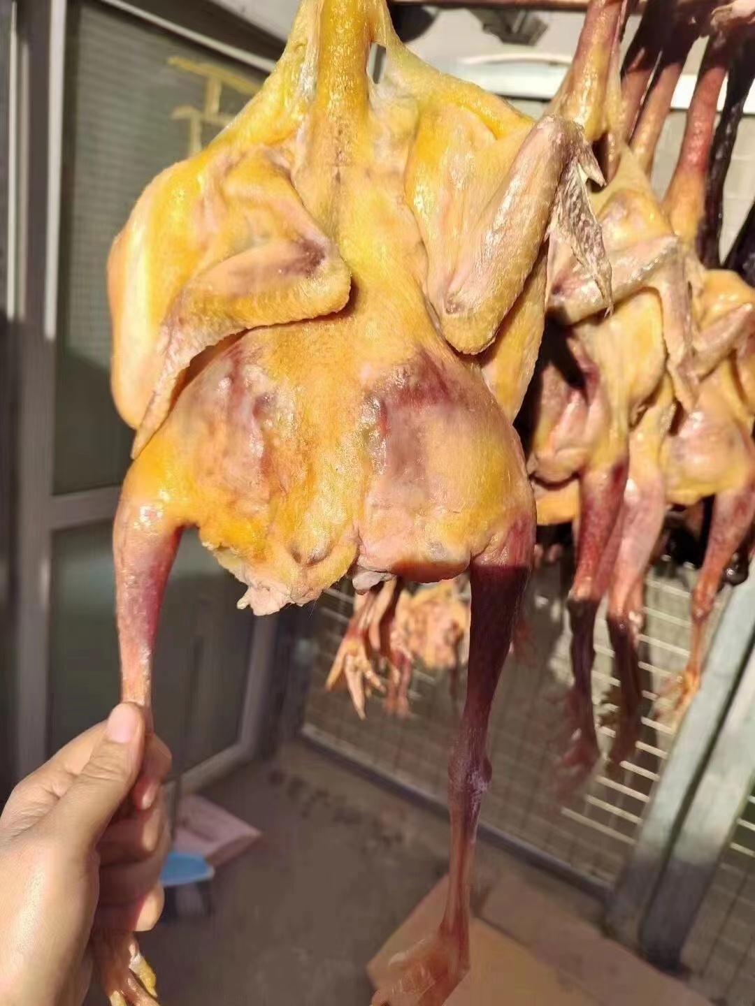 农家风干咸鸡1.7-1.9斤 自然晾晒风干,鸡肉紧实层次分明,鸡皮金黄有弹性,鸡骨咸香入味,风味独特,肉质紧实