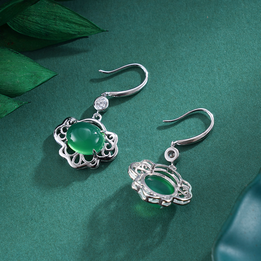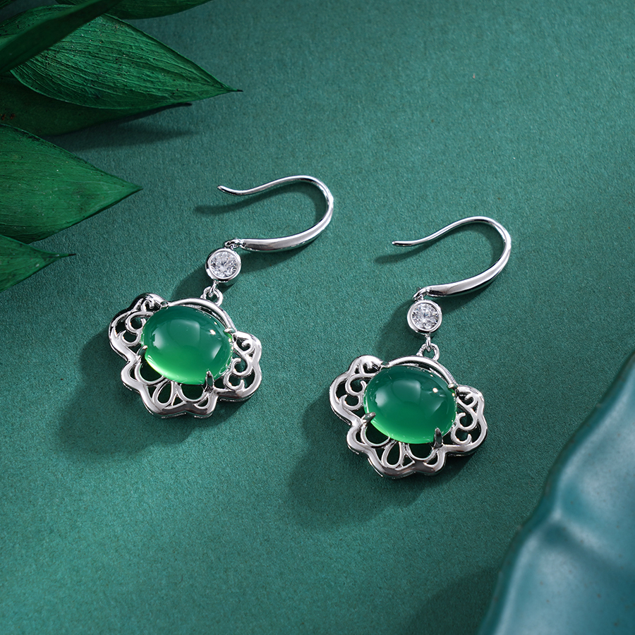 【寓意】:耳饰采用独特的镂空设计,表面镶嵌绿玉髓,立体通透,古韵典雅,增添高贵气质。