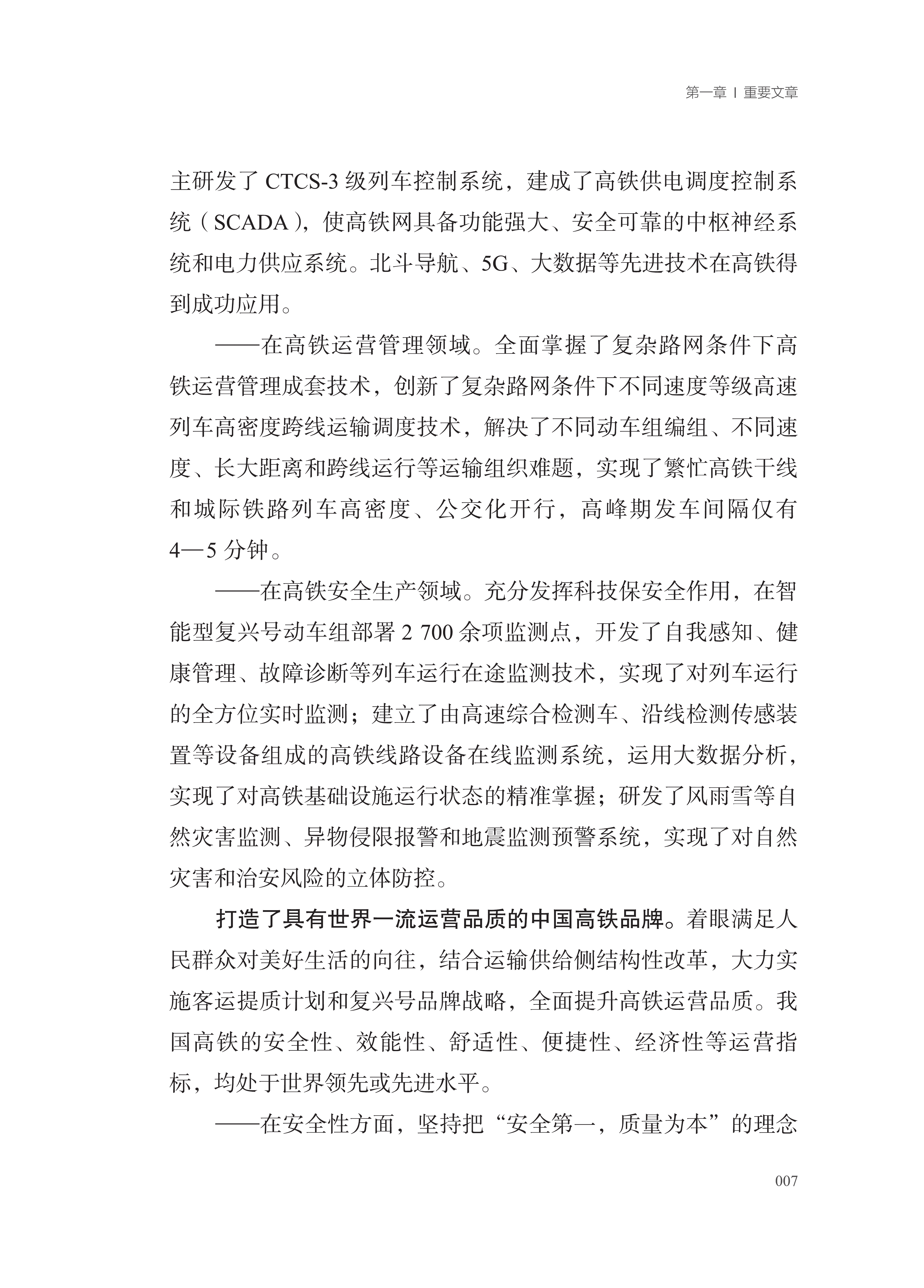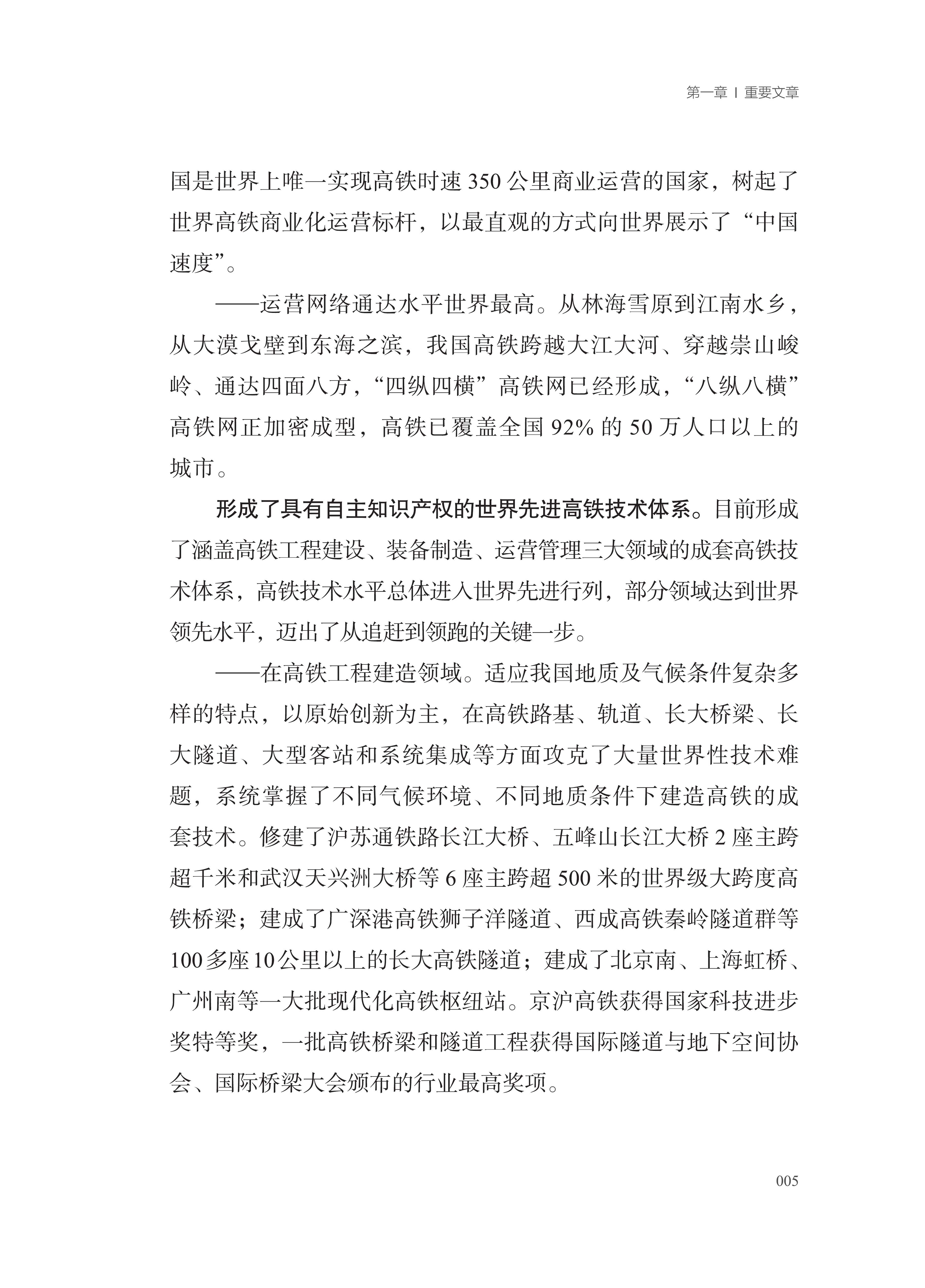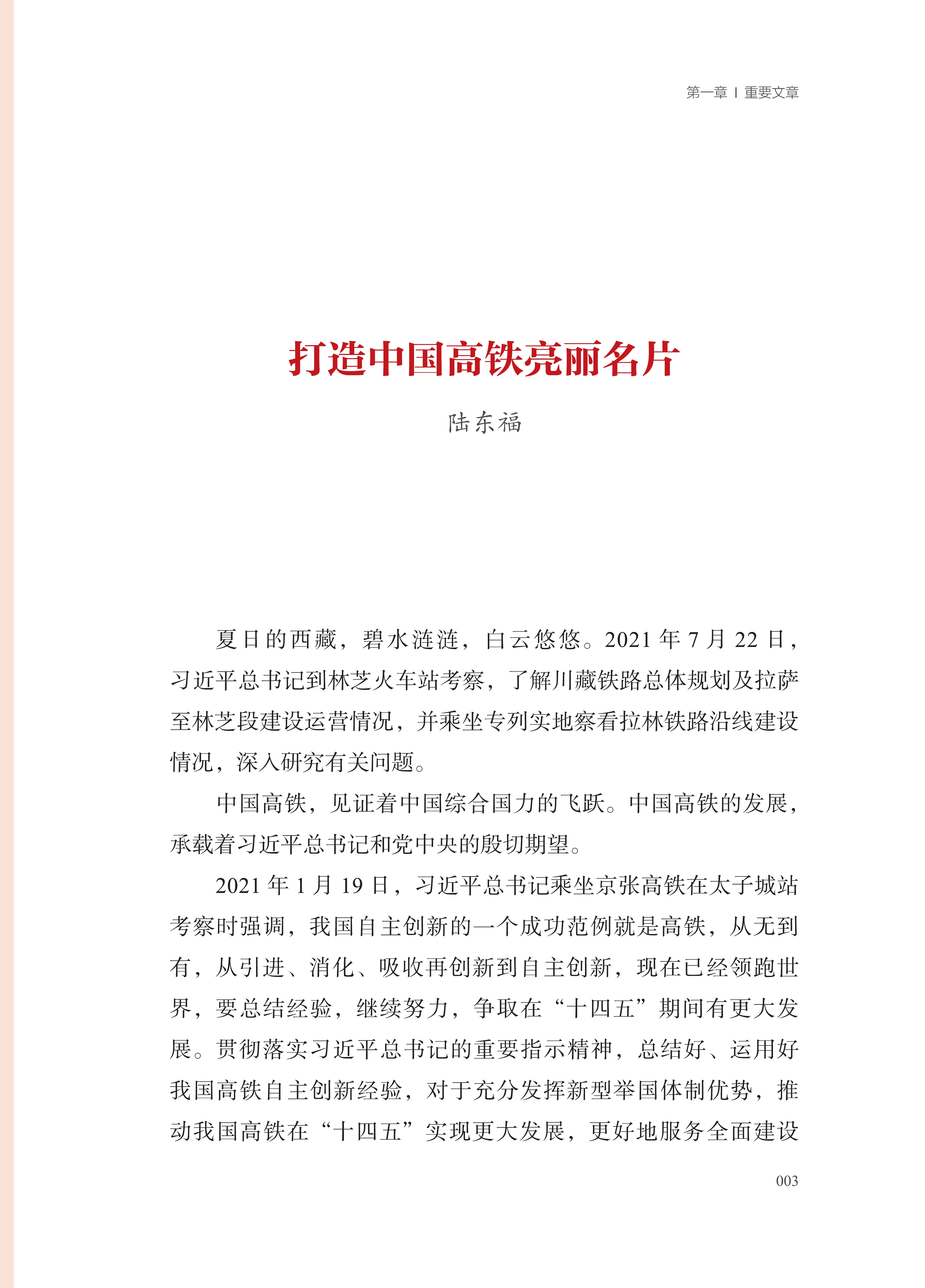 为贯彻落实习近平总书记重要指示精神,争取高铁在“十四五”期间有更大发展,中国国家铁路集团有限公司对我国高铁自主创新经验进行了全面总结,系统梳理了习近平总书记关于高铁建设发展和自主创新的重要论述、高铁自主创新经验总结成果、中央主要媒体对高铁的重要报道、高铁发展规划等内容。本书聚焦高铁建设规划、技术创新、运营管理、养护维修、服务经济社会发展等五个专题,对高铁自主创新经验做法等进行了全面总结。其中,中国国家铁路集团有限公司董事长、党组书记陆东福同志署名文章《打造中国高铁亮丽名片》对高铁自主创新经验进行了系统阐述,曾刊发于2021年8月在《求是》杂志。